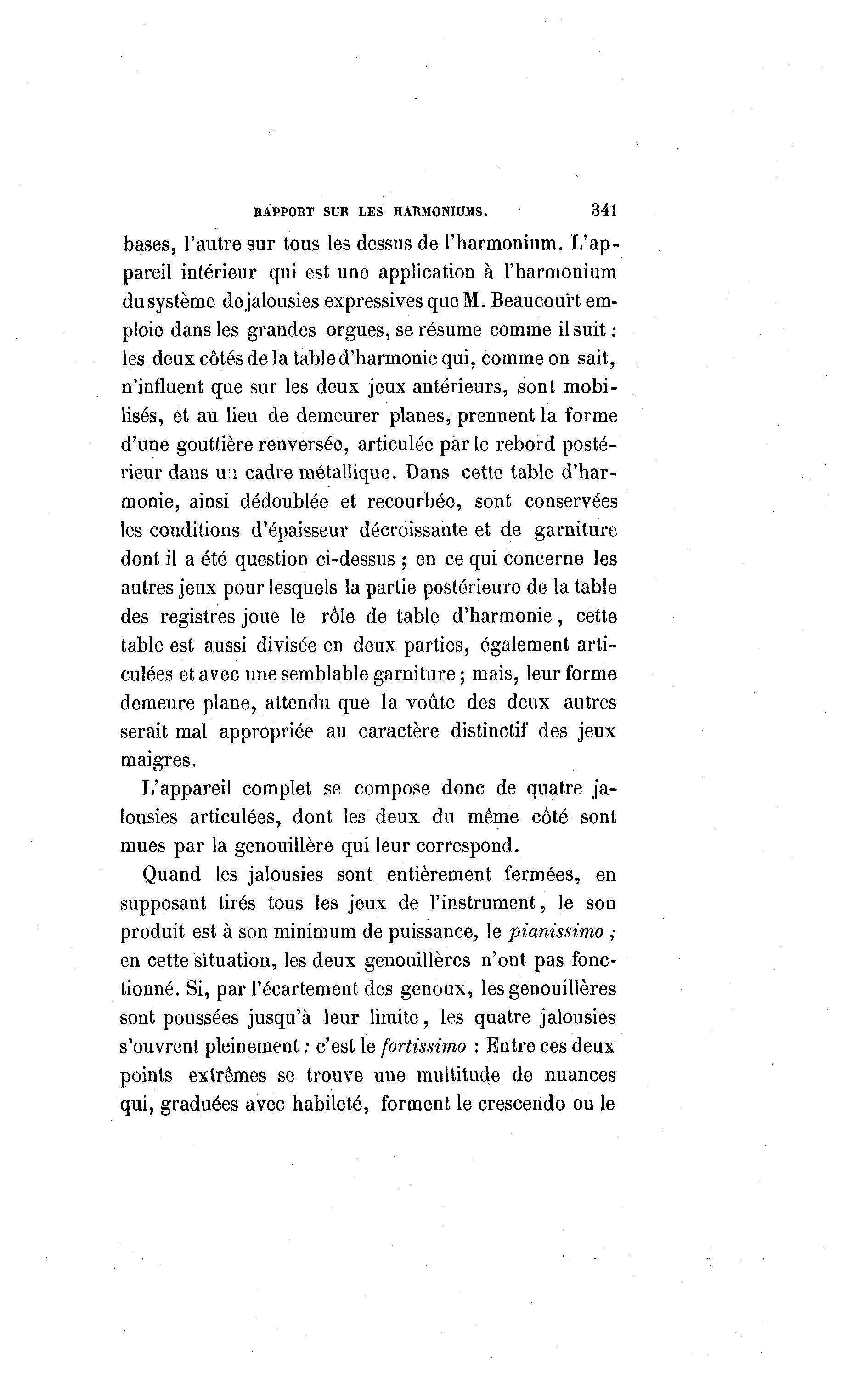 RAPPORT SUR LES HARMONIUMS. 341 bases, l'autre sur tous les dessus de l'harmonium. L'ap- pareil intérieur qui est une application à l'harmonium du système de jalousies expressives que M. Beaucourt em- ploie dans les grandes orgues, se résume comme il suit : les deux côtés de la table d'harmonie qui, comme on sait, n'influent que sur les deux jeux antérieurs, sont mobi- lisés, et au lieu de demeurer planes, prennent la forme d'une gouttière renversée, articulée par le rebord posté- rieur dans u:i cadre métallique. Dans cette table d'har- monie, ainsi dédoublée et recourbée, sont conservées les conditions d'épaisseur décroissante et de garniture dont il a été question ci-dessus ; en ce qui concerne les autres jeux pour lesquels la partie postérieure de la table des registres joue le rôle de table d'harmonie, cette table est aussi divisée en deux parties, également arti- culées et avec une semblable garniture ; mais, leur forme demeure plane, attendu que la voûte des deux autres serait mal appropriée au caractère distinctif des jeux maigres. L'appareil complet se compose donc de quatre ja- lousies articulées, dont les deux du même côté sont mues par la genouillère qui leur correspond. Quand les jalousies sont entièrement fermées, en supposant tirés tous les jeux de l'instrument, le son produit est à son minimum de puissance, le pianissimo ; en cette situation, les deux genouillères n'ont pas fonc- tionné. Si, par l'écartement des genoux, les genouillères sont poussées jusqu'à leur limite, les quatre jalousies s'ouvrent pleinement : c'est le fortissimo : Entre ces deux points extrêmes se trouve une multitude de nuances qui, graduées avec habileté, forment le crescendo ou le