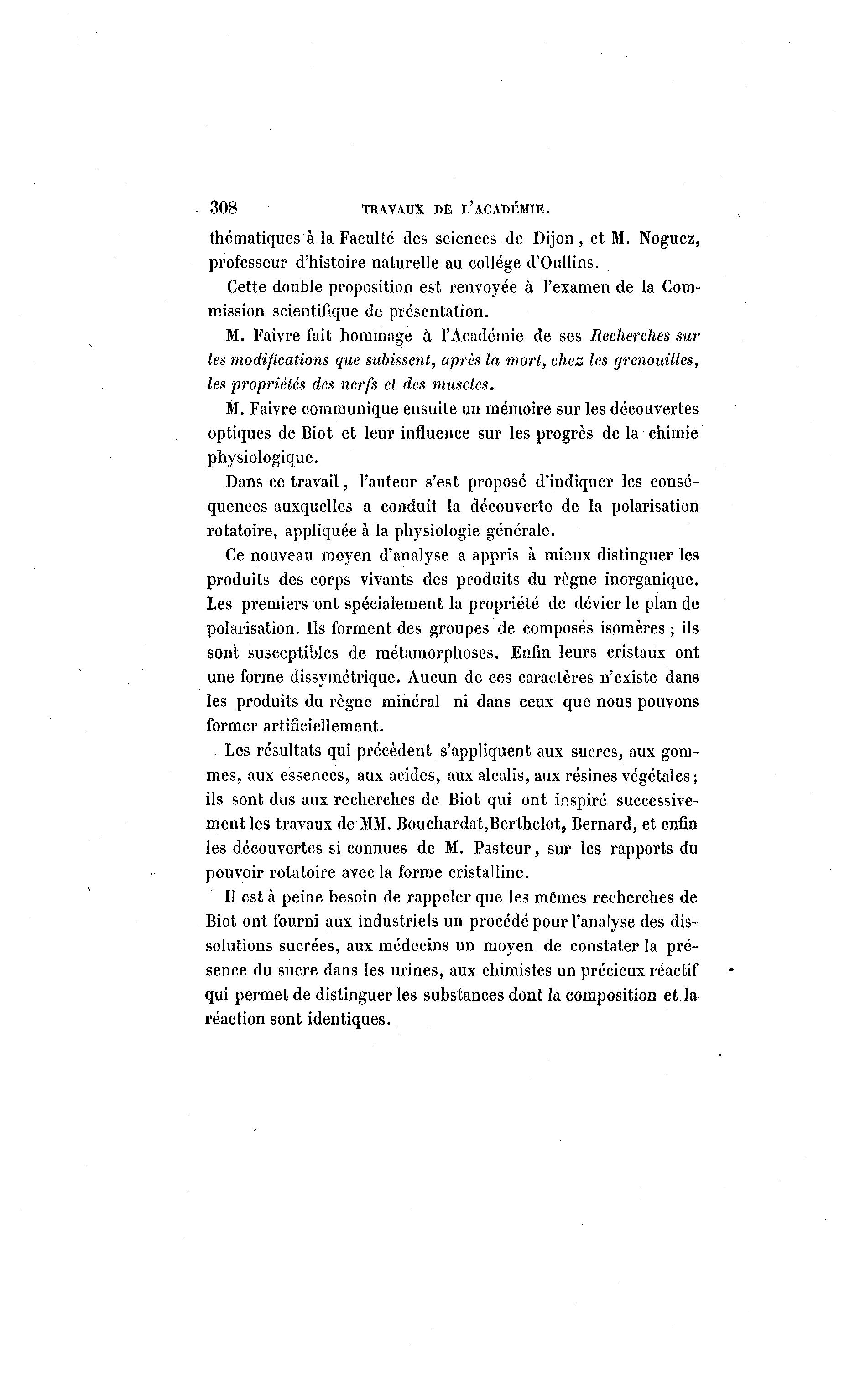 308 TRAVAUX DE h'ACADÉMIE. thématiques à la Faculté des sciences de Dijon , et M. Noguez, professeur d'histoire naturelle au collège d'Oullins. Cette double proposition est renvoyée à l'examen de la Com- mission scientifique de présentation. M. Faivre fait hommage à l'Académie de ses Recherches sur les modifications que subissent, après la mort, chez les grenouilles, les propriétés des nerfs el des muscles. M. Faivre communique ensuite un mémoire sur les découvertes optiques de Biot et leur influence sur les progrès de la chimie physiologique. Dans ce travail, l'auteur s'est proposé d'indiquer les consé- quences auxquelles a conduit la découverte de la polarisation rotatoire, appliquée à la physiologie générale. Ce nouveau moyen d'analyse a appris à mieux distinguer les produits des corps vivants des produits du règne inorganique. Les premiers ont spécialement la propriété de dévier le plan de polarisation. Ils forment des groupes de composés isomères ; ils sont susceptibles de métamorphoses. Enfin leurs cristaux ont une forme dissymétrique. Aucun de ces caractères n'existe dans les produits du règne minéral ni dans ceux que nous pouvons former artificiellement. Les résultats qui précèdent s'appliquent aux sucres, aux gom- mes, aux essences, aux acides, aux alcalis, aux résines végétales ; ils sont dus aux recherches de Biot qui ont inspiré successive- ment les travaux de MM. Bouchardat,Berthelot, Bernard, et enfin les découvertes si connues de M. Pasteur, sur les rapports du pouvoir rotatoire avec la forme cristalline. Il est à peine besoin de rappeler que les mêmes recherches de Biot ont fourni aux industriels un procédé pour l'analyse des dis- solutions sucrées, aux médecins un moyen de constater la pré- sence du sucre dans les urines, aux chimistes un précieux réactif qui permet de distinguer les substances dont la composition et la réaction sont identiques.