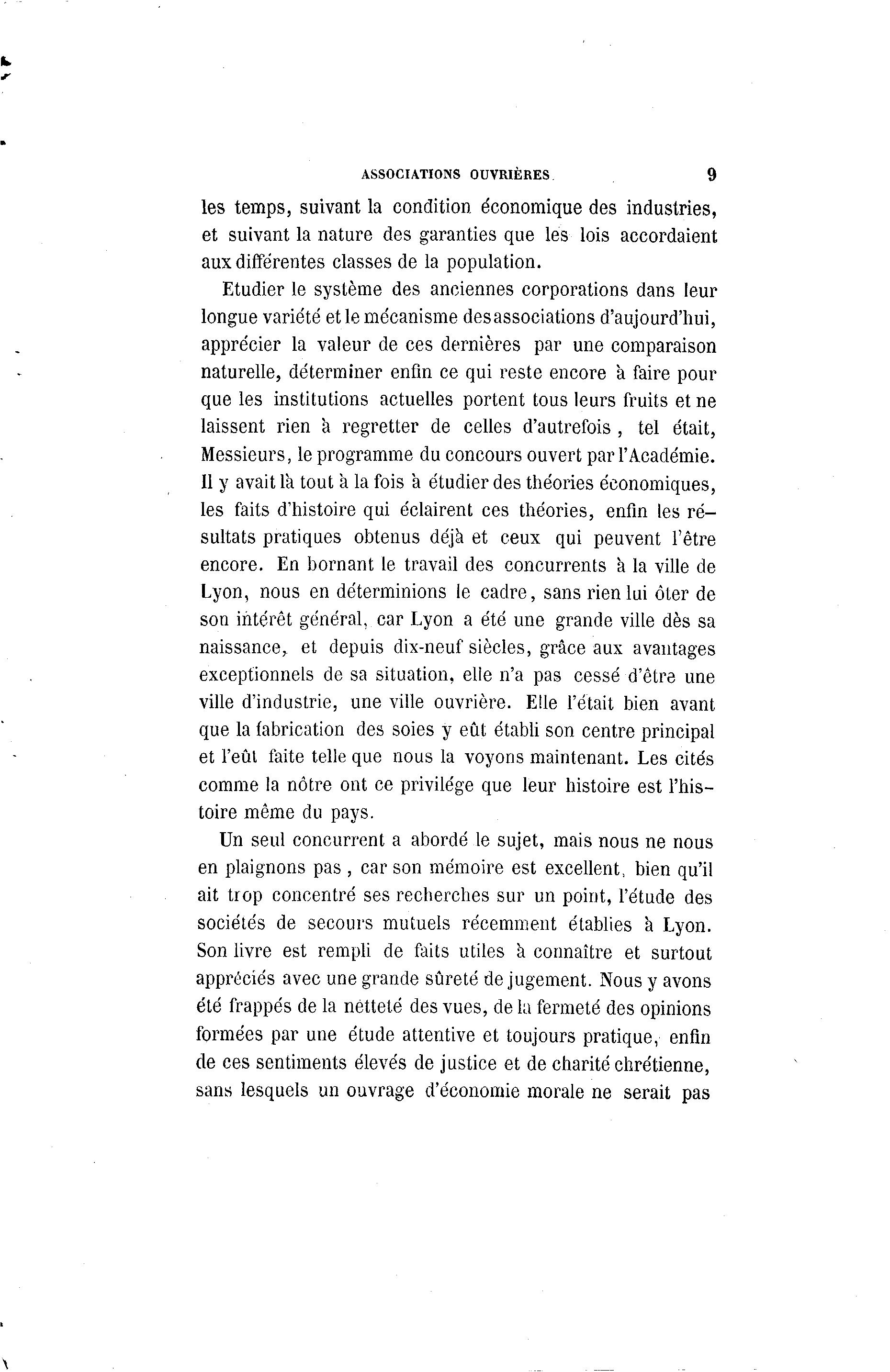 ASSOCIATIONS OUVRIÈRES 9 les temps, suivant la condition, économique des industries, et suivant la nature des garanties que les lois accordaient aux différentes classes de la population. Etudier le système des anciennes corporations dans leur longue variété et le mécanisme desassociations d'aujourd'hui, apprécier la valeur de ces dernières par une comparaison naturelle, déterminer enfin ce qui reste encore a faire pour que les institutions actuelles portent tous leurs fruits et ne laissent rien à regretter de celles d'autrefois, tel était, Messieurs, le programme du concours ouvert par l'Académie. 11 y avait la tout à la fois a étudier des théories économiques, les faits d'histoire qui éclairent ces théories, enfin les ré- sultats pratiques obtenus déjà et ceux qui peuvent l'être encore. En bornant le travail des concurrents a la ville de Lyon, nous en déterminions le cadre, sans rien lui ôter de son intérêt général, car Lyon a été une grande ville dès sa naissance,, et depuis dix-neuf siècles, grâce aux avantages exceptionnels de sa situation, elle n'a pas cessé d'être une ville d'industrie, une ville ouvrière. Elle l'était bien avant que la fabrication des soies y eût établi son centre principal et l'eût faite telle que nous la voyons maintenant. Les cités comme la nôtre ont ce privilège que leur histoire est l'his- toire même du pays. Un seul concurrent a abordé le sujet, mais nous ne nous en plaignons pas , car son mémoire est excellent, bien qu'il ait trop concentré ses recherches sur un point, l'étude des sociétés de secours mutuels récemment établies a Lyon. Son livre est rempli de faits utiles a connaître et surtout appréciés avec une grande sûreté de jugement. Nous y avons été frappés de la netteté des vues, de la fermeté des opinions formées par une étude attentive et toujours pratique, enfin de ces sentiments élevés de justice et de charité chrétienne, sans lesquels un ouvrage d'économie morale ne serait pas