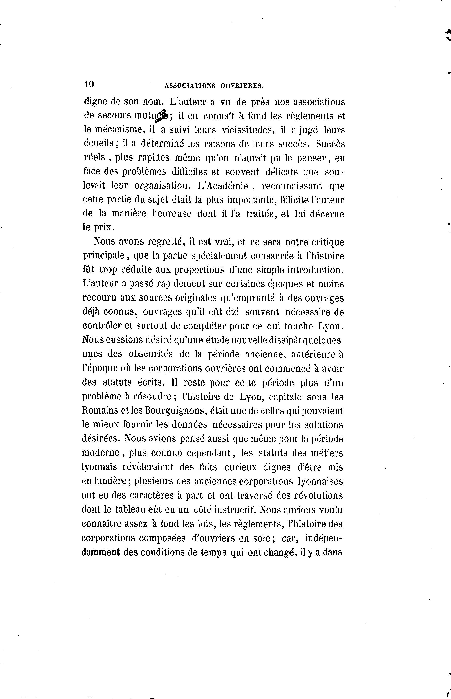 10 ASSOCIATIONS OUVRIÈRES. digne de son nom. L'auteur a vu de près nos associations de secours mutuel; il en connaît a fond les règlements et le mécanisme, il a suivi leurs vicissitudes, il a jugé leurs écueils ; il a déterminé les raisons de leurs succès. Succès réels , plus rapides même qu'on n'aurait pu le penser, en face des problèmes difficiles et souvent délicats que sou- levait leur organisation. L'Académie , reconnaissant que cette partie du sujet était la plus importante, félicite l'auteur de la manière heureuse dont il l'a traitée, et lui décerne le prix. Nous avons regretté, il est vrai, et ce sera notre critique principale, que la partie spécialement consacrée a l'histoire fût trop réduite aux proportions d'une simple introduction. L'auteur a passé rapidement sur certaines époques et moins recouru aux sources originales qu'emprunté a des ouvrages déjà connus, ouvrages qu'il eût été souvent nécessaire de contrôler et surtout de compléter pour ce qui touche Lyon. Nous eussions désiré qu'une étude nouvelle dissipâtquelques- unes des obscurités de la période ancienne, antérieure à l'époque où les corporations ouvrières ont commencé à avoir des statuts écrits. Il reste pour cette période plus d'un problème à résoudre ; l'histoire de Lyon, capitale sous les Romains et les Bourguignons, était une de celles qui pouvaient le mieux fournir les données nécessaires pour les solutions désirées. Nous avions pensé aussi que même pour la période moderne, plus connue cependant, les statuts des métiers lyonnais révéleraient des faits curieux dignes d'être mis en lumière; plusieurs des anciennes corporations lyonnaises ont eu des caractères à part et ont traversé des révolutions dont le tableau eût eu un côté instructif. Nous aurions voulu connaître assez a fond les lois, les règlements, l'histoire des corporations composées d'ouvriers en soie ; car, indépen- damment des conditions de temps qui ont changé, il y a dans