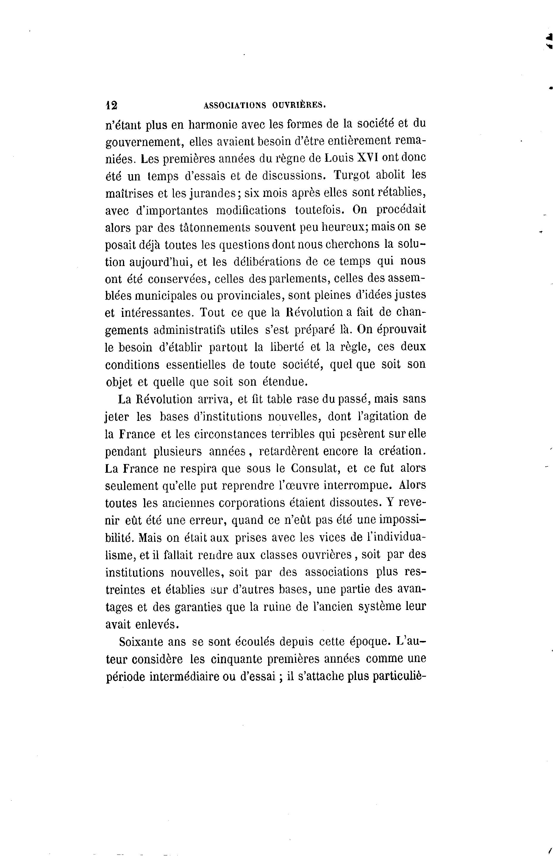 12 ASSOCIATIONS OUVRIÈRES. n'étant plus en harmonie avec les formes de la société et du gouvernement, elles avaient besoin d'être entièrement rema- niées. Les premières années du règne de Louis XVI ont donc été un temps d'essais et de discussions. Turgot abolit les maîtrises et les jurandes; six mois après elles sont rétablies, avec d'importantes modifications toutefois. On procédait alors par des tâtonnements souvent peu heureux; mais on se posait déjà toutes les questions dont nous cherchons la solu- tion aujourd'hui, et les délibérations de ce temps qui nous ont été conservées, celles des parlements, celles des assem- blées municipales ou provinciales, sont pleines d'idées justes et intéressantes. Tout ce que la Révolution a fait de chan- gements administratifs utiles s'est préparé la. On éprouvait le besoin d'établir partout la liberté et la règle, ces deux conditions essentielles de toute société, quel que soit son objet et quelle que soit son étendue. La Révolution arriva, et fit table rase du passé, mais sans jeter les bases d'institutions nouvelles, dont l'agitation de la France et les circonstances terribles qui pesèrent sur elle pendant plusieurs années, retardèrent encore la création. La France ne respira que sous le Consulat, et ce fut alors seulement qu'elle put reprendre l'œuvre interrompue. Alors toutes les anciennes corporations étaient dissoutes. Y reve- nir eût été une erreur, quand ce n'eût pas été une impossi- bilité. Mais on était aux prises avec les vices de l'individua- lisme, et il fallait rendre aux classes ouvrières, soit par des institutions nouvelles, soit par des associations plus res- treintes et établies sur d'autres bases, une partie des avan- tages et des garanties que la ruine de l'ancien système leur avait enlevés. Soixante ans se sont écoulés depuis cette époque. L'au- teur considère les cinquante premières années comme une période intermédiaire ou d'essai ; il s'attache plus particuliè-