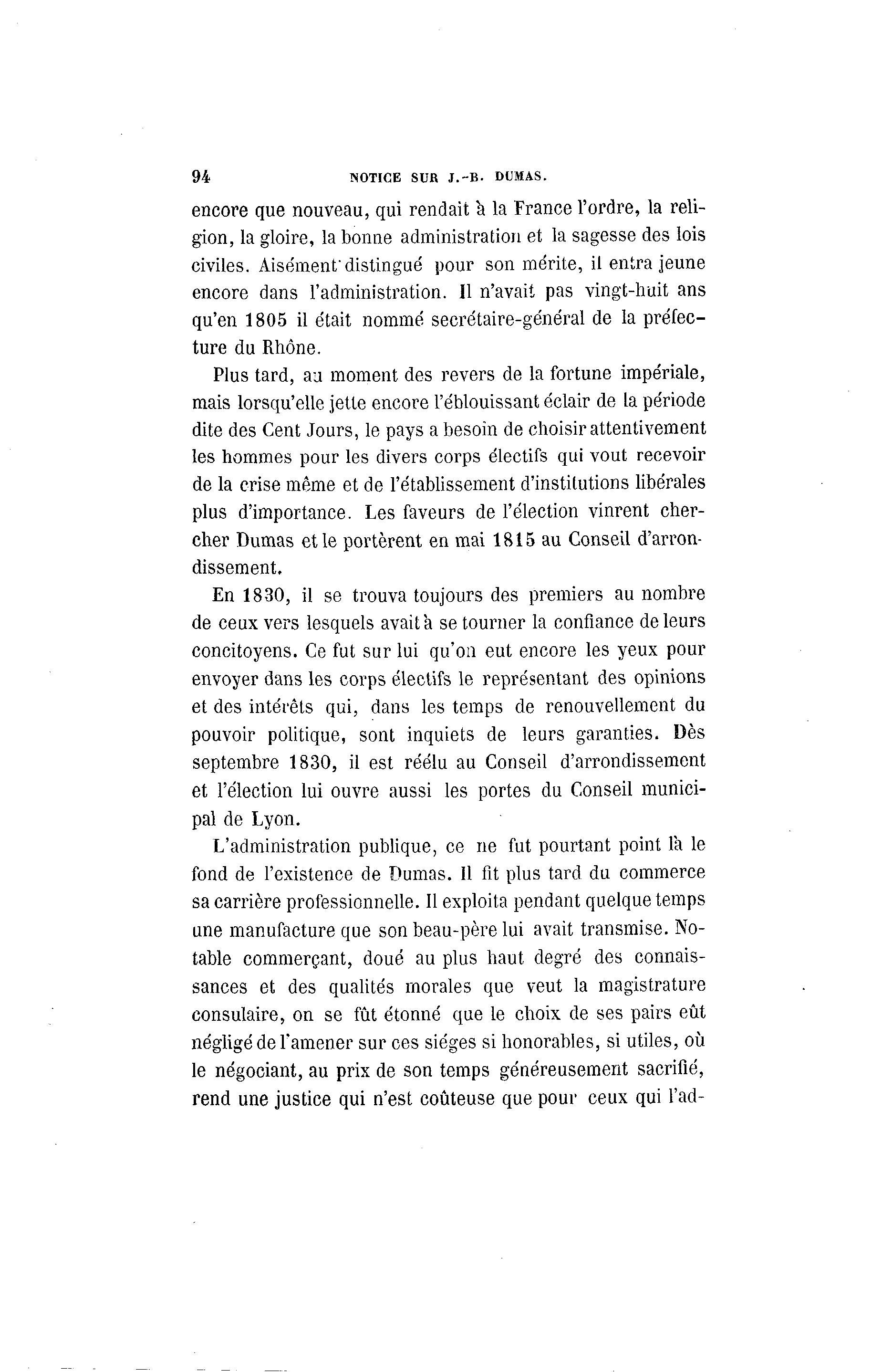94 NOTICE SUR J . - B . DUMAS. encore que nouveau, qui rendait à la France l'ordre, la reli- gion, la gloire, la bonne administration et la sagesse des lois civiles. Aisément'distingué pour son mérite, il entra jeune encore dans l'administration. Il n'avait pas vingt-huit ans qu'en 1805 il était nommé secrétaire-général de la préfec- ture du Rhône. Plus tard, au moment des revers de la fortune impériale, mais lorsqu'elle jette encore l'éblouissant éclair de la période dite des Cent Jours, le pays a besoin de choisir attentivement les hommes pour les divers corps électifs qui vout recevoir de la crise même et de l'établissement d'institutions libérales plus d'importance. Les faveurs de l'élection vinrent cher- cher Dumas et le portèrent en mai 1815 au Conseil d'arron- dissement. En 1830, il se trouva toujours des premiers au nombre de ceux vers lesquels avait à se tourner la confiance de leurs concitoyens. Ce fut sur lui qu'on eut encore les yeux pour envoyer dans les corps électifs le représentant des opinions et des intérêts qui, dans les temps de renouvellement du pouvoir politique, sont inquiets de leurs garanties. Dès septembre 1830, il est réélu au Conseil d'arrondissement et l'élection lui ouvre aussi les portes du Conseil munici- pal de Lyon. L'administration publique, ce ne fut pourtant point la le fond de l'existence de Dumas. Il fit plus tard du commerce sa carrière professionnelle. Il exploita pendant quelque temps une manufacture que son beau-père lui avait transmise. No- table commerçant, doué au plus haut degré des connais- sances et des qualités morales que veut la magistrature consulaire, on se fût étonné que le choix de ses pairs eût négligé de l'amener sur ces sièges si honorables, si utiles, où le négociant, au prix de son temps généreusement sacrifié, rend une justice qui n'est coûteuse que pour ceux qui l'ad-