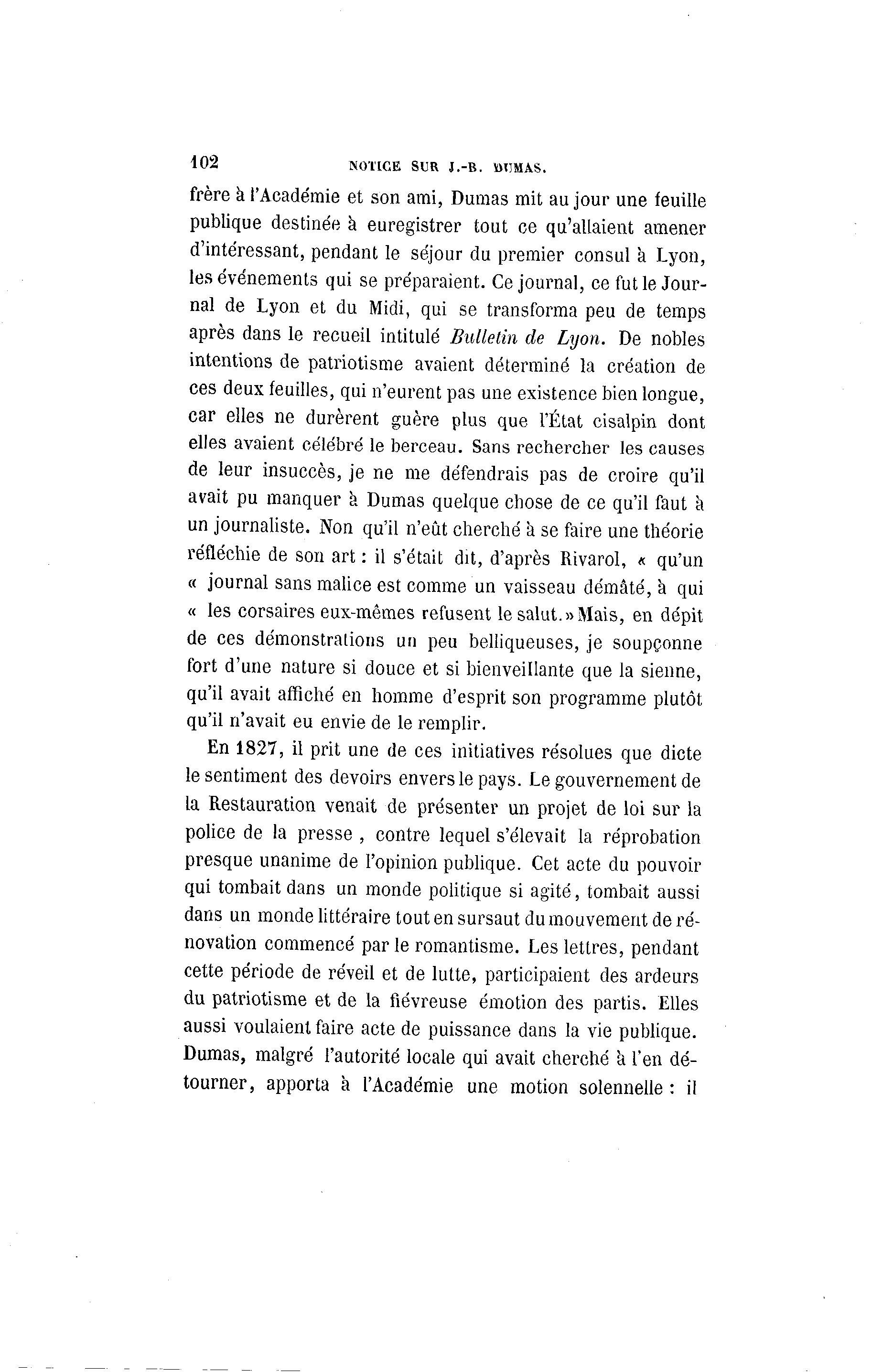 102 NOTICE SUR J.-B. BlIMAS. frère a l'Académie et son ami, Dumas mit au jour une feuille publique destinée à euregistrer tout ce qu'allaient amener d'intéressant, pendant le séjour du premier consul à Lyon, les événements qui se préparaient. Ce journal, ce fut le Jour- nal de Lyon et du Midi, qui se transforma peu de temps après dans le recueil intitulé Bulletin de Lyon. De nobles intentions de patriotisme avaient déterminé la création de ces deux feuilles, qui n'eurent pas une existence bien longue, car elles ne durèrent guère plus que l'État cisalpin dont elles avaient célébré le berceau. Sans rechercher les causes de leur insuccès, je ne me défendrais pas de croire qu'il avait pu manquer à Dumas quelque chose de ce qu'il faut à un journaliste. Non qu'il n'eût cherché a se faire une théorie réfléchie de son art : il s'était dit, d'après Rivarol, « qu'un « journal sans malice est comme un vaisseau démâté, à qui « les corsaires eux-mêmes refusent le salut.«Mais, en dépit de ces démonstrations un peu belliqueuses, je soupçonne fort d'une nature si douce et si bienveillante que la sienne, qu'il avait affiché en homme d'esprit son programme plutôt qu'il n'avait eu envie de le remplir. En 1827, il prit une de ces initiatives résolues que dicte le sentiment des devoirs envers le pays. Le gouvernement de la Restauration venait de présenter un projet de loi sur la police de la presse , contre lequel s'élevait la réprobation presque unanime de l'opinion publique. Cet acte du pouvoir qui tombait dans un monde politique si agité, tombait aussi dans un monde littéraire tout en sursaut du mouvement de ré- novation commencé par le romantisme. Les lettres, pendant cette période de réveil et de lutte, participaient des ardeurs du patriotisme et de la fiévreuse émotion des partis. Elles aussi voulaient faire acte de puissance dans la vie publique. Dumas, malgré l'autorité locale qui avait cherché a l'en dé- tourner, apporta à l'Académie une motion solennelle : il