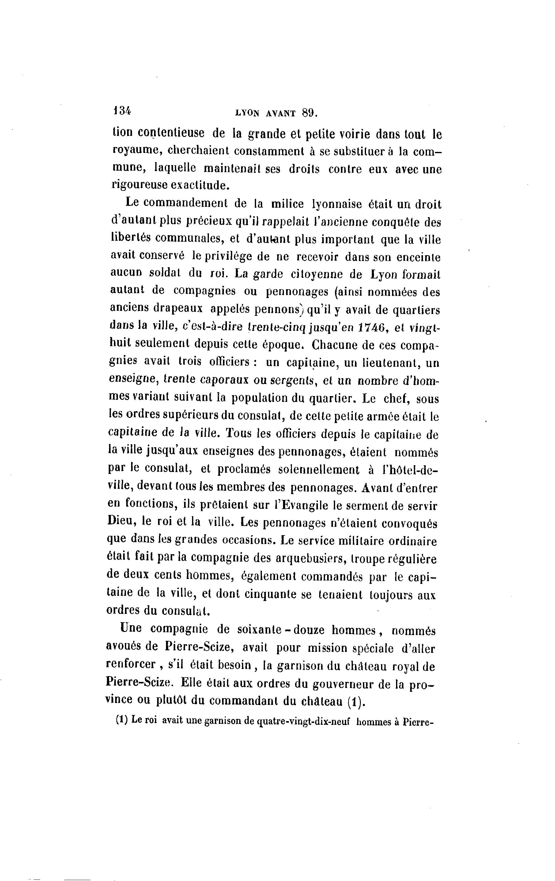 134 LYON AVANT 89. lion conlenlieuse de la grande et petite voirie dans tout le royaume, cherchaient constamment à se substituer à la com- mune, laquelle maintenait ses droits contre eux avec une rigoureuse exactitude. Le commandement de la milice lyonnaise était un droit d'autant plus précieux qu'il rappelait l'ancienne conquête des libertés communales, et d'autant plus important que la ville avait conservé le privilège de ne recevoir dans son enceinte aucun soldat du roi. La garde citoyenne de Lyon formait autant de compagnies ou pennonages (ainsi nommées des anciens drapeaux appelés pennons) qu'il y avait de quartiers dans la ville, c'est-à -dire trenle-cinq jusqu'en 1746, et vingt- huit seulement depuis cette époque. Chacune de ces compa- gnies avait trois officiers : un capitaine, un lieutenant, un enseigne, trente caporaux ou sergents, et un nombre d'hom- mes variant suivant la population du quartier. Le chef, sous les ordres supérieurs du consulat, de celte petite armée était le capitaine de Ja ville. Tous les officiers depuis le capitaine de la ville jusqu'aux enseignes des pennonages, étaient nommés par le consulat, et proclamés solennellement à l'hôtel-de- ville, devant tous les membres des pennonages. Avant d'entrer en fonctions, ils prêtaient sur l'Evangile le serment de servir Dieu, le roi et la ville. Les pennonages n'étaient convoqués que dans les grandes occasions. Le service militaire ordinaire était fait par la compagnie des arquebusiers, Iroupe régulière de deux cents hommes, également commandés par le capi- taine de la ville, et dont cinquante se tenaient toujours aux ordres du consulat. Une compagnie de soixante-douze hommes, nommés avoués de Pierre-Scize, avait pour mission spéciale d'aller renforcer , s'il était besoin, la garnison du château royal de Pierre-Scize. Elle était aux ordres du gouverneur de la pro- vince ou plutôt du commandant du château (1). (1) Le roi avait une garnison de quatre-vingt-dix-neuf hommes à Pierre-