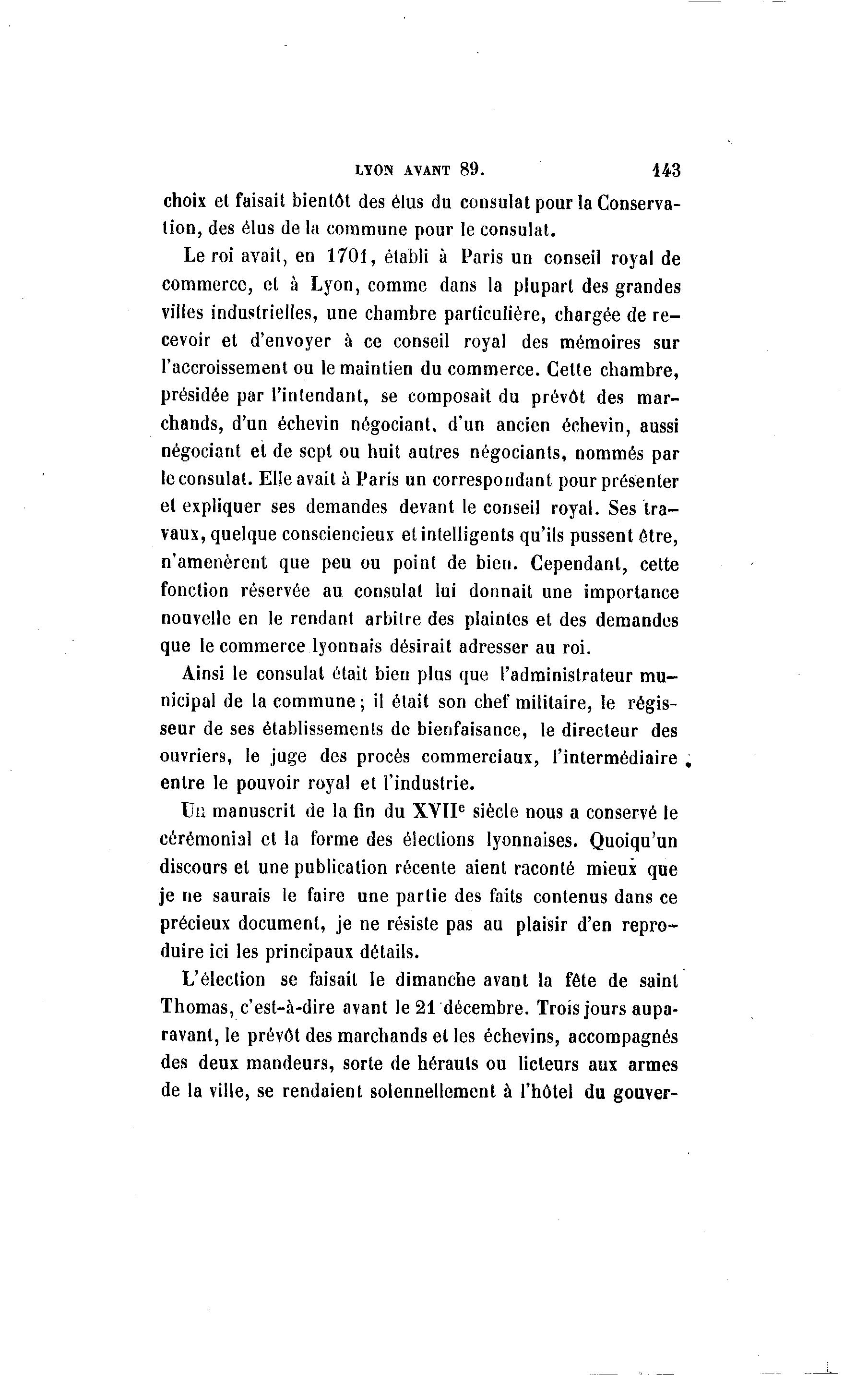 LYON AVAKT 8 9 . 143 choix et faisait bientôt des élus du consulat pour la Conserva- lion, des élus de la commune pour le consulat. Le roi avait, en 1701, établi à Paris un conseil royal de commerce, et à Lyon, comme dans la plupart des grandes villes industrielles, une chambre particulière, chargée de re- cevoir et d'envoyer à ce conseil royal des mémoires sur l'accroissement ou le maintien du commerce. Celte chambre, présidée par l'intendant, se composait du prévôt des mar- chands, d'un échevin négociant, d'un ancien échevin, aussi négociant et de sept ou huit autres négociants, nommés par le consulat. Elle avait à Paris un correspondant pour présenter et expliquer ses demandes devant le conseil royal. Ses Ira- vaux, quelque consciencieux et intelligents qu'ils pussent être, n'amenèrent que peu ou point de bien. Cependant, cette fonction réservée au consulat lui donnait une importance nouvelle en le rendant arbitre des plaintes et des demandes que le commerce lyonnais désirait adresser au roi. Ainsi le consulat était bien plus que l'administrateur mu- nicipal de la commune ; il était son chef militaire, le régis- seur de ses établissements de bienfaisance, le directeur des ouvriers, le juge des procès commerciaux, l'intermédiaire . entre le pouvoir royal et l'industrie. Un manuscrit de la fin du XVIIe siècle nous a conservé le cérémonial et la forme des élections lyonnaises. Quoiqu'un discours et une publication récente aient raconté mieux que je ne saurais le faire une partie des faits contenus dans ce précieux document, je ne résiste pas au plaisir d'en repro- duire ici les principaux détails. L'élection se faisait le dimanche avant la fête de saint Thomas, c'est-à -dire avant le 21 décembre. Trois jours aupa- ravant, le prévôt des marchands et les échevins, accompagnés des deux mandeurs, sorte de hérauts ou licteurs aux armes de la ville, se rendaient solennellement à l'hôtel du gouver-