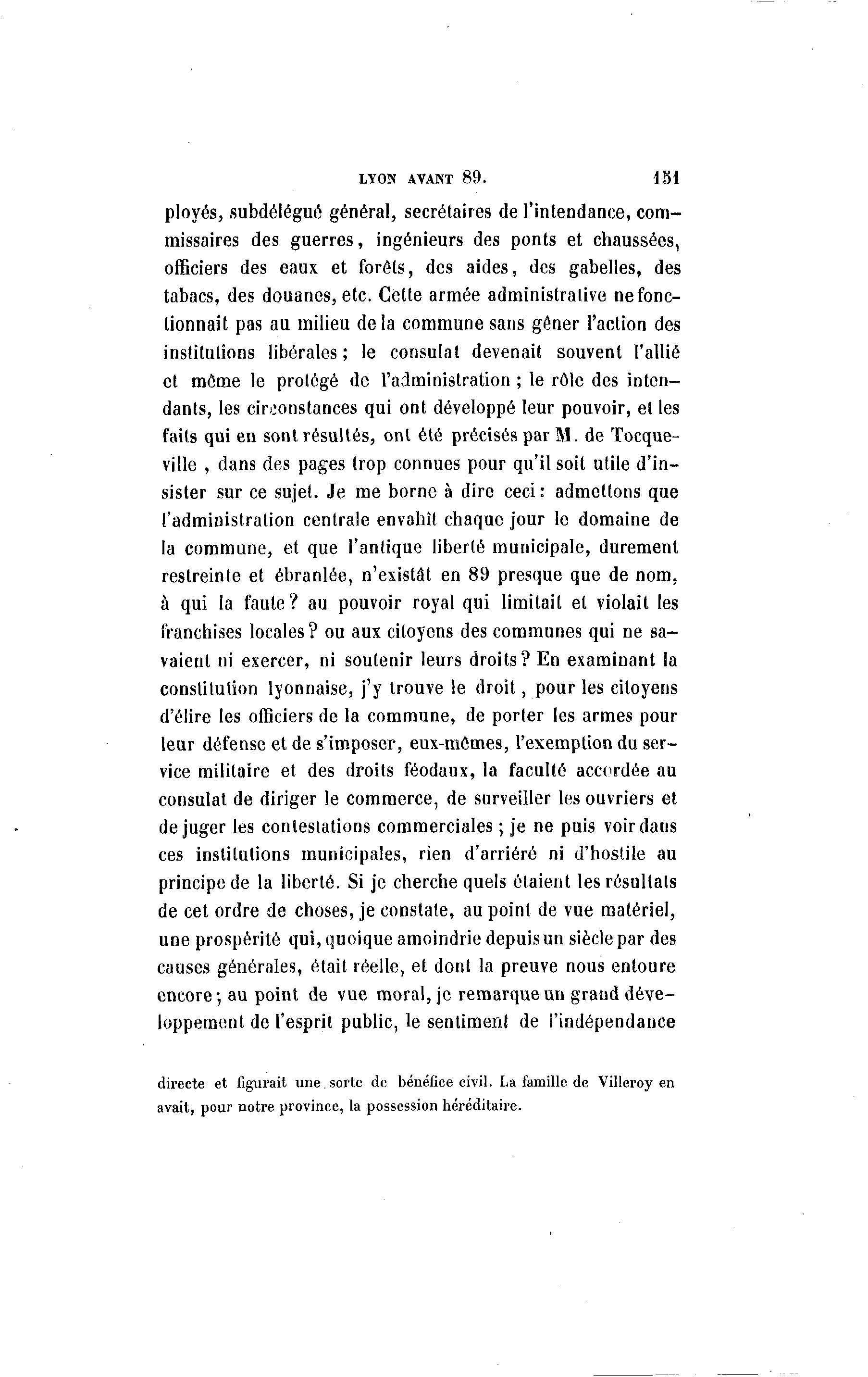 LYON AVANT 8 9 . 131 ployés, subdélégué général, secrétaires de l'intendance, com- missaires des guerres, ingénieurs des ponts et chaussées, officiers des eaux et forôls, des aides, des gabelles, des tabacs, des douanes, etc. Cette armée administrative ne fonc- tionnait pas au milieu delà commune sans gêner l'action des institutions libérales; le consulat devenait souvent l'allié et même le protégé de l'administration ; le rôle des inten- dants, les circonstances qui ont développé leur pouvoir, et les faits qui en sont résultés, ont été précisés par M. de Tocque- ville , dans des pages trop connues pour qu'il soit utile d'in- sister sur ce sujet. Je me borne à dire ceci : admettons que l'administration centrale envahît chaque jour le domaine de la commune, et que l'antique liberté municipale, durement restreinte et ébranlée, n'existât en 89 presque que de nom, à qui la faute? au pouvoir royal qui limitait et violait les franchises locales ? ou aux citoyens des communes qui ne sa- vaient ni exercer, ni soutenir leurs droits? En examinant la constitution lyonnaise, j'y trouve le droit, pour les citoyens d'élire les officiers de la commune, de porter les armes pour leur défense et de s'imposer, eux-mêmes, l'exemption du ser- vice militaire et des droits féodaux, la faculté accordée au consulat de diriger le commerce, de surveiller les ouvriers et déjuger les contestations commerciales ; je ne puis voir dans ces institutions municipales, rien d'arriéré ni d'hostile au principe de la liberté. Si je cherche quels étaient les résultais de cet ordre de choses, je constate, au point de vue matériel, une prospérité qui, quoique amoindrie depuis un siècle par des causes générales, était réelle, et dont la preuve nous entoure encore; au point de vue moral, je remarque un grand déve- loppement de l'esprit public, le sentiment de l'indépendance directe et figurait une sorte de bénéfice civil. La famille de Villeroy en avait, pour notre province, la possession héréditaire.
