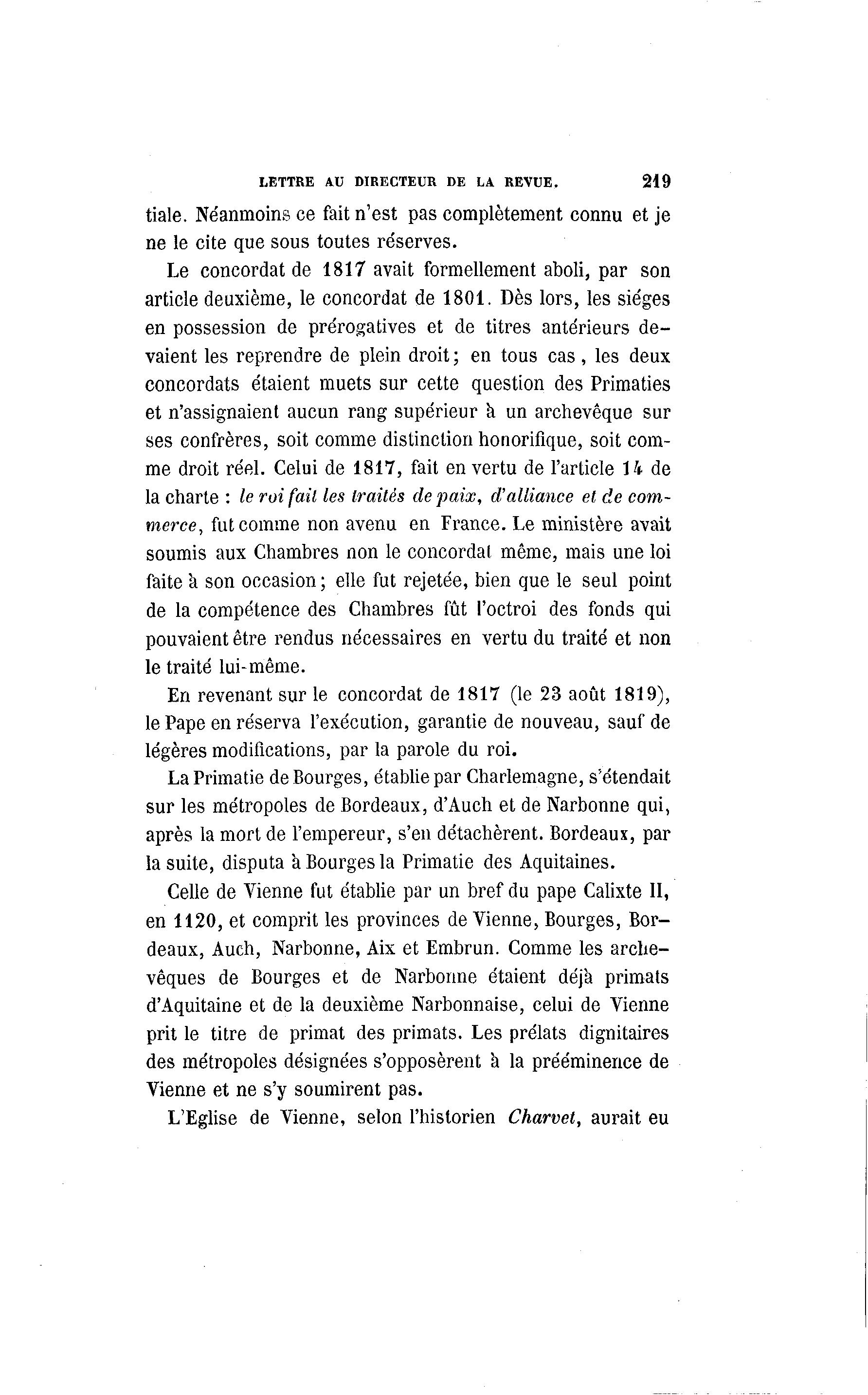 LETTRE AU DIRECTEUR DE LA REVUE. 219 tiale. Néanmoins ce fait n'est pas complètement connu et je ne le cite que sous toutes réserves. Le concordat de 1817 avait formellement aboli, par son article deuxième, le concordat de 1801. Dès lors, les sièges en possession de prérogatives et de titres antérieurs de- vaient les reprendre de plein droit ; en tous cas, les deux concordats étaient muets sur cette question des Primaties et n'assignaient aucun rang supérieur à un archevêque sur ses confrères, soit comme distinction honorifique, soit com- me droit réel. Celui de 1817, fait en vertu de l'article \h de la charte : le roi fait les traités de paix, d'alliance et de com- merce, fut comme non avenu en France. Le ministère avait soumis aux Chambres non le concordai même, mais une loi faite a son occasion ; elle fut rejetée, bien que le seul point de la compétence des Chambres fût l'octroi des fonds qui pouvaient être rendus nécessaires en vertu du traité et non le traité lui-même. En revenant sur le concordat de 1817 (le 23 août 1819), le Pape en réserva l'exécution, garantie de nouveau, sauf de légères modifications, par la parole du roi. LaPrimatie de Bourges, établie par Charlemagne, s'étendait sur les métropoles de Bordeaux, d'Auch et de Narbonne qui, après la mort de l'empereur, s'en détachèrent. Bordeaux, par la suite, disputa à Bourges la Primatie des Aquitaines. Celle de Vienne fut établie par un bref du pape Calixte II, en 1120, et comprit les provinces de Vienne, Bourges, Bor- deaux, Auch, Narbonne, Aix et Embrun. Comme les arche- vêques de Bourges et de Narbonne étaient déjà primats d'Aquitaine et de la deuxième Narbonnaise, celui de Vienne prit le titre de primat des primats. Les prélats dignitaires des métropoles désignées s'opposèrent à la prééminence de Vienne et ne s'y soumirent pas. L'Eglise de Vienne, selon l'historien Charvet, aurait eu