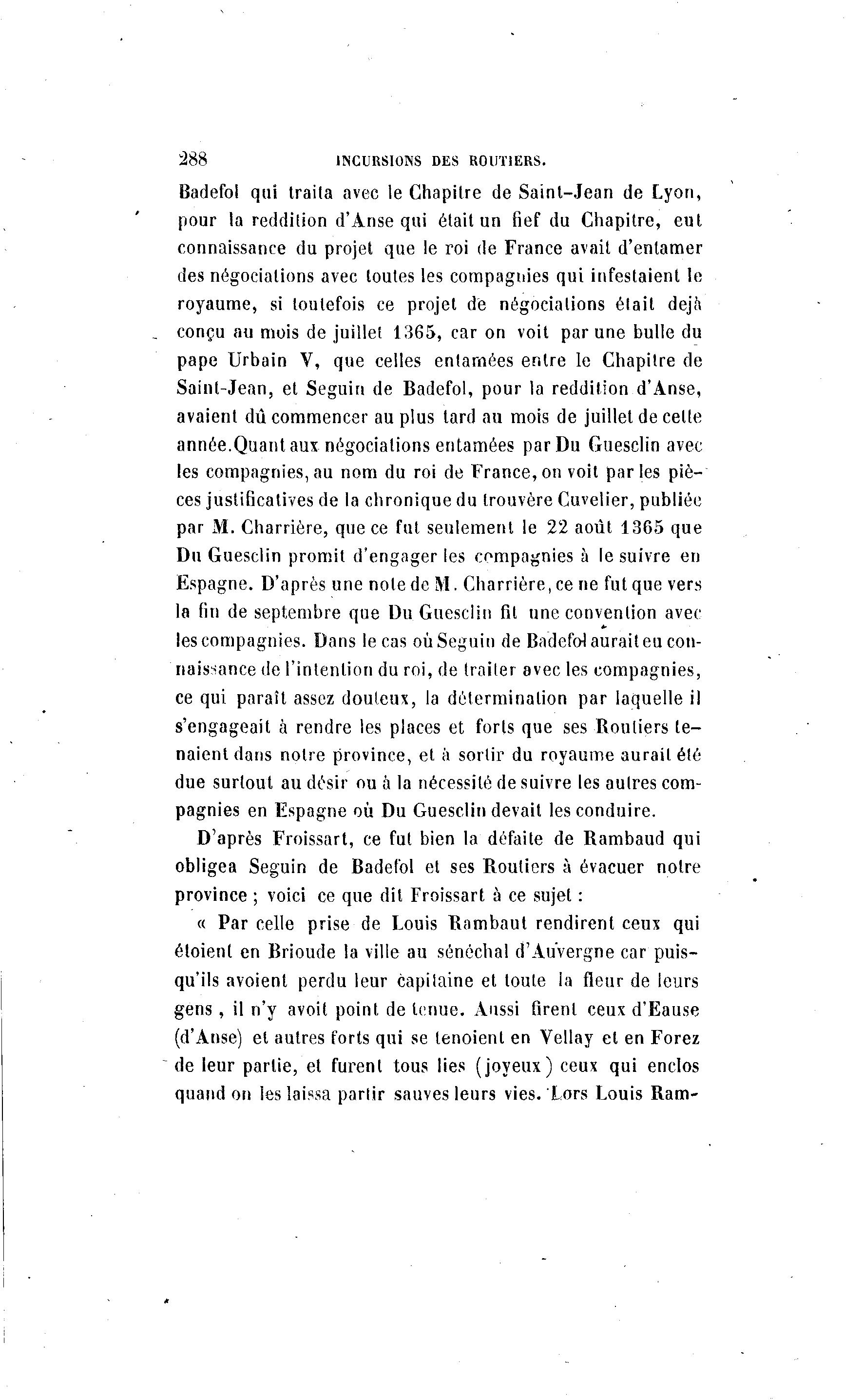 288 INCURSIONS DES ROUTIERS. Badefol qui traita avec le Chapitre de Saint-Jean de Lyon, pour la reddition d'Anse qui était un fief du Chapitre, eut connaissance du projet que le roi de France avait d'entamer des négociations avec toutes les compagnies qui infestaient le royaume, si toutefois ce projet de négociations était déjà conçu au mois de juillet 1365, car on voit par une bulle du pape Urbain V, que celles entamées entre le Chapitre de Saint-Jean, et Seguin de Badefol, pour la reddition d'Anse, avaient dû commencer au plus tard au mois de juillet de cette année.Quant aux négociations entamées par Du Guesciin avec les compagnies,au nom du roi de France,on voit parles piè- ces justificatives de la chronique du trouvère Cuvelier, publiée par M. Charrière, que ce fut seulement le 22 août 1365 que Du Guesciin promit d'engager les compagnies à le suivre en Espagne. D'après une note de M. Charrière, ce ne fut que vers la fin de septembre que Du Guesciin fit une convention avec les compagnies. Dans le cas où Seguin de Badefol aurait eu con- naissance de l'intention du roi, de traiter avec les compagnies, ce qui paraît assez douteux, la détermination par laquelle il s'engageait à rendre les places et forts que ses Routiers te- naient dans notre province, et à sortir du royaume aurait été due surtout au désir ou à la nécessité de suivre les autres com- pagnies en Espagne où Du Guesciin devait les conduire. D'après Froissart, ce fut bien la défaite de Rambaud qui obligea Seguin de Badefol et ses Routiers à évacuer notre province ; voici ce que dit Froissart à ce sujet : « Par celle prise de Louis Rambaul rendirent ceux qui étoient en Brioude la ville au sénéchal d'Auvergne car puis- qu'ils avoient perdu leur capitaine et toute la fleur de leurs gens, il n'y avoit point de tenue. Aussi firent ceux d'Eause (d'Anse) et autres forts qui se lenoient en Vellay et en Forez de leur partie, et furent tous lies (joyeux) ceux qui enclos quand on les laissa partir sauves leurs vies. Lors Louis Ram-