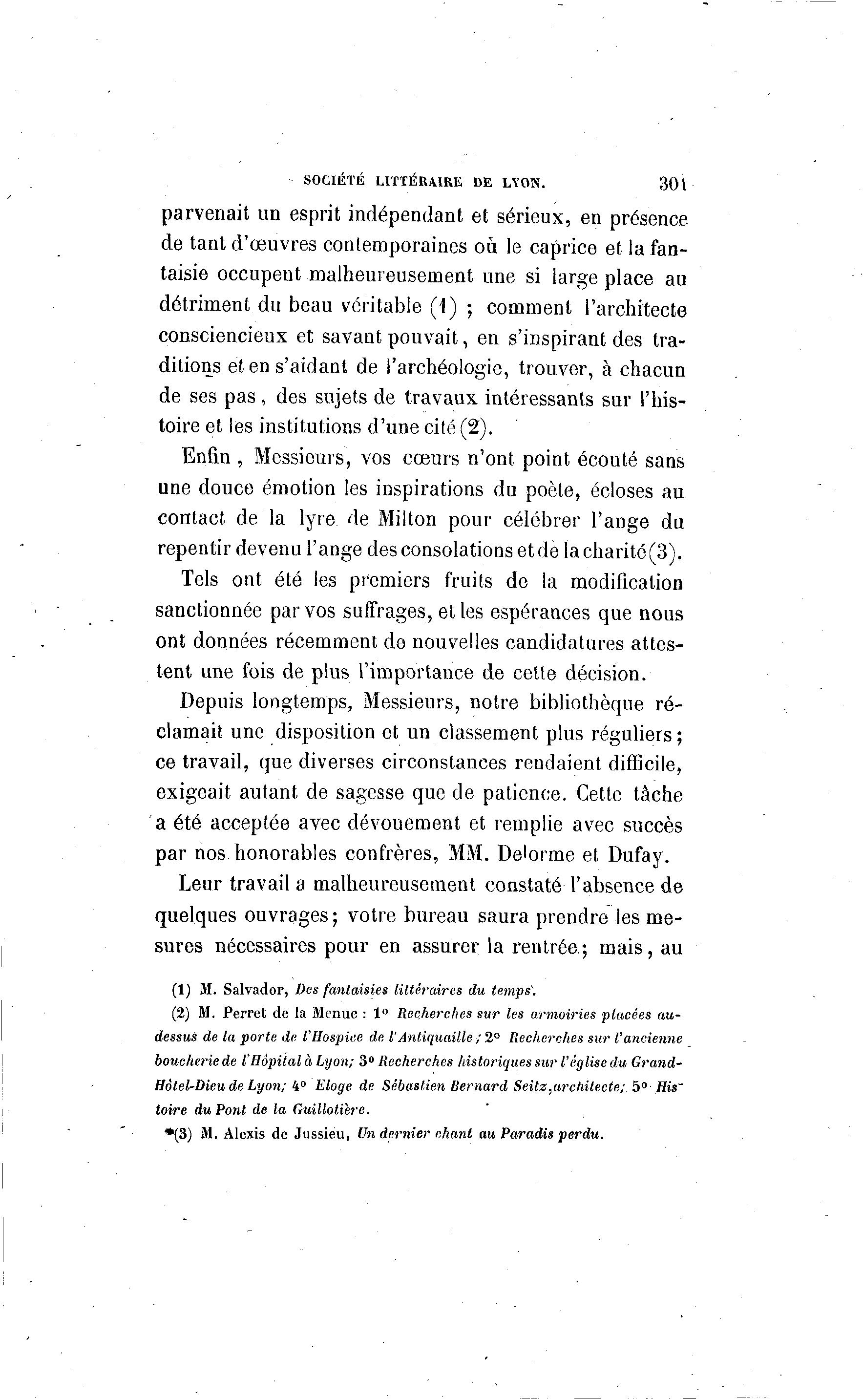 SOCIÉTÉ LITTÉRAIRE DE LYON. 301 parvenait un esprit indépendant et sérieux, en présence de tant d'oeuvres contemporaines où le caprice et la fan- taisie occupent malheureusement une si large place au détriment du beau véritable (1) ; comment l'architecte consciencieux et savant pouvait, en s'inspirant des tra- ditions et en s'aidant de l'archéologie, trouver, à chacun de ses pas, des sujets de travaux intéressants sur l'his- toire et les institutions d'une cité (2). ' Enfin , Messieurs, vos cœurs n'ont point écouté sans une douce émotion les inspirations du poète, écloses au contact de la lyre de Milton pour célébrer l'ange du repentir devenu l'ange des consolations et de la charité (3). Tels ont été les premiers fruits de la modification sanctionnée par vos suffrages, et les espérances que nous ont données récemment de nouvelles candidatures attes- tent une fois de plus l'importance de cette décision. Depuis longtemps, Messieurs, notre bibliothèque ré- clamait une disposition et un classement plus réguliers; ce travail, que diverses circonstances rendaient difficile, exigeait autant de sagesse que de patience. Cette tâche a été acceptée avec dévouement et remplie avec succès par nos honorables confrères, MM. Delorme et Dufay. Leur travail a malheureusement constaté l'absence de quelques ouvrages; votre bureau saura prendre les me- sures nécessaires pour en assurer la rentrée; mais, au (1) M. Salvador, Des fantaisies littéraires du temps". (2) M. Perret de la Menue : 1° Recherches sur les armoiries placées au- dessus de la porte de l'Hospice de VAntiquaille ; 2° Recherches stir l'ancienne boucherie de l'Hôpital à Lyon; 3° Recherches historiques sur l'église du Grand- Hôtel-Dieu de Lyon; 4° Eloge de Sébastien Bernard Seitz,architecte; 5° His~ toire du Pont de la Guillotière. *(3) M. Alexis de Jussieu, Un dernier chant au Paradis perdu.