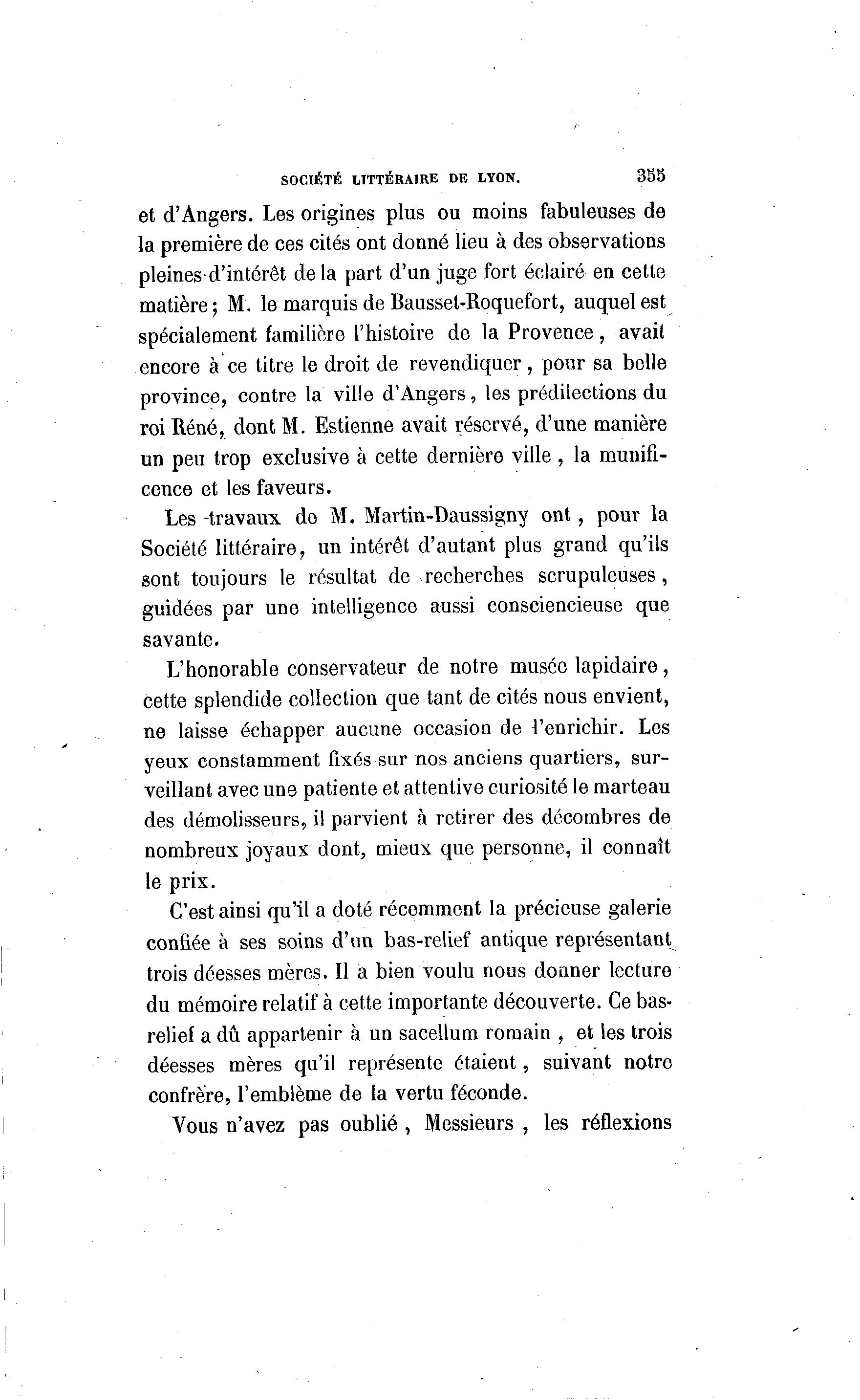 SOCIÉTÉ LITTÉRAIRE DE LYON. 335 et d'Angers. Les origines plus ou moins fabuleuses de la première de ces cités ont donné lieu à des observations pleines-d'intérêt de la part d'un juge fort éclairé en cette matière ; M. le marquis de Bausset-Roquefort, auquel est spécialement familière l'histoire de la Provence, avait encore à ce titre le droit de revendiquer, pour sa belle province, contre la ville d'Angers, les prédilections du roi René, dont M. Estienne avait réservé, d'une manière un peu trop exclusive à cette dernière ville , la munifi- cence et les faveurs. Les -travaux, de M. Martin-Daussigny ont, pour la Société littéraire, un intérêt d'autant plus grand qu'ils sont toujours le résultat de recherches scrupuleuses, guidées par une intelligence aussi consciencieuse que savante. L'honorable conservateur de notre musée lapidaire, cette splendide collection que tant de cités nous envient, ne laisse échapper aucune occasion de l'enrichir. Les yeux constamment fixés sur nos anciens quartiers, sur- veillant avec une patiente et attentive curiosité le marteau des démolisseurs, il parvient à retirer des décombres de nombreux joyaux dont, mieux que personne, il connaît le prix. C'est ainsi qu'il a doté récemment la précieuse galerie confiée à ses soins d'un bas-relief antique représentant trois déesses mères. Il a bien voulu nous donner lecture du mémoire relatif à cette importante découverte. Ce bas- relief a dû appartenir à un sacellum romain , et les trois déesses mères qu'il représente étaient, suivant notre confrère, l'emblème de la vertu féconde. Vous n'avez pas oublié , Messieurs , les réflexions