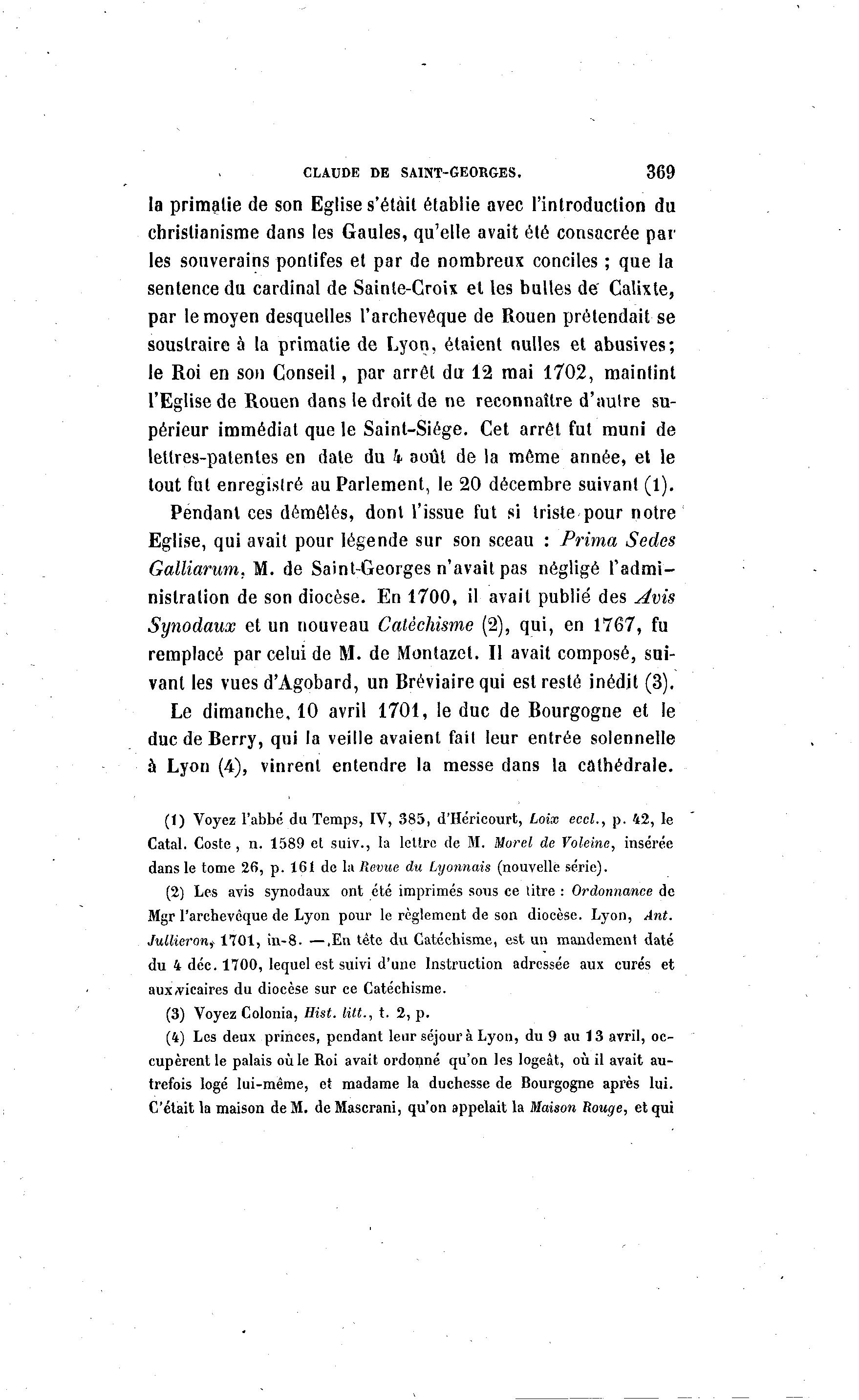 CLAUDE DE SAINT-GEORGES. 369 la primalie de son Eglise s'était établie avec l'introduction du christianisme dans les Gaules, qu'elle avait été consacrée par les souverains pontifes et par de nombreux conciles ; que la sentence du cardinal de Sainte-Croix et les bulles de' Calixte, par le moyen desquelles l'archevêque de Rouen prétendait se soustraire à la primatie de Lyon, étaient nulles et abusives; le Roi en son Conseil, par arrêt du 12 mai 1702, maintint l'Eglise de Rouen dans le droit de ne reconnaître d'autre su- périeur immédiat que le Saint-Siège. Cet arrêt fut muni de lettres-patentes en date du k août de la même année, et le tout fut enregistré au Parlement, le 20 décembre suivant (1). Pendant ces démêlés, dont l'issue fut si triste pour notre Eglise, qui avait pour légende sur son sceau : Prima Sedes Galliarum. M. de Saint-Georges n'avait pas négligé l'admi- nistration de son diocèse. En 1700, il avait publié des Avis Synodaux et un nouveau Catéchisme (2), qui, en 1767, fu remplacé par celui de M. de Montazet. Il avait composé, sui- vant les vues d'Agobard, un Bréviaire qui est resté inédit (3). Le dimanche, 10 avril 1701, le duc de Bourgogne et le duc de Rerry, qui la veille avaient fait leur entrée solennelle à Lyon (4), vinrent entendre la messe dans la cathédrale. (1) Voyez l'abbé du Temps, IV, 385, d'Héricourt, Loix eccl., p. 42, le Catal. Coste , n. 1589 et suiv., la lettre de M. Uorel de Voleine, insérée dans le tome 26, p. 161 de la Revue du Lyonnais (nouvelle série). (2) Les avis synodaux ont été imprimés sous ce litre : Ordonnance de Mgr l'archevêque de Lyon pour le règlement de son diocèse. Lyon, Ant. Juttieront 1701, in-8. —,En tête du Catéchisme, est un mandement daté du 4 déc. 1700, lequel est suivi d'une Instruction adressée aux curés et aux,vicaires du diocèse sur ce Catéchisme. (3) Voyez Colonia, Hist. UH., t. 2, p. (4) Les deux princes, pendant leur séjour à Lyon, du 9 au 13 avril, oc- cupèrent le palais où le Roi avait ordonné qu'on les logeât, où il avait au- trefois logé lui-même, et madame la duchesse de Bourgogne après lui. C'était la maison de M. deMascrani, qu'on appelait la Maison Rouge, et qui