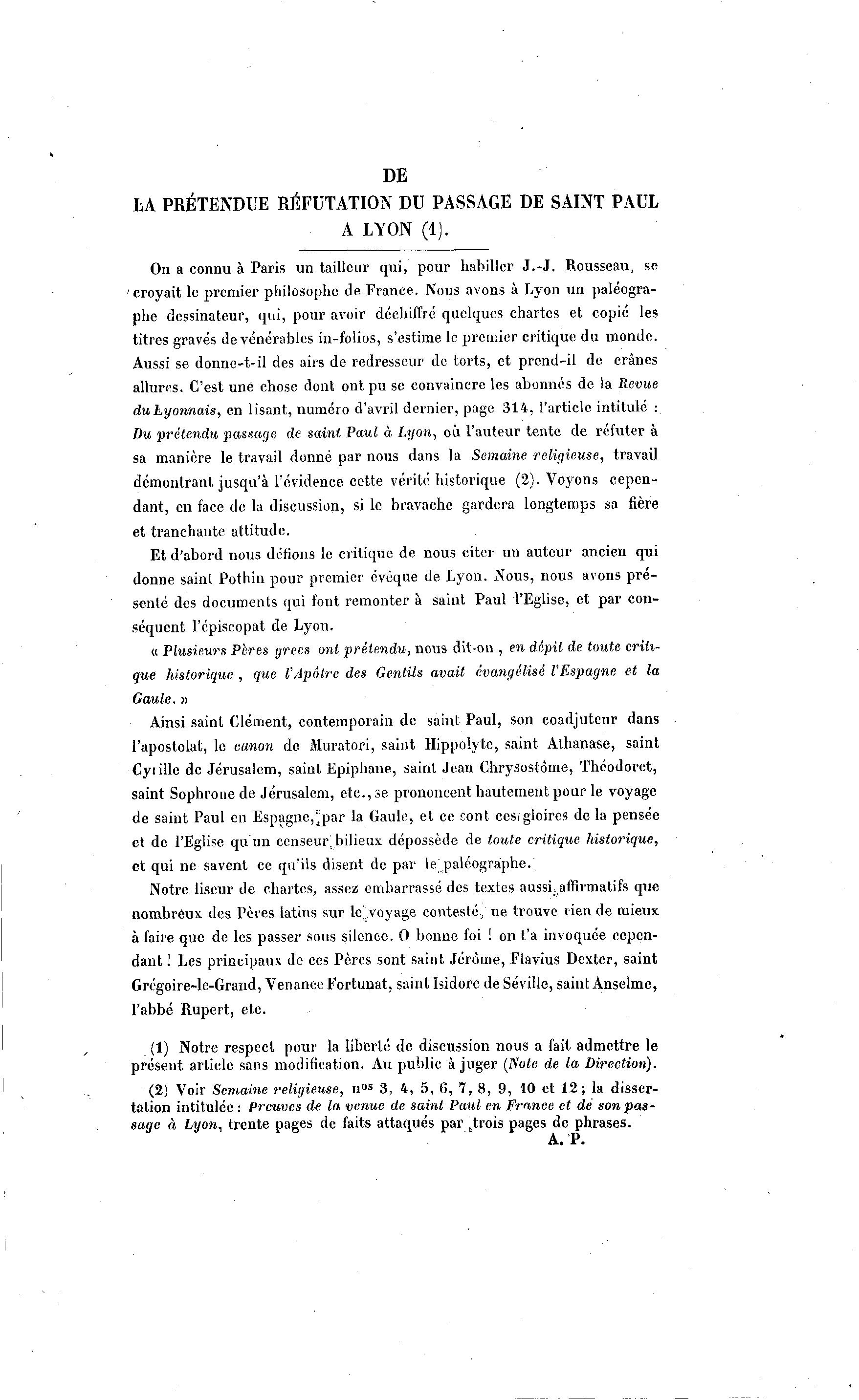 Du prétendu passage de saint, Paul à Lyon, où l'auteur tente de réfuter Ã