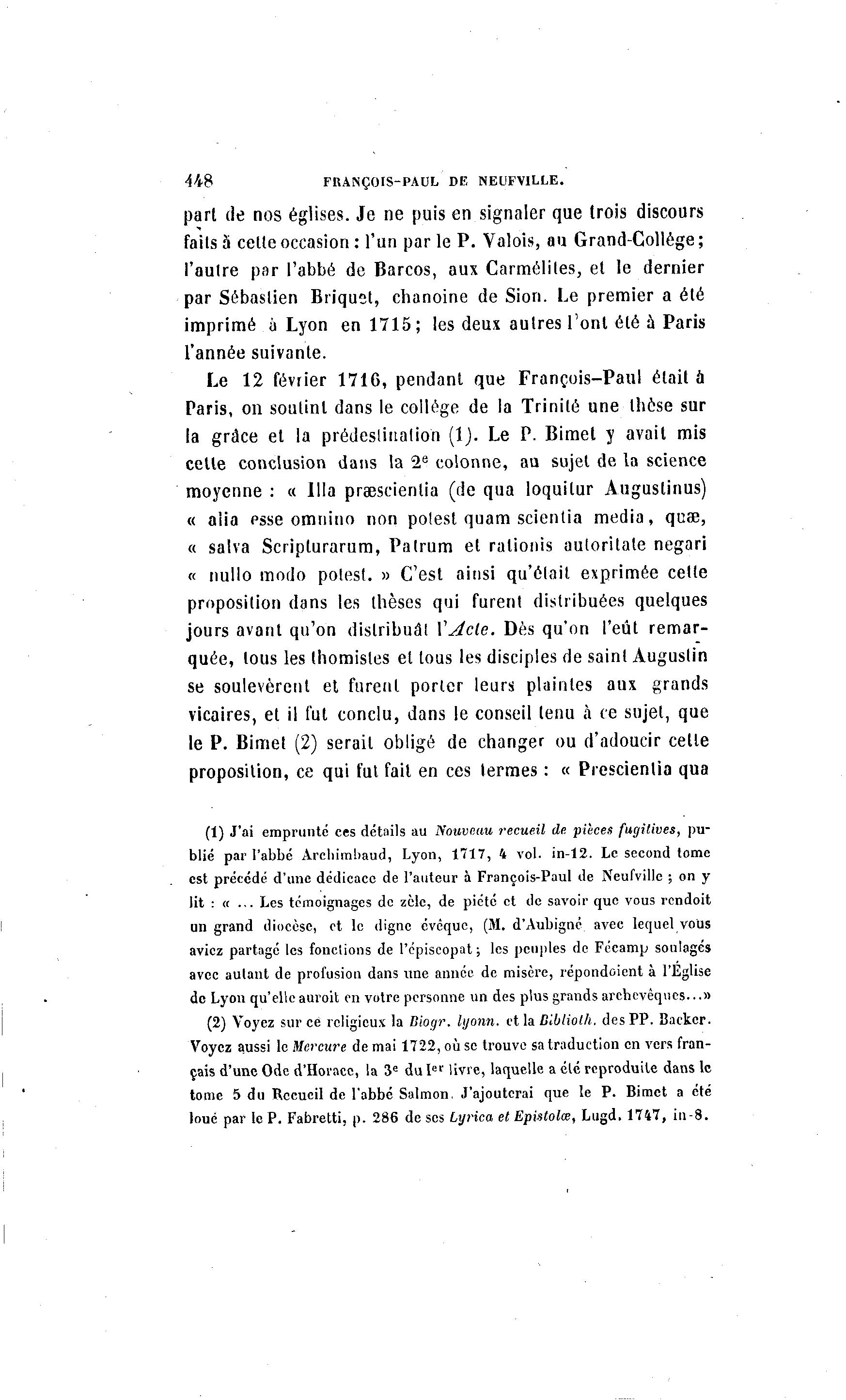 448 FRANÇOIS-PAUL DE NEUFVILLE. part de nos églises. Je ne puis en signaler que trois discours faits à celte occasion : l'un par le P. Valois, au Grand-Collège ; l'autre par l'abbé de Barcos, aux Carmélites, et le dernier par Sébastien Briqust, chanoine de Sion. Le premier a été imprimé à Lyon en 1715; les deux autres l'ont été à Paris l'année suivante. Le 12 février 1716, pendant que François-Paul était à Paris, on soutint dans le collège de la Trinité une thèse sur la grâce et la prédeslinalion (1). Le P. Bimet y avait mis cette conclusion dans la 2e colonne, au sujet de la science moyenne : « 111a praescientia (de qua loquilur Auguslinus) « alia psse omnino non potest quam scientia média, quae, « salva Scriplurarum, Patrum et rationis auloritale negari « nullo modo potest. » C'est ainsi qu'était exprimée cette proposition dans les thèses qui furent distribuées quelques jours avant qu'on distribuai XAcle. Dès qu'on l'eût remar- quée, tous les thomistes et tous les disciples de saint Augustin se soulevèrent et furent porter leurs plaintes aux grands vicaires, et il fut conclu, dans le conseil tenu à ce sujet, que le P. Bimet (2) serait obligé de changer ou d'adoucir celle proposition, ce qui fut fait en ces termes : « Prescienlia qua (1) J'ai emprunté ces détails au Nouveau recueil de pièces fugitives, pu- blié par l'abbé Arcl>im!>aud, Lyon, 1717, 4 vol. in-12. Le second tome est précédé d'une dédicace de l'auteur à François-Paul de Neufville ; on y lit : « ... Les tcmoignages de zèle, de piété et de savoir que vous rcndoit un grand diocèse, et le digne évoque, (M. d'Aubigné avec lequel vous aviez partagé les fondions de l'épiscopat ; les peuples de Fécamp soulagés avec autant de profusion dans une année de misère, repondoient à l'Eglise de Lyon qu'elleauvoit en votre personne un des plus grands archevêques...» (2) Voyez sur ce religieux la Biogr. lyonn. et la Dlbliolh. des PP. Backer. Voyez aussi le Mercure de mai 1722, où se trouve sa traduction en vers fran- çais d'une Ode d'Horace, la 3e du I e r livre, laquelle a élé reproduite dans le tome 5 du Recueil de l'abbé Salmon, J'ajouterai que le P. Bimct a été loué par le P. Fabretti, p. 286 de ses Lyrica et Epistolœ, Lugd. 1747, in-8.