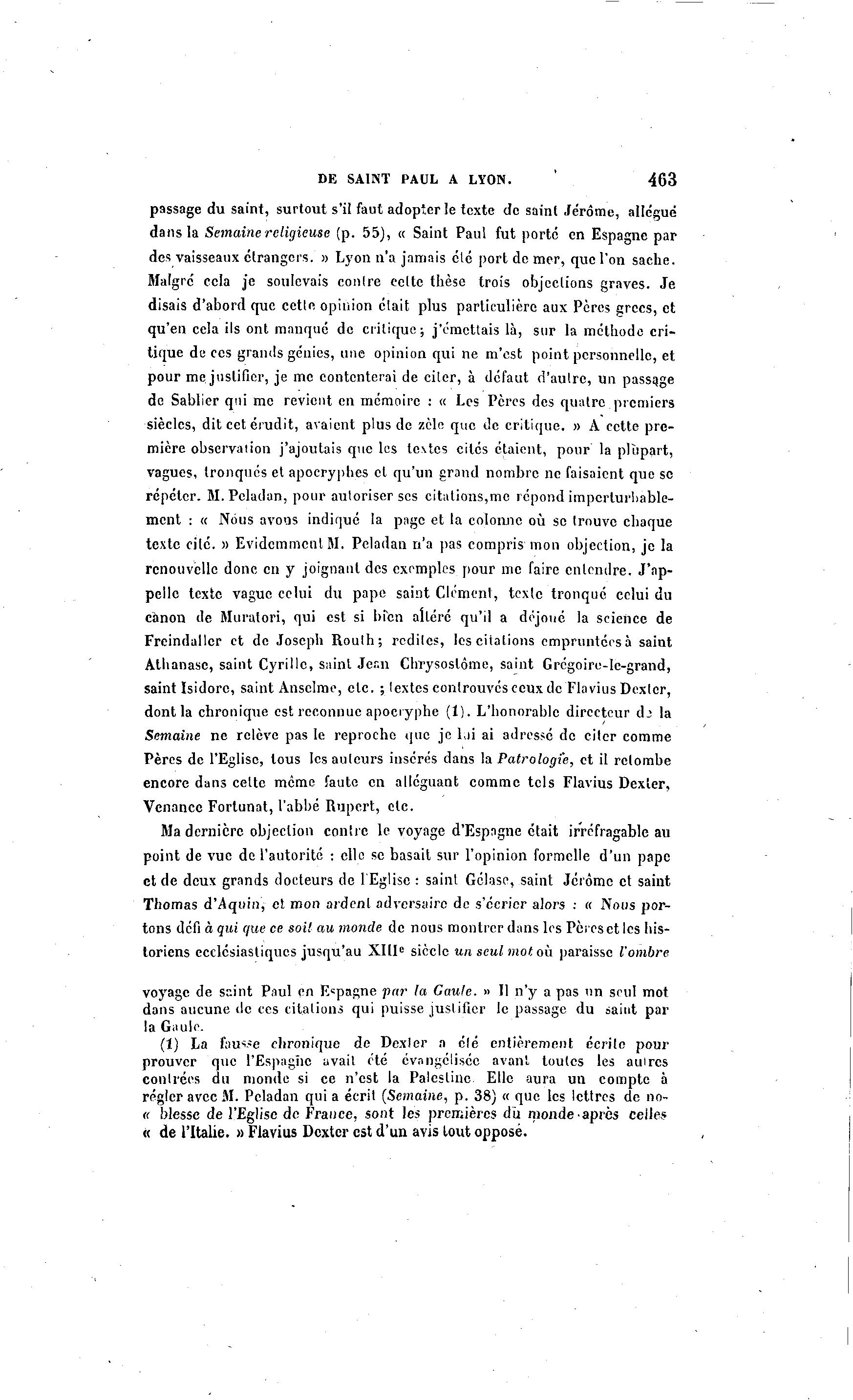 DE SAINT PAUL A LYON. ' 463 passage du saint, surtout s'il faut adopter le texte de saint Jérôme, allégué dans la Semaine religieuse (p. 55), « Saint Paul fut porté en Espagne par des vaisseaux étrangers. » Lyon n'a jamais clé port de mer, que l'on sache. Maigre cela Je soulevais conire celte thèse trois objections graves. Je disais d'abord que cette opinion était plus particulière aux Pères grecs, et qu'en cela ils ont manqué de critique ; j'émettais là , sur la méthode cri- tique de ces grands génies, une opinion qui ne m'est point personnelle, et pour me justifier, je me contenterai de citer, à défaut d'aulrc, un passage de Sablier qui me revient en mémoire : « Les Pères des quatre premiers siècles, dit cet érudit, avaient plus de zèle que de critique. » A cette pre- mière observation j'ajoutais que les textes cités étaient, pour la plupart, vagues, tronqués et apocryphes cl qu'un grand nombre ne faisaient que se répéter. M.Peladan, pour autoriser ses citations,me répond imperturbable- ment : « Nous avons indiqué la page et la colonne où se trouve chaque texte cité. » Evidemment M. Peladan n'a pas compris mon objection, je la renouvelle donc en y joignant des exemples pour me faire entendre. J'ap- pelle texte vague celui du pape saint Clément, texte tronqué celui du canon de Muratori, qui est si bfcn altéré qu'il a déjoué la science de Freindaller et de Joseph Roulh; rcdiles, les citations empruntées à saint Athanasc, saint Cyrille, saint Jean Chrysoslôme, saint Grégoire-Ic-grand, saint Isidore, saint Anselme, etc. ; textes controuvés ceux de Flavius Dexter, dont la chronique est reconnue apocryphe (1). L'honorable directeur dj la Semaine ne relève pas le reproche que je Lii ai adressé de citer comme Pères de l'Eglise, tous les auteurs insérés dans la Patrologîe, et il retombe encore dans celte même faute en alléguant comme tels Flavius Dexter, Vcnancc Fortunat, l'abbé Rupcrt, etc. Ma dernière objection contre le voyage d'Espngne était irréfragable au point de vue de l'autorité : elle se basait sur l'opinion formelle d'un pape et de deux grands docteurs de l'Eglise : saint Gélase, saint Jérôme et saint Thomas d'Aquin, et mon aident adversaire de s'écrier alors : « Nous por- tons défi à qui que ce soi! au monde de nous montrer dans les Pères et les his- toriens ecclésiastiques jusqu'au XIII e siècle un seul mot où paraisse l'ombre voyage de saint Paul en Espagne far la Gaule. » Il n'y a pas un seul mot dans aucune de ces citations qui puisse juslifier le passage du saint par la Gaule. (1) La fausse chronique de Dexler a élé entièrement écrite pour prouver que l'Espagne avait été évnngéliséc avant toutes les auircs contrées du monde si ce n'est la Palestine Elle aura un compte à régler avec M. Peladan qui a écrit (Semaine, p. 38) « que les lettres de no- « blesse de l'Eglise de France, sont les premières du monde après celles « de l'Italie. » Flavius Dexter est d'un avis tout opposé.
