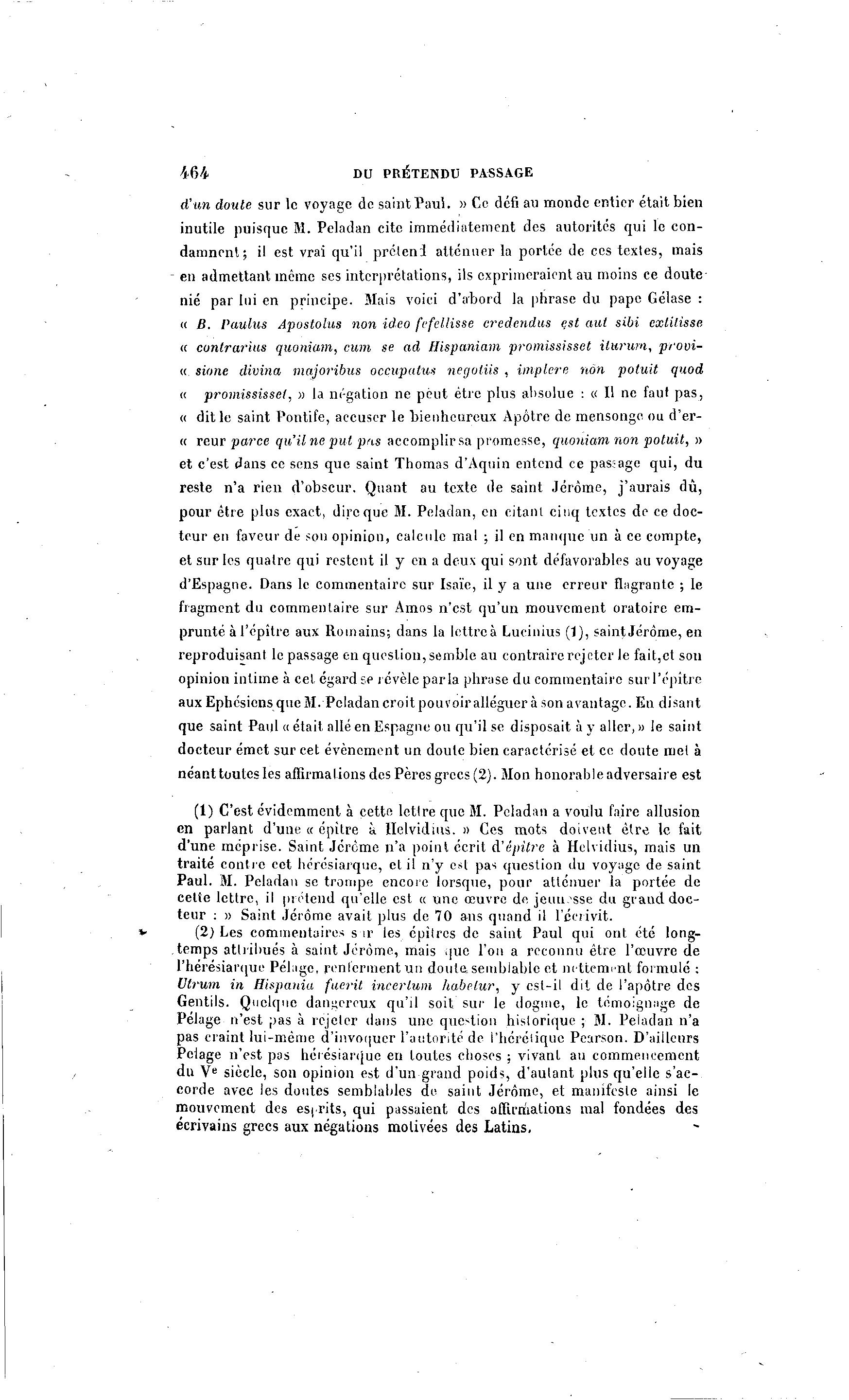 464 DU PRÉTENDU PASSAGE d'un doute sur le voyage de saint Paul. » Ce défi au monde entier était bien inutile puisque M. Peladan cite immédiatement des autorités qui le con- damnent ; il est vrai qu'il préieni atténuer la portée de ces textes, mais - en admettant même ses interprétations, ils exprimeraient au moins ce doute nié par lui en principe. Mais voici d'abord la phrase du pape Gélase : « fi. Paulus dpostolus non ideo fefellisse credendus est aut sibi extilisse a contrarias quoniam, eum se ad Hispaniam promississet ilurum, provi- « sione divina majoribus occupatus negoliis , iinplere non potuit quod « promississet, » la négation ne peut être plus absolue : « Il ne faut pas, « dit le saint Pontife, accuser le bienheureux Apôtre de mensonge ou d'er- « reur parce qu'il ne put pas accomplir sa promesse, quoniam non potuit, » et c'est dans ce sens que saint Thomas d'Aquin entend ce passage qui, du reste n'a rien d'obscur. Quant au texte de saint Jérôme, j'aurais dû, pour être plus exact, dire que M. Peladan, en citant cinq textes de ce doc- teur en faveur de son opinion, calcule mal ; il en manque un à ce compte, et sur les quatre qui restent il y en a deux qui sont défavorables au voyage d'Espagne. Dans le commentaire sur Isaïe, il y a une erreur îbigrante ; le fragment du commentaire sur Amos n'est qu'un mouvement oratoire em- prunté à l'épître aux Romains; dans la lettre à Lucinius (1), saint Jérôme, en reproduisant le passage en question, semble au contraire rejeter le fait,et son opinion intime à cet égard se révèle parla phrase du commentaire surl'épître aux Epbésicns que M. Peladan croit pouvoir alléguer à son avantage. En disant que saint Paul « était allé en Espagne ou qu'il se disposait à y aller, » le saint docteur émet sur cet événement un doute bien caractérisé et ce doute met à néant toutes les affirmations des Pères grecs (2). Mon honorable adversaire est (1) C'est évidemment à cette lettre que M. Peladan a voulu faire allusion en parlant d'une « épitre à llelvidiiis. » Ces mots doivent être le fait d'une méprise. Saint Jérôme n'a point écrit à 'épitre à Hclvidius, mais un traité contre cet hérésiarque, et il n'y est pas question du voyage de saint Paul. M. Peladan se trompe encore lorsque, pour atténuer la portée de cette lettre, il prétend qu'elle est « une œuvre de jeuu'sse du grand doc- teur : » Saint Jérôme avait plus de 70 ans quand il récrivit. (2) Les commentaires s ir les épîlrcs de saint Paul qui ont été long- temps atlrihués à saint Jérôme, mais .|ue l'on a reconnu être l'œuvre de l'hérésiarque Pélnge, renferment un douta semblable et nettement formulé : Vtrum in Hispania fuerit incerlum habelur, y est-il dit de l'apôtre des Gentils. Quelque dangereux qu'il soit sur le dogme, le témoignage de Pelage n'est pas à rejeter dans une question historique ; M. Peladan n'a pas craint lui-même d'invoquer l'autorité de l'hérétique Pearson. D'ailleurs Pelage n'est pas hérésiarque en toutes choses ; vivant au commencement du Ve siècle, son opinion est d'un grand poids, d'autant plus qu'elle s'ac- corde avec les doutes semblables de saint Jérôme, et manifeste ainsi le mouvement des esprits, qui passaient des affirmations mal fondées des écrivains grecs aux négations motivées des Latins.