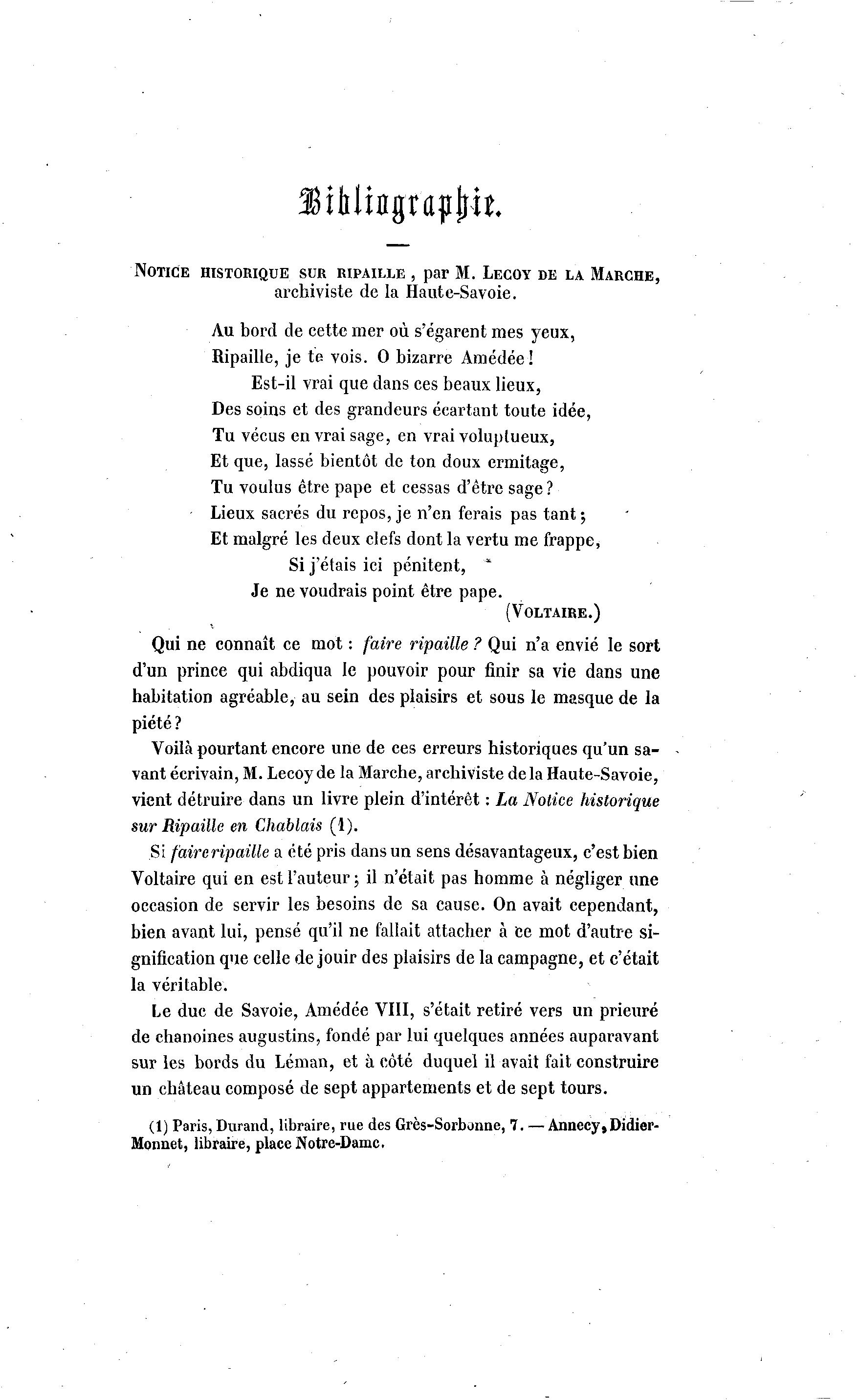 fJikliflgrapjrft NOTICE HISTORIQUE SUR RIPAILLE , par M. LECOY DE LA MARCHE, archiviste de la Haute-Savoie. Au bord de cette mer où s'égarent mes yeux, Ripaille, je te vois. 0 bizarre Amédée! Est-il vrai que dans ces beaux lieux, Des soins et des grandeurs écartant toute idée, Tu vécus en vrai sage, en vrai voluptueux, Et que, lassé bientôt de ton doux ermitage, Tu voulus être pape et cessas d'être sage? Lieux sacrés du repos, je n'en ferais pas tant ; Et malgré les deux clefs dont la vertu me frappe, Si j'étais ici pénitent, " Je ne voudrais point être pape. (VOLTAIRE.) Qui ne connaît ce mot : faire ripaille ? Qui n'a envié le sort d'un prince qui abdiqua le pouvoir pour finir sa vie dans une habitation agréable, au sein des plaisirs et sous le masque de la piété ? Voilà pourtant encore une de ces erreurs historiques qu'un sa- vant écrivain, M. Lecoy de la Marche, archiviste delà Haute-Savoie, vient détruire dans un livre plein d'intérêt : La Notice historique sur Ripaille en Chablais (1). Si faireripaille a été pris dans un sens désavantageux, c'est bien Voltaire qui en est l'auteur ; il n'était pas homme à négliger une occasion de servir les besoins de sa cause. On avait cependant, bien avant lui, pensé qu'il ne fallait attacher à ce mot d'autre si- gnification que celle de jouir des plaisirs de la campagne, et c'était la véritable. Le duc de Savoie, Amédée VIII, s'était retiré vers un prieuré de chanoines augustins, fondé par lui quelques années auparavant sur les bords du Léman, et à côté duquel il avait fait construire un château composé de sept appartements et de sept tours. (1) Paris, Durand, libraire, rue des Grès-Sorbonne, 7. — Annecy,Didier- Monnet, libraire, place Notre-Dame.