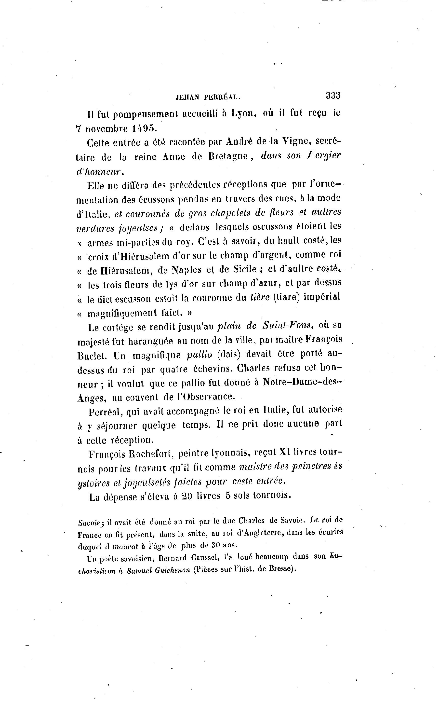 JEHAN PERRÉAI,. 333 Il fut pompeusement accueilli à Lyon, où il fut reçu ie 7 novembre 1495. Celte entrée a été racontée par André de la Vigne, secré- taire de la reine Anne de Bretagne , dans son Fcrgier d'honneur. Elle ne différa des précédentes réceptions que par l'orne- mentation des écussons pendus en travers des rues, à la mode d'Italie, et couronnés de gros chapelets de fleurs et aullres verdures joyeulses; « dedans lesquels escussons éloient les '( armes mi-par!ies du roy. C'est à savoir, du haull costé,les « croix d'Hiérusalem d'or sur le champ d'argent, comme roi « de Hiérusalem, de Naples et de Sicile ; et d'aullre costé% « les trois fleurs de lys d'or sur champ d'azur, et par dessus « le diclescusson estoit la couronne du libre (tiare) impérial « magnifiquement faict. » Le cortège se rendit jusqu'au plain de Saint-Fons, où sa majesté fut haranguée au nom de la ville, par maître François Buclel. Un magnifique pallio (dais) devait élre porté au- dessus du roi par quatre échevins. Charles refusa cet hon- neur ; il voulut que ce pallio fut donné à Nolre-Dame-des- Anges, au couvent de l'Observance. Perréal, qui avait accompagné le roi en Italie, fut autorisé à y séjourner quelque temps. Il ne prit donc aucune part à cette réception. François Rochefort, peintre lyonnais, reçut XI livres tour- nois pour les travaux qu'il fit comme maislre des pcinclres è.s ystoircs cl joyeulselês faictes pour cesle entrée. La dépense s'éleva à 20 livres 5 sols tournois. Savoie ; il avait été donné au roi par le duc Charles de Savoie. Le roi de France en fit présent, dans la suite, au loi d'Angleterre, dans les écuries duquel il mourut à l'âge de plus de 30 ans. Un poète savoisien, Bernard Caussel, l'a loué beaucoup dans son Eu- chari&ticon à Samuel Guichenon (Pièces sur l'hist. de Bresse).