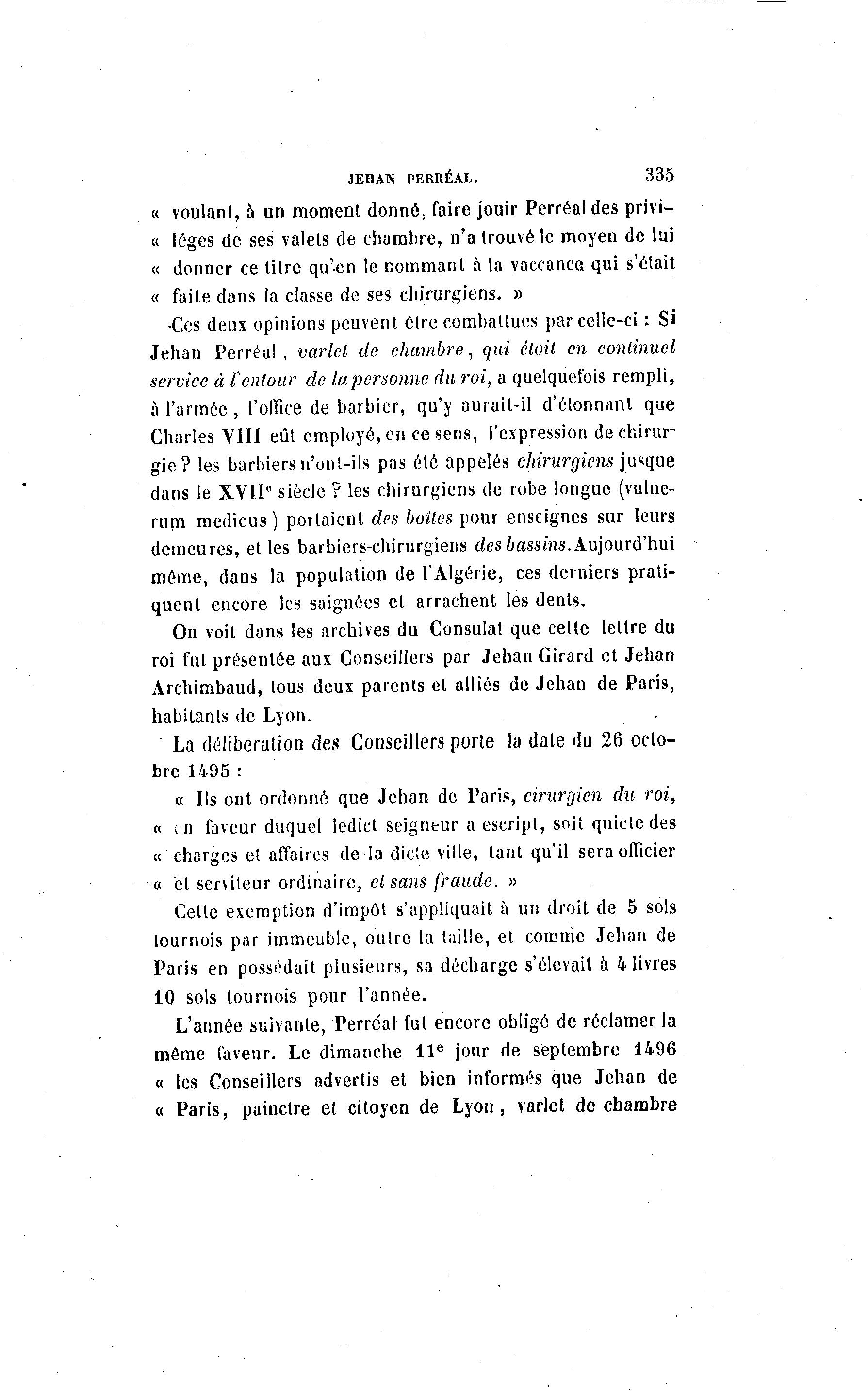 JEHAN PERRÉAL. 335 « voulant, à un moment donné, faire jouir Perréaldes privi— « léges de ses valets de chambre, n'a trouvé le moyen de lui « donner ce titre qu'en le nommant à la vaccance qui s'était « faite dans la classe de ses chirurgiens. » •Ces deux opinions peuvent être combattues parcelle-ci : Si Jehan Perréal , varlct de chambre, qui était en continuel service à tenlour de la personne du roi, a quelquefois rempli, à l'armée, l'office de barbier, qu'y aurait-il d'étonnant que Charles VIII eût employé, en ce sens, l'expression de chirur- gie? les barbiers n'ont-ils pas été appelés chirurgiens jusque dans le XVII e siècle ? les chirurgiens de robe longue (vulne- rum medicus) portaient des boîtes pour enseignes sur leurs demeures, et les barbiers-chirurgiens des bassins.Aujourd'hui môme, dans la population de l'Algérie, ces derniers prati- quent encore les saignées et arrachent les dents. On voit dans les archives du Consulat que celle lettre du roi fut présentée aux Conseillers par Jehan Girard et Jehan Archimbaud, lous deux parenls et alliés de Jehan de Paris, habitants de Lyon. La délibération des Conseillers porte la date du 26 octo- bre 1495 : « Ils ont ordonné que Jehan de Paris, cirurgien du roi, « m faveur duquel ledict seigneur a escripl, soit quicle des « charges et affaires de la dicle ville, tant qu'il seraolïicier « et serviteur ordinaire, cl sans fraude. » Cette exemption d'impôt s'appliquait à un droit de 5 sols tournois par immeuble, outre la taille, et comme Jehan de Paris en possédait plusieurs, sa décharge s'élevait à 4 livres 10 sols tournois pour l'année. L'année suivante, Perréal fut encore obligé de réclamer la même faveur. Le dimanche 11 e jour de septembre 1496 « les Conseillers adverlis et bien informés que Jehan de « Paris, painclre et citoyen de Lyon, varlet de chambre