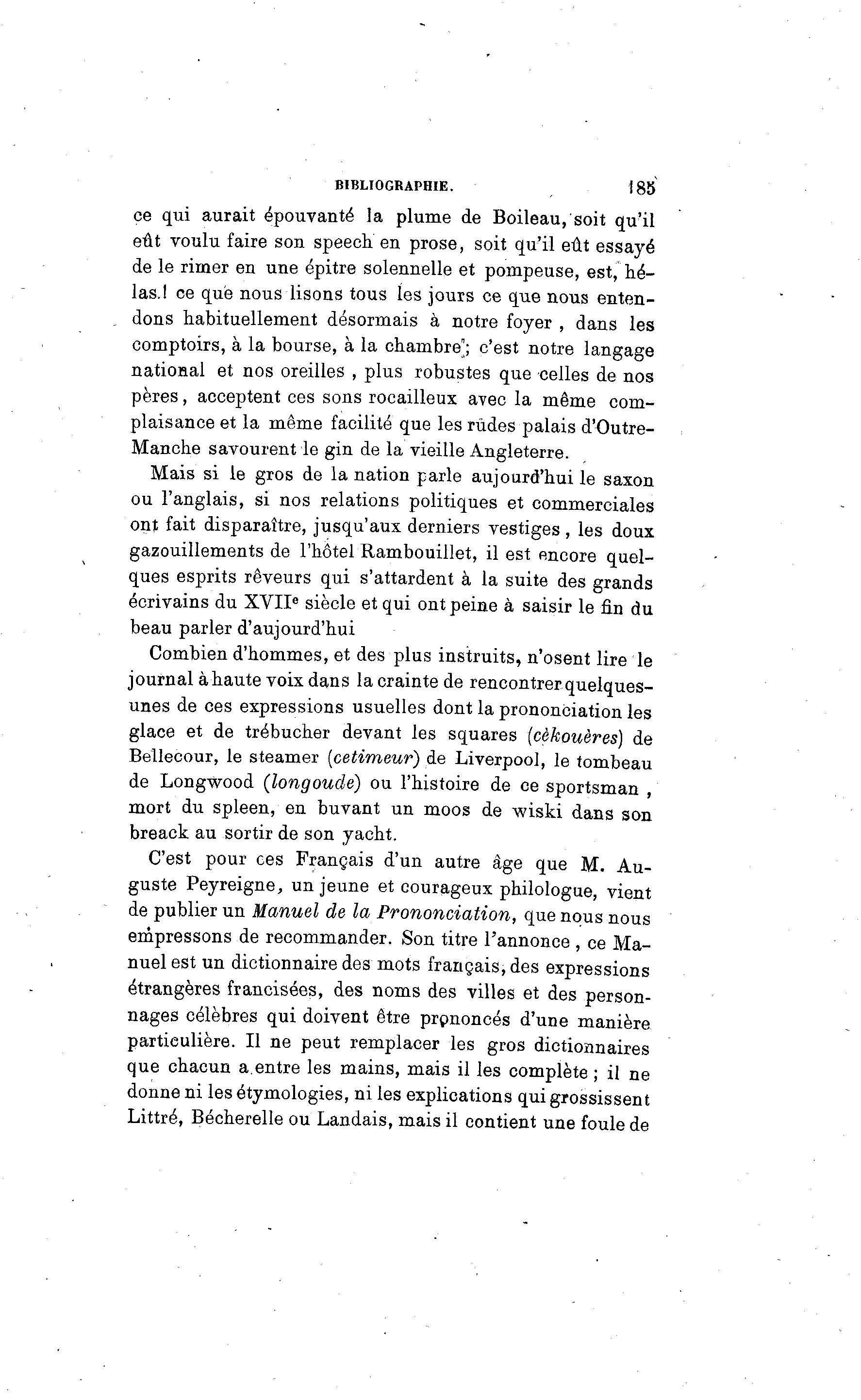 BIBLIOGRAPHIE. jg5 ce qui aurait épouvanté la plume de Boileau, soit qu'il eût voulu faire son speech en prose, soit qu'il eût essayé de le rimer en une épitre solennelle et pompeuse, est, hé- las.! ce que nous lisons tous les jours ce que nous enten- dons habituellement désormais à notre foyer , dans les comptoirs, à la bourse, à la chambre'; c'est notre langage national et nos oreilles , plus robustes que celles de nos pères, acceptent ces sons rocailleux avec la même com- plaisance et la même facilité que les rudes palais d'Outre- Manche savourent le gin de la vieille Angleterre. Mais si le gros de la nation parle aujourd'hui le saxon ou l'anglais, si nos relations politiques et commerciales ont fait disparaître, jusqu'aux derniers vestiges, les doux gazouillements de l'hôtel Rambouillet, il est encore quel- ques esprits rêveurs qui s'attardent à la suite des grands écrivains du XVII e siècle et qui ont peine à saisir le fin du beau parler d'aujourd'hui Combien d'hommes, et des plus instruits, n'osent lire le journal à haute voix dans la crainte de rencontrer quelques- unes de ces expressions usuelles dont la prononciation les glace et de trébucher devant les squares (cèkouères) de Bellecour, le steamer (cetimeur) de Liverpool, le tombeau de Longwood (longoude) ou l'histoire de ce sportsman mort du spleen, en buvant un moos de wiski dans son breack au sortir de son yacht. C'est pour ces Français d'un autre âge que M. Au- guste Peyreigne, un jeune et courageux philologue, vient de publier un Manuel de la Prononciation, que nous nous empressons de recommander. Son titre l'annonce , ce Ma- nuel est un dictionnaire des mots français, des expressions étrangères francisées, des noms des villes et des person- nages célèbres qui doivent être prononcés d'une manière particulière. Il ne peut remplacer les gros dictionnaires que chacun a.entre les mains, mais il les complète ; il ne donne ni les étymologies, ni les explications qui grossissent Littré, Bécherelle ou Landais, mais il contient une foule de