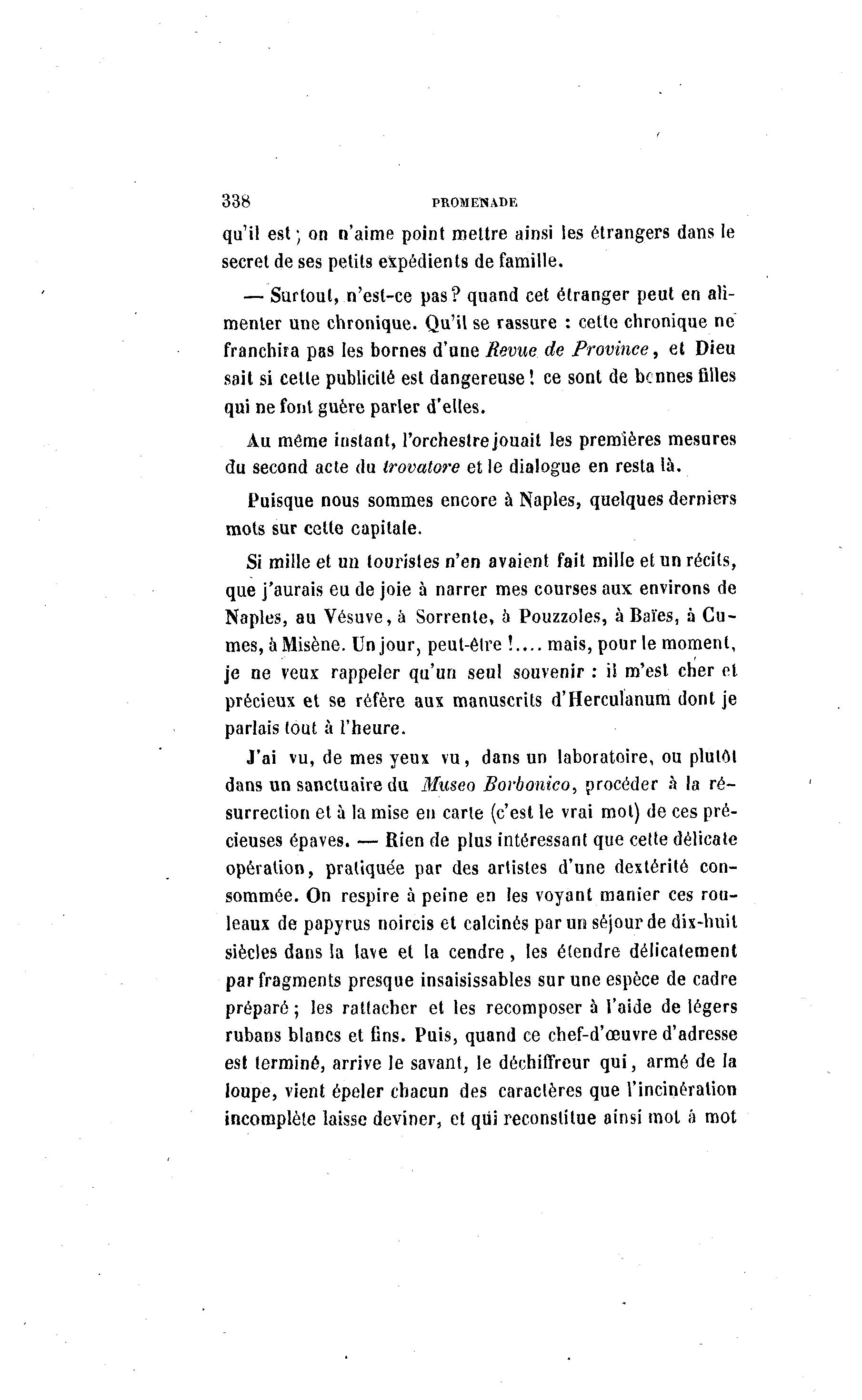 338 PROMENADE qu'il est ; on n'aime point mettre ainsi les étrangers dans le secret de ses petits expédients de famille. — Surtout, n'est-ce pas? quand cet étranger peut en ali- menter une chronique. Qu'il se rassure : cette chronique ne franchira pas les bornes d'une Revue de Province, et Dieu sait si cette publicité est dangereuse ! ce sont de bennes filles qni ne font guère parler d'elles. Au même instant, l'orchestre jouait les premières mesures du second acte du trovatore et le dialogue en resta là . Puisque nous sommes encore à Naples, quelques derniers mots sur cette capitale. Si mille et un touristes n'en avaient fait mille et un récils, que j'aurais eu de joie à narrer mes courses aux environs de Naples, au Vésuve, a Sorrente, à Pouzzoles, à Baïes, à Cu- mes, à Misène. Un jour, peut-être !.... mais, pour le moment, je ne veux rappeler qu'un seul souvenir : ii m'est cher et précieux et se réfère aux manuscrits d'Hercuïanum dont je parlais tout à l'heure. J'ai vu, de mes yeux vu, dans un laboratoire, ou plutôt dans un sanctuaire du Museo Bovbonico, procéder à la ré- surrection et à la mise en carie (c'est le vrai mot) de ces pré- cieuses épaves. — Rien de plus intéressant que cette délicate opération, pratiquée par des artistes d'une dextérité con- sommée. On respire à peine en les voyant manier ces rou- leaux de papyrus noircis et calcinés par un séjour de dix-huit siècles dans la lave et la cendre, les étendre délicatement par fragments presque insaisissables sur une espèce de cadre préparé ; les rattacher et les recomposer à l'aide de légers rubans blancs et fins. Puis, quand ce chef-d'œuvre d'adresse est terminé, arrive le savant, le déchiffreur qui, armé de la loupe, vient épeler chacun des caractères que l'incinération incomplète laisse deviner, et qui reconstitue ainsi mot à mot