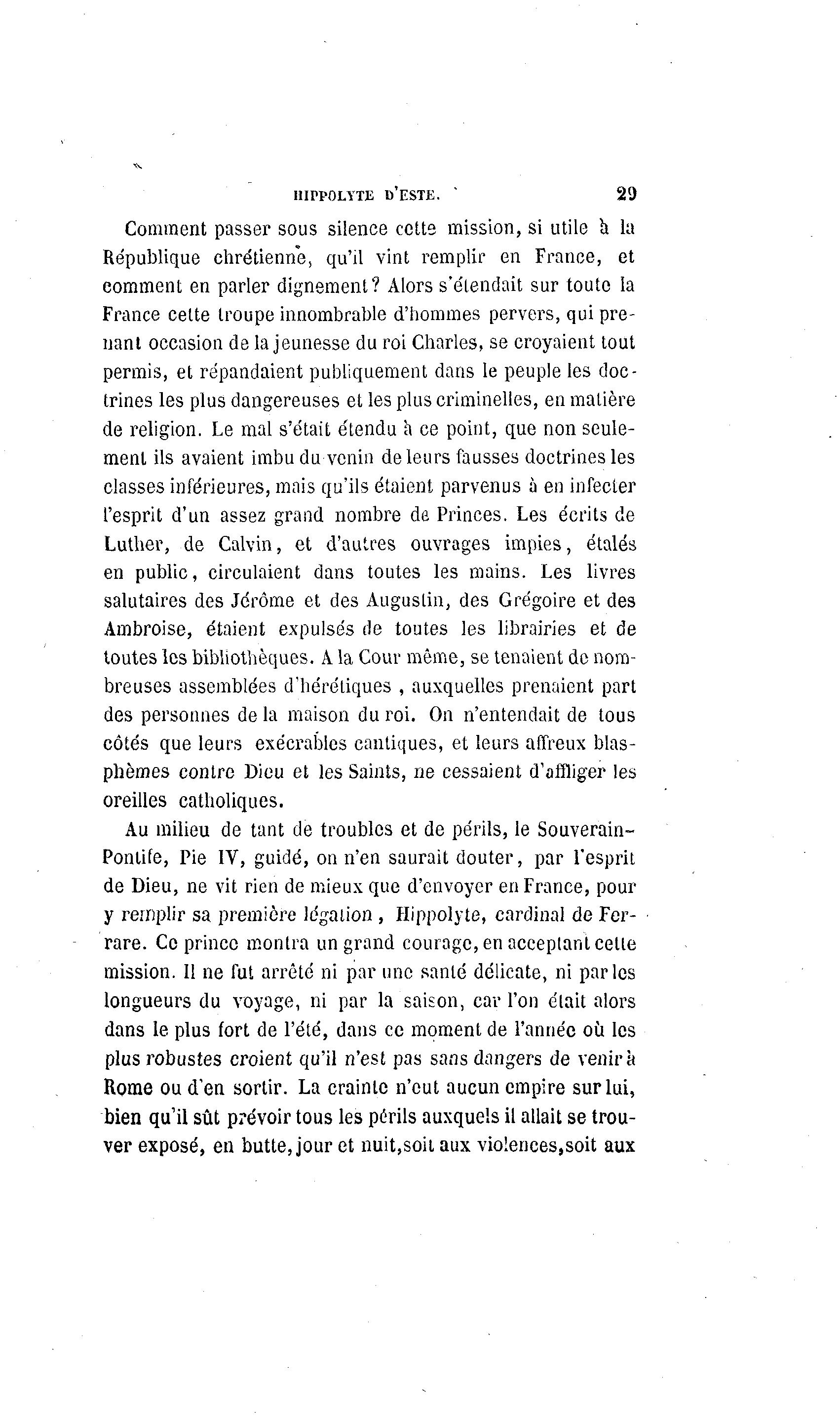 HIPPOLYTE D'ESTE. ' 29 Comment passer sous silence cette mission, si utile à la République chrétienne, qu'il vint remplir en France, et comment en parler dignement? Alors s'étendait sur toute la France cette troupe innombrable d'hommes pervers, qui pre- nant occasion de la jeunesse du roi Charles, se croyaient tout permis, et répandaient publiquement dans le peuple les doc- trines les plus dangereuses et les plus criminelles, en matière de religion. Le mal s'était étendu à ce point, que non seule- ment ils avaient imbu du venin de leurs fausses doctrines les classes inférieures, mais qu'ils étaient parvenus à en infecter l'esprit d'un assez grand nombre da Princes. Les écrits de Luther, de Calvin, et d'autres ouvrages impies, étalés en public, circulaient dans toutes les mains. Les livres salutaires des Jérôme et des Augustin, des Grégoire et des Ambroise, étaient expulsés de toutes les librairies et de toutes les bibliothèques. A la Cour même, se tenaient de nom- breuses assemblées d'hérétiques , auxquelles prenaient part des personnes de la maison du roi. On n'entendait de tous côtés que leurs exécrables cantiques, et leurs affreux blas- phèmes contre Dieu et les Saints, ne cessaient d'affliger les oreilles catholiques. Au milieu de tant de troubles et de périls, le Souverain- Pontife, Pie IV, guidé, on n'en saurait douter, par l'esprit de Dieu, ne vit rien de mieux que d'envoyer en France, pour y remplir sa première légation , Hippolyte, cardinal de Fer- rare. Ce prince montra un grand courage, en acceptant cette mission. Il ne fut arrêté ni par une santé délicate, ni parles longueurs du voyage, ni par la saison, car l'on était alors dans le plus fort de l'été, dans ce moment de l'année où les plus robustes croient qu'il n'est pas sans dangers de venir à Rome ou d'en sortir. La crainte n'eut aucun empire sur lui, bien qu'il sût prévoir tous les périls auxquels il allait se trou- ver exposé, en butte, jour et nuit,soit aux vio!ences,soit aux