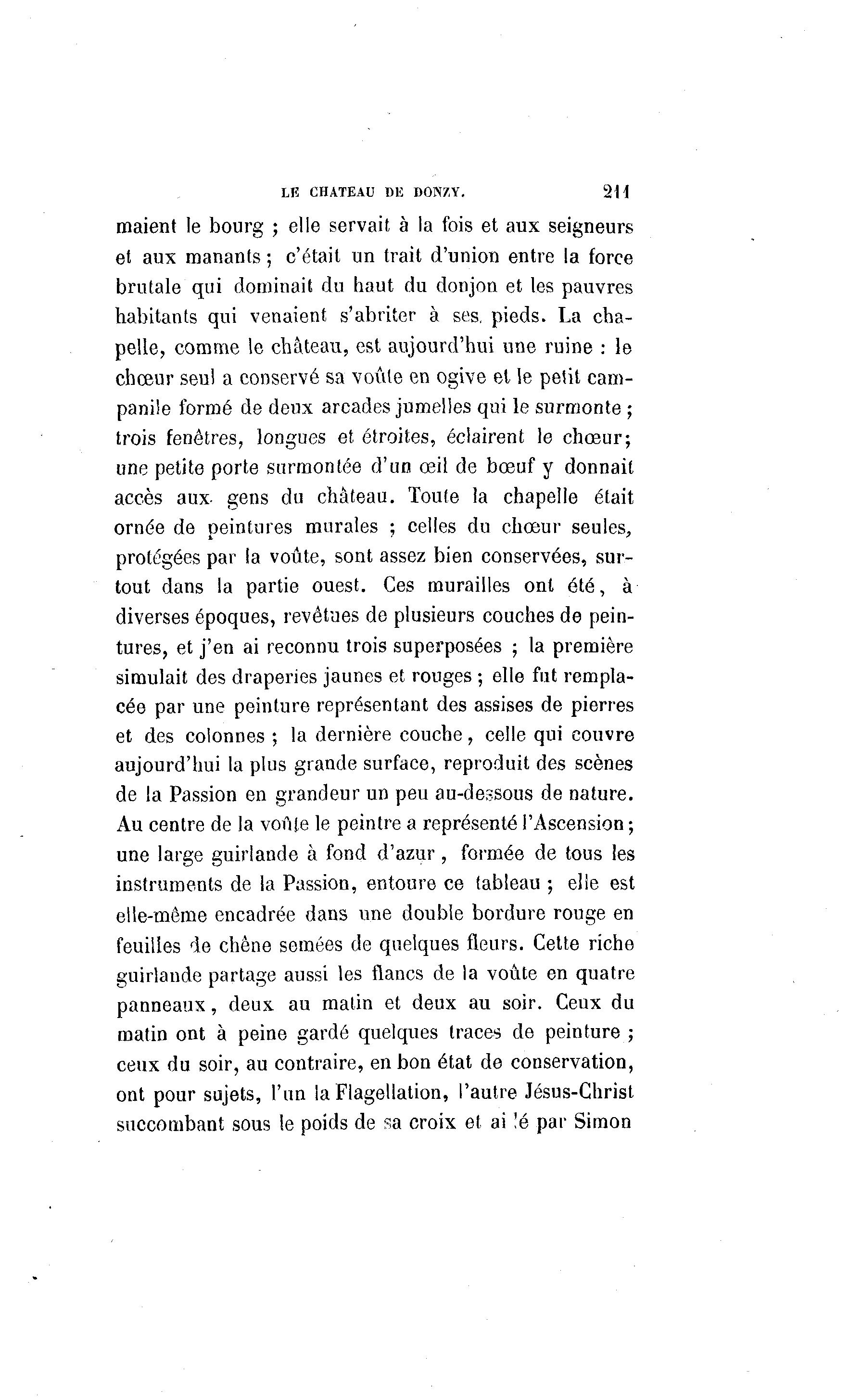 LE CHATEAU DE DONZY. 2 M maient le bourg ; elle servait à la fois et aux seigneurs et aux manants ; c'était un trait d'union entre la force brutale qui dominait du haut du donjon et les pauvres habitants qui venaient s'abriter à ses, pieds. La cha- pelle, comme le château, est aujourd'hui une ruine : le chœur seul a conservé sa voûte en ogive et le petit cam- panile formé de deux arcades jumelles qui le surmonte ; trois fenêtres, longues et étroites, éclairent le chœur; une petite porte surmontée d'un œil de bœuf y donnait accès aux- gens du château. Toute la chapelle était ornée de peintures murales ; celles du chœur seules, protégées par la voûte, sont assez bien conservées, sur- tout dans la partie ouest. Ces murailles ont été, à diverses époques, revêtues de plusieurs couches de pein- tures, et j'en ai reconnu trois superposées ; la première simulait des draperies jaunes et rouges ; elle fut rempla- cée par une peinture représentant des assises de pierres et des colonnes ; la dernière couche, celle qui couvre aujourd'hui la plus grande surface, reproduit des scènes de la Passion en grandeur un peu au-dessous de nature. Au centre de la voûte le peintre a représenté l'Ascension ; une large guirlande à fond d'azur, formée de tous les instruments de la Passion, entoure ce tableau ; elle est elle-même encadrée dans une double bordure rouge en feuilles de chêne semées de quelques fleurs. Cette riche guirlande partage aussi les flancs de la voûte en quatre panneaux, deux au matin et deux au soir. Ceux du matin ont à peine gardé quelques traces de peinture ; ceux du soir, au contraire, en bon état de conservation, ont pour sujets, l'un la Flagellation, l'autre Jésus-Christ succombant sous le poids de sa croix et ai !é par Simon