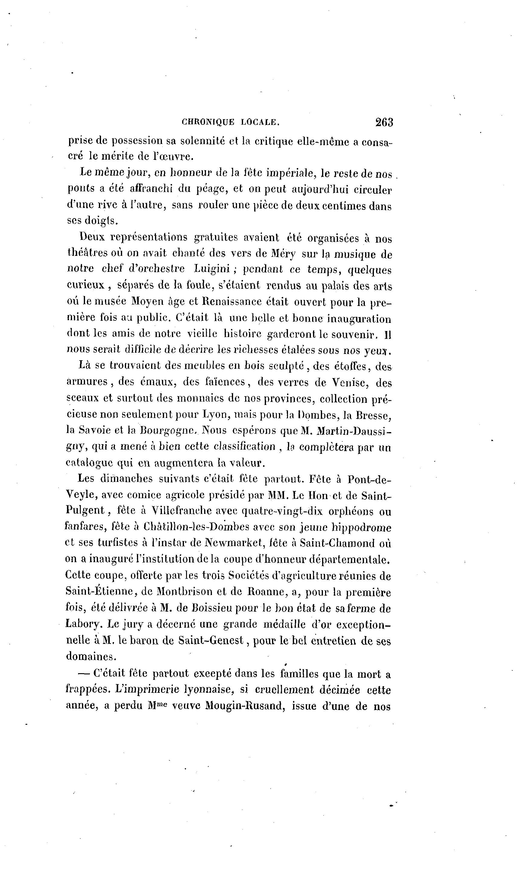 CHRONIQUE LOCALE. 263 prise de possession sa solennité et la critique elle-même a consa- cré le mérite de l'œuvre. Le même jour, en honneur de la fête impériale, le reste de nos . ponts a été affranchi du péage, et on peut aujourd'hui circuler d'une rive à l'autre, sans rouler une pièce de deux centimes dans ses doigts. Deux représentations gratuites avaient été organisées à nos théâtres où on avait chanté des vers de Méry sur la musique de notre chef d'orchestre Luigini ; pendant ce temps, quelques curieux , séparés de la foule, s'étaient rendus au palais des arts où le musée Moyen âge et Renaissance était ouvert pour la pre- mière fois au public. C'était là une belle et bonne inauguration dont les amis de notre vieille histoire garderont le souvenir. Il nous serait difficile de décrire les richesses étalées sous nos yeux. Là se trouvaient des meubles en bois sculpté . des étoffes, des armures , des émaux, des faïences, des verres de Venise, des sceaux et surtout des monnaies de nos provinces, collection pré- cieuse non seulement pour Lyon, mais pour la Dombes, la Bresse, la Savoie et la Bourgogne, Nous espérons que M. Martin-Daussi- gny, qui a mené à bien cette classification , la complétera par un catalogue qui en augmentera la valeur. Les dimanches suivants c'était fête partout. Fête à Pont-de- Veyle, avec comice agricole présidé par MM. Le lion et de Saint- Pulgent, fête à Villefranche avec quatre-vingt-dix orphéons ou fanfares, fête à Châtillon-les-Dombes avec son jeune hippodrome et ses turfistes à l'instar de Newmarket, fête à Saint-Chamond où on a inauguré l'institution de la coupe d'honneur départementale. Cette coupe, offerte par les trois Sociétés d'agriculture réunies de Saint-Étienne, de Monlbrison et de Roanne, a, pour la première fois, été délivrée à M. de Boissieu pour le bon état de sa ferme de Labory. Le jury a décerné une grande médaille d'or exception- nelle à M, le baron de Saint-Genest, pour le bel entretien de ses domaines. — C'était fête partout exeepté dans les familles que la mort a frappées. L'imprimerie lyonnaise, si cruellement décimée cette année, a perdu Mme veuve Mougin-Rusand, issue d'une de nos