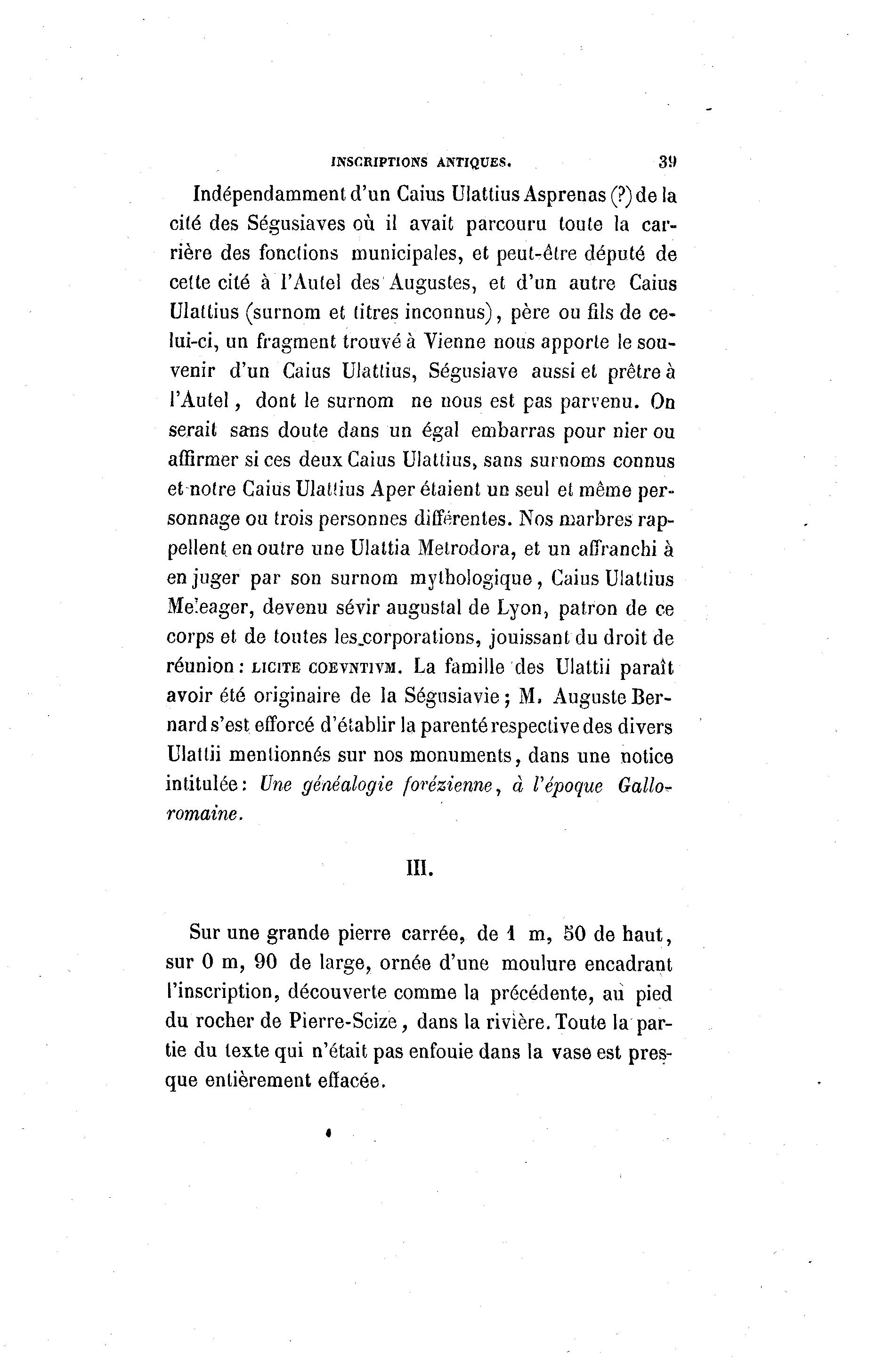 INSCRIPTIONS ANTIQUES. 39 Indépendamment d'un Caius UlattiusAsprenas(?)dela cité des Ségusiaves où il avait parcouru toute la car- rière des fonctions municipales, et peut-être député de cette cité à l'Autel des Augustes, et d'un autre Caius Ulattius (surnom et titres inconnus), père ou fils de ce- lui-ci, un fragment trouvé à Vienne nous apporte le sou- venir d'un Caius Ulattius, Ségusiave aussi et prêtre à l'Autel, dont le surnom ne nous est pas parvenu. On serait sans doute dans un égal embarras pour nier ou affirmer si ces deux Caius Ulattius» sans surnoms connus et notre Caius Ulatlius Aper étaient un seul et même per- sonnage ou trois personnes différentes. Nos marbres rap- pellent en outre une Ulattia Metrodora, et un affranchi à en juger par son surnom mythologique, Caius Ulattius Me'eager, devenu sévir augustal de Lyon, patron de ce corps et de toutes les.corporations, jouissant du droit de réunion: LICITE COEVNTIVM. La famille des Ulattii paraît avoir été originaire de la Ségusiavie ; M. Auguste Ber- nard s'est efforcé d'établir la parenté respective des divers Ulattii mentionnés sur nos monuments, dans une notice intitulée: Une généalogie forézienne, à l'époque Gallo- romaine. III. Sur une grande pierre carrée, de 1 m, 50 de haut, sur 0 m, 90 de large, ornée d'une moulure encadrant l'inscription, découverte comme la précédente, au pied du rocher de Pierre-Scize, dans la rivière. Toute la par- tie du texte qui n'était pas enfouie dans la vase est pres- que entièrement effacée.