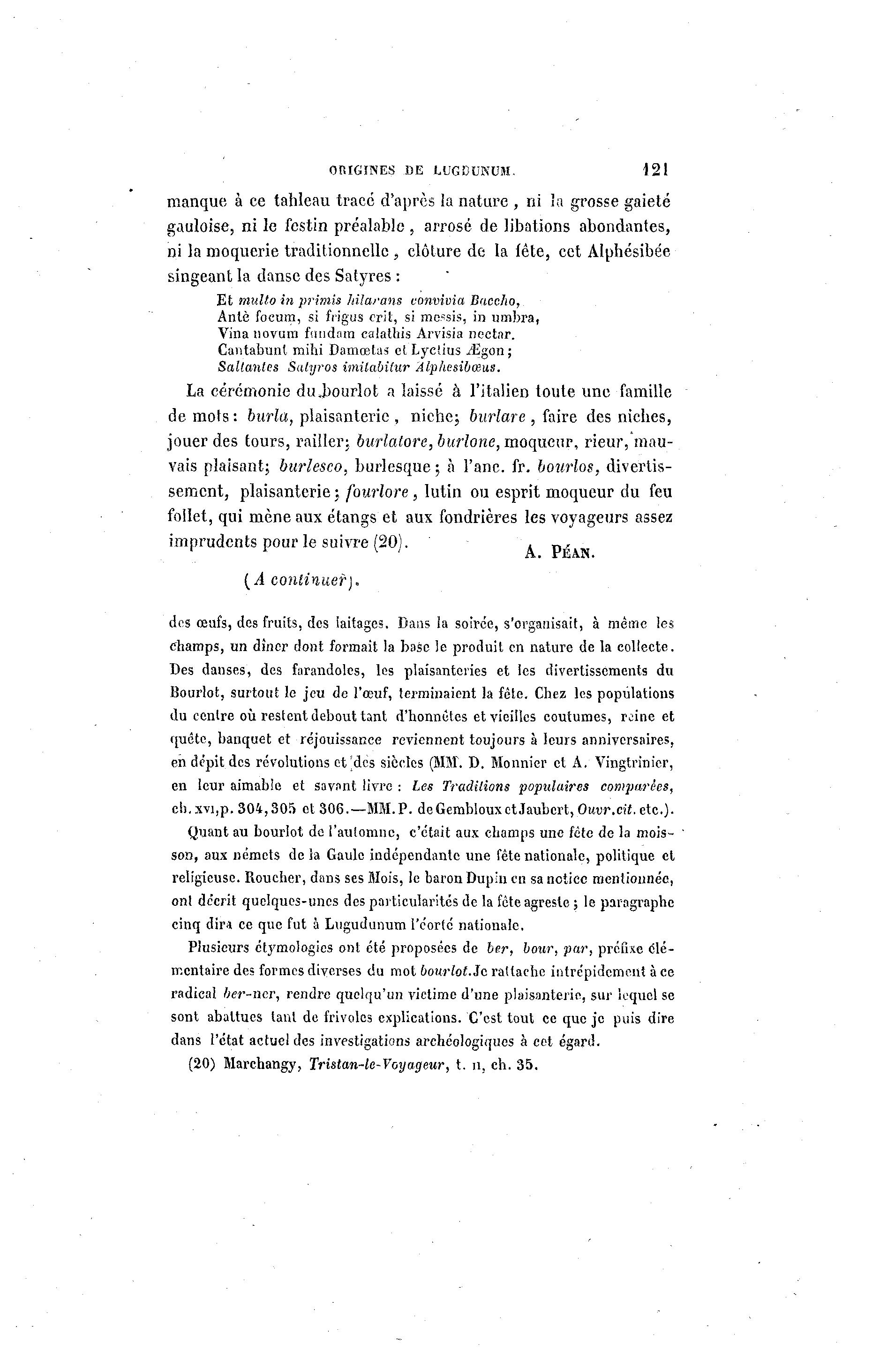 ORIGINES DE LUGDUKUM. 121 manque à ce tahleau tracé d'après îa nature , ni 3a grosse gaieté gauloise, ni le festin préalable , arrosé de libations abondantes, ni la moquerie traditionnelle , clôture de la fête, cet Alphésibée singeant la danse des Satyres : Et multo in prîmis Mlarans convivia Baccho, Anlè foeum, si frigus cril, si moisis, in umbra, Vinanovum fmidam calathis Arvisia nectar. Cantabunt mihi Damœtas et Lyeîius ./figon; Saltatites Salyros imilabilur Âlphesibœus. La cérémonie du.bourlot a laissé à l'italien toute une famille de mois: burla, plaisanterie , niche; burlare , faire des niches, jouer des tours, railler; burlatore, burlone, moqueur, rieur, mau- vais plaisant; burlesco, burlesque ; à l'anc. fr. bourlos, divertis- sement, plaisanterie ; fourlore, lutin ou esprit moqueur du feu follet, qui mène aux étangs et aux fondrières les voyageurs assez imprudents pour le suivre (20). A P'AN (^4 continuerj. des œufs, des fruits, des iaitages. Dans la soirée, s'organisait, à même les champs, un dîner dont formait la base le produit en nature de la collecte. Des danses, des farandoles, les plaisanteries et les divertissements du Bourlot, surtout le jeu de l'œuf, terminaient la fête. Chez les populations du centre où restent debout tant d'honnêtes et vieilles coutumes, reine et quête, banquet et réjouissance reviennent toujours à leurs anniversaires, en dépit des révolutions et'des siècles (MM. D. Monnier et À. Vingtrinier, en leur aimable et savant livre : Les Traditions populaires comparées, cb. xvi.p. 304,305 et 306.—MM.P. deGemblouxetJaubcrt, Ouvr.cit. etc.). Quant au bourlot de l'automne, c'était aux champs une fête de la mois- ' son, aux némets de la Gaule indépendante une fête nationale, politique et religieuse. Roucher, dans ses Mois, le baron Dupin en sa notice mentionnée, ont décrit quelques-unes des particularités de la fête agreste ; le paragraphe cinq dira ce que fut à Lugudunum l'éorfc nationale. Plusieurs étymologics ont été proposées de ber, bour, par, préfixe élé- mentaire des formes diverses du mot bourht.Jc rattache intrépidement à ce radical lier-ncr, rendre quelqu'un victime d'une plaisanterie, sur lequel se sont abattues tant de frivoles explications. C'est tout ce que je puis dire dans l'état actuel des investigations archéologiques à cet égard. (20) Marchangy, Tristan-le-Voyageur, t. u, ch. 35.