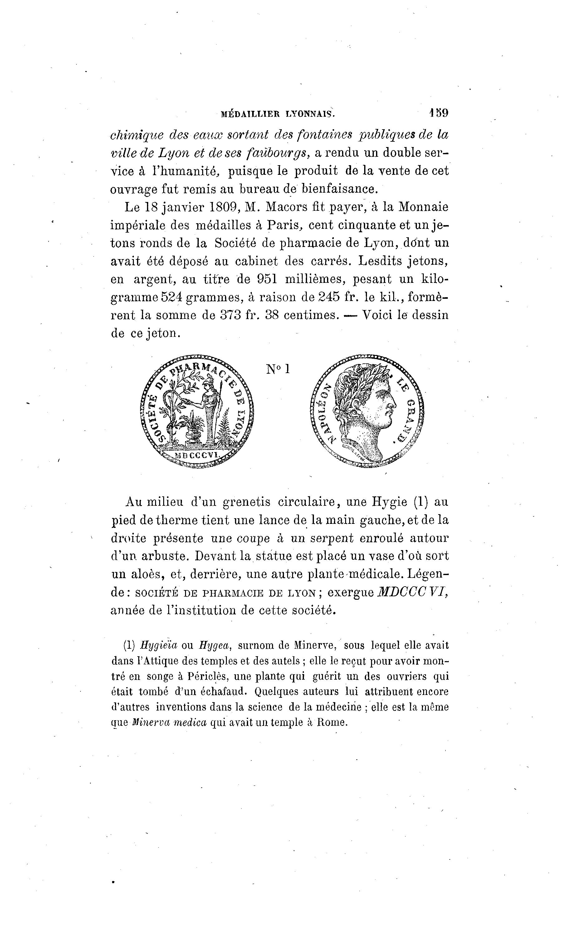 MÉDAIIXIER LYONNAIS. 159 chimique des eaux sortant des fontaines publiques de la ville de Lyon et de ses faubourgs, a rendu un double ser- vice à l'humanité, puisque le produit de la vente de cet ouvrage fut remis au bureau de bienfaisance. Le 18 janvier 1809, M. Macors fit payer, à la Monnaie impériale des médailles à Paris, cent cinquante et un j e - tons ronds de la Société de pharmacie de Lyon, ddnt un avait été déposé au cabinet des carrés. Lesdits jetons, en argent, au titre de 951 millièmes, pesant un kilo- gramme 524 grammes, à raison de 245 fr. le kil., formè- rent la somme de 373 fr. 38 centimes. — Voici le dessin de ce jeton. Au milieu d'un grenetis circulaire, une Hygie (1) au pied detherme tient une lance de la main gauche, et de la droite présente une coupe à un serpent enroulé autour d'un arbuste. Devant la statue est placé un vase d'où sort un aloès, et, derrière, une autre plante-médicale. Légen- de : SOCIÉTÉ DE PHARMACIE DE LYON ; exergue MDCCC VI, année de l'institution de cette société. (1) Hygieïa ou Hygea, surnom de Minerve, sous lequel elle avait dans l'Attique des temples et des autels ; elle le reçut pour avoir mon- tré en songe à Périclès, une plante qui guérit un des ouvriers qui était tombé d'un échafaud. Quelques auteurs lui attribuent encore d'autres inventions dans la science de la médecine ; elle est la même que Miner va medica qui avait un temple à Rome.