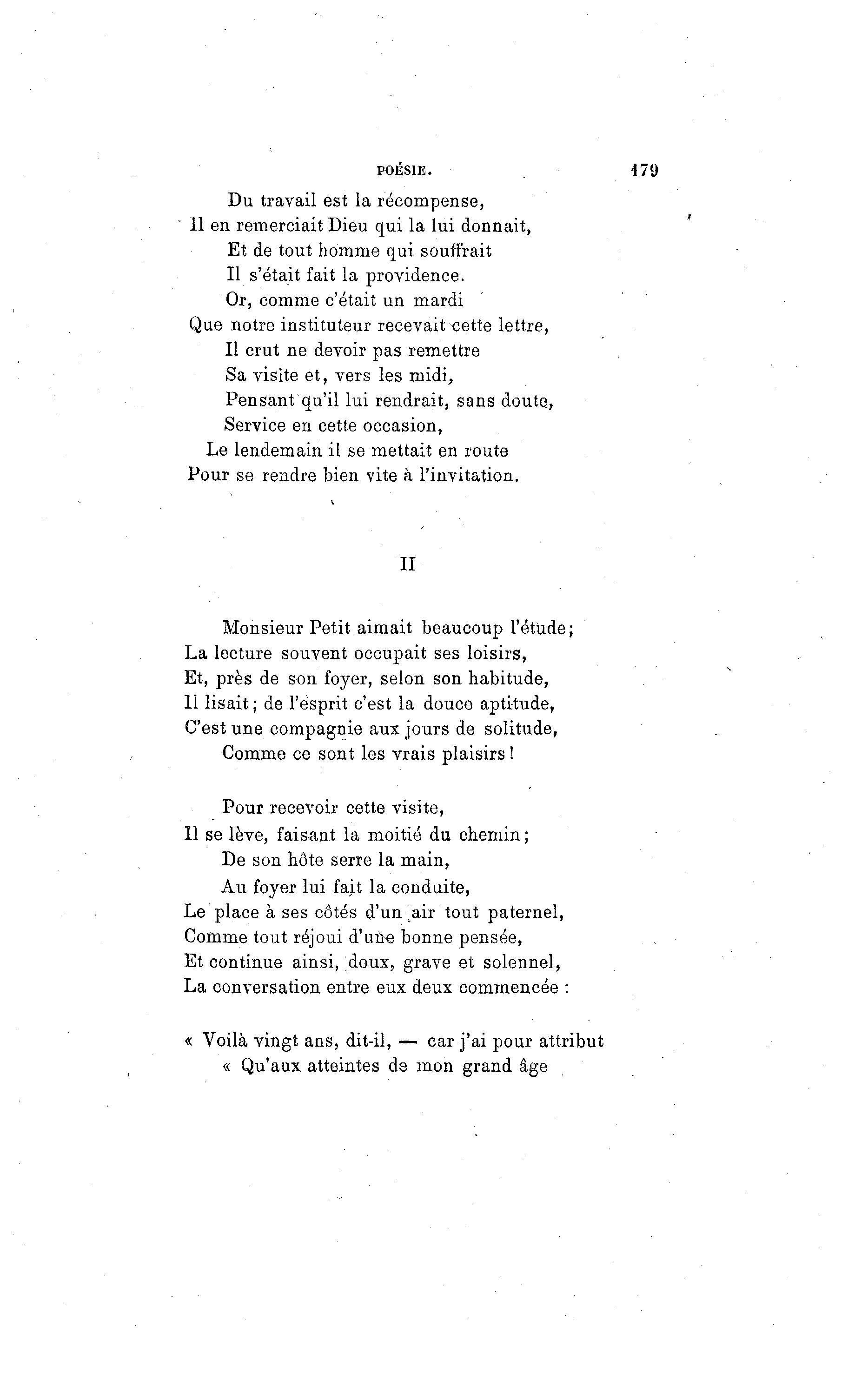 POÉSIE. 179 Du travail est la récompense, 11 en remerciait Dieu qui la lui donnait, Et de tout homme qui souffrait Il s'était fait la providence. Or, comme c'était un mardi Que notre instituteur recevait cette lettre, Il crut ne devoir pas remettre Sa visite et, vers les midi, Pensant qu'il lui rendrait, sans doute, Service en cette occasion, Le lendemain il se mettait en route Pour se rendre bien vite à l'invitation. II Monsieur Petit aimait beaucoup l'étude; La lecture souvent occupait ses loisirs, Et, près de son foyer, selon son habitude, 11 lisait; de l'esprit c'est la douce aptitude, C'est une compagnie aux jours de solitude, Comme ce sont les vrais plaisirs ! Pour recevoir cette visite, Il se lève, faisant la moitié du chemin ; De son hôte serre la main, Au foyer lui fait la conduite, Le place à ses côtés d'un _air tout paternel, Comme tout réjoui d'une bonne pensée, Et continue ainsi, doux, grave et solennel, La conversation entre eux deux commencée : « Voilà vingt ans, dit-il, — car j'ai pour attribut « Qu'aux atteintes da mon grand âge