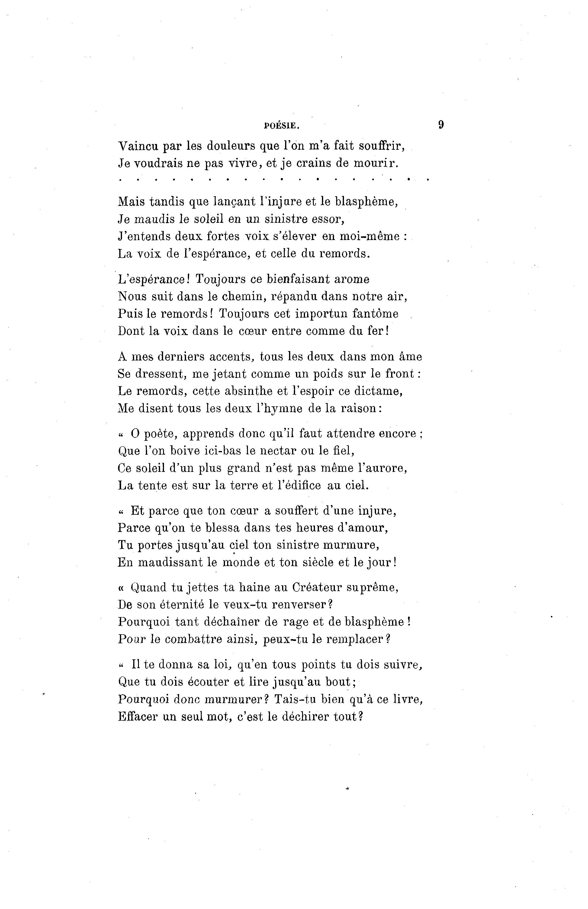 POÉSIE. 9 Vaincu par les douleurs que l'on m'a fait souffrir, Je voudrais ne pas vivre, et je crains de mourir. Mais tandis que lançant l'injure et le blasphème, Je maudis le soleil en un sinistre essor, J'entends deux fortes voix s'élever en moi-même : La voix de l'espérance, et celle du remords. L'espérance! Toujours ce bienfaisant arôme Nous suit dans le chemin, répandu dans notre air, Puis le remords ! Toujours cet importun fantôme Dont la voix dans le coeur entre comme du fer ! A mes derniers accents, tous les deux dans mon âme Se dressent, me jetant comme un poids sur le front : Le remords, cette absinthe et l'espoir ce dictame, Me disent tous les deux l'hymne de la raison : « 0 poète, apprends donc qu'il faut attendre encore ; Que l'on boive ici-bas le nectar ou le fiel, Ce soleil d'un plus grand n'est pas même l'aurore, La tente est sur la terre et l'édifice au ciel. « Et parce que ton cœur a souffert d'une injure, Parce qu'on te blessa dans tes heures d'amour, Tu portes jusqu'au ciel ton sinistre murmure, En maudissant le monde et ton siècle et le jour! « Quand tu jettes ta haine au Créateur suprême, De son éternité le veux-tu renverser? Pourquoi tant déchaîner de rage et de blasphème ! Pour le combattre ainsi, peux-tu le remplacer? « Il te donna sa loi, qu'en tous points tu dois suivre, Que tu dois écouter et lire jusqu'au bout; Pourquoi donc murmurer? Tais-tu bien qu'à ce livre, Effacer un seul mot, c'est le déchirer tout?