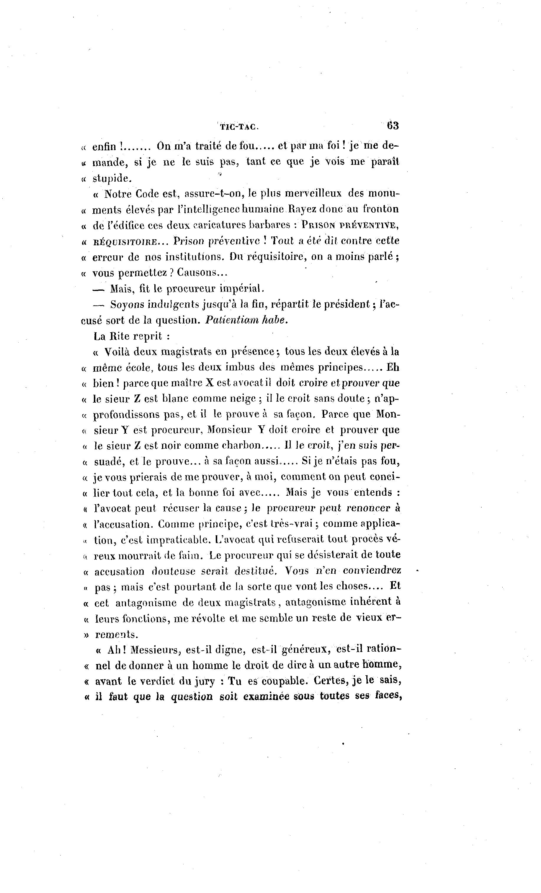TIC-TAC. 63 « enfin ! On m'a traité de fou et par ma foi ! je me de- « mande, si je ne le suis pas, tant ce que je vois me paraît « stupide. « Notre Code est, assure-t-on, le plus merveilleux des menu- et ments élevés par l'intelligence humaine.Rayez donc au fronton « de l'édifice ces deux caricatures barbares : PRISON PRÉVENTIVE, « RÉQ(JISITO!RE... Prison préventive ! Tout a été dit contre cette « erreur de nos institutions. Du réquisitoire, on a moins parlé ; « vous permettes ? Causons... — Mais, fit le procureur impérial. —• Soyons indulgents jusqu'à la fin, répartit le président ; l'ac- cusé sort de la question. Patientiarn habe. La Rite reprit : « Voilà deux magistrats en présence -, tous les deux élevés à la « même école, tous les deux imbus des mêmes principes Eh « bien ! parce que maître X est avocat il doit croire et prouver que « le sieur Z est blanc comme neige ; il le croit sans doute ; n'ap- « profondissons pas, et il le prouve à sa façon. Parce que Mon- « sieur Y est procureur, Monsieur Y doit croire et prouver que « le sieur Z est noir comme charbon Il le croit, j'en suis per- te suadé, et le prouve... à sa façon aussi. Si je n'étais pas fou, « je vous prierais de me prouver, à moi, comment on peut conci- « lier tout cela, et la bonne foi avec Mais je vous entends : « l'avocat peut récuser la cause; le procureur peut renoncer à « l'accusation. Comme principe, c'est très-vrai ; comme applica- « tion, c'est impraticable. L'avocat qui refuserait tout procès vé- « reux mourrait de faiin. Le procureur qui se désisterait de toute « accusation douteuse serait destitué. Vous n'en conviendrez « pas ; mais c'est pourtant de la sorte que vont les choses Et « cet antagonisme de deux magistrats , antagonisme inhérent à « leurs fonctions, me révolte et me semble un reste de vieux er- » rements. « Ali ! Messieurs, est-il digne, est-il généreux, est-il ration- « nel de donner à un homme le droit de dire à un autre homme, « avant le verdict du jury : Tu es coupable. Certes, je le sais, « il faut que la question soit examinée sous toutes ses faces,