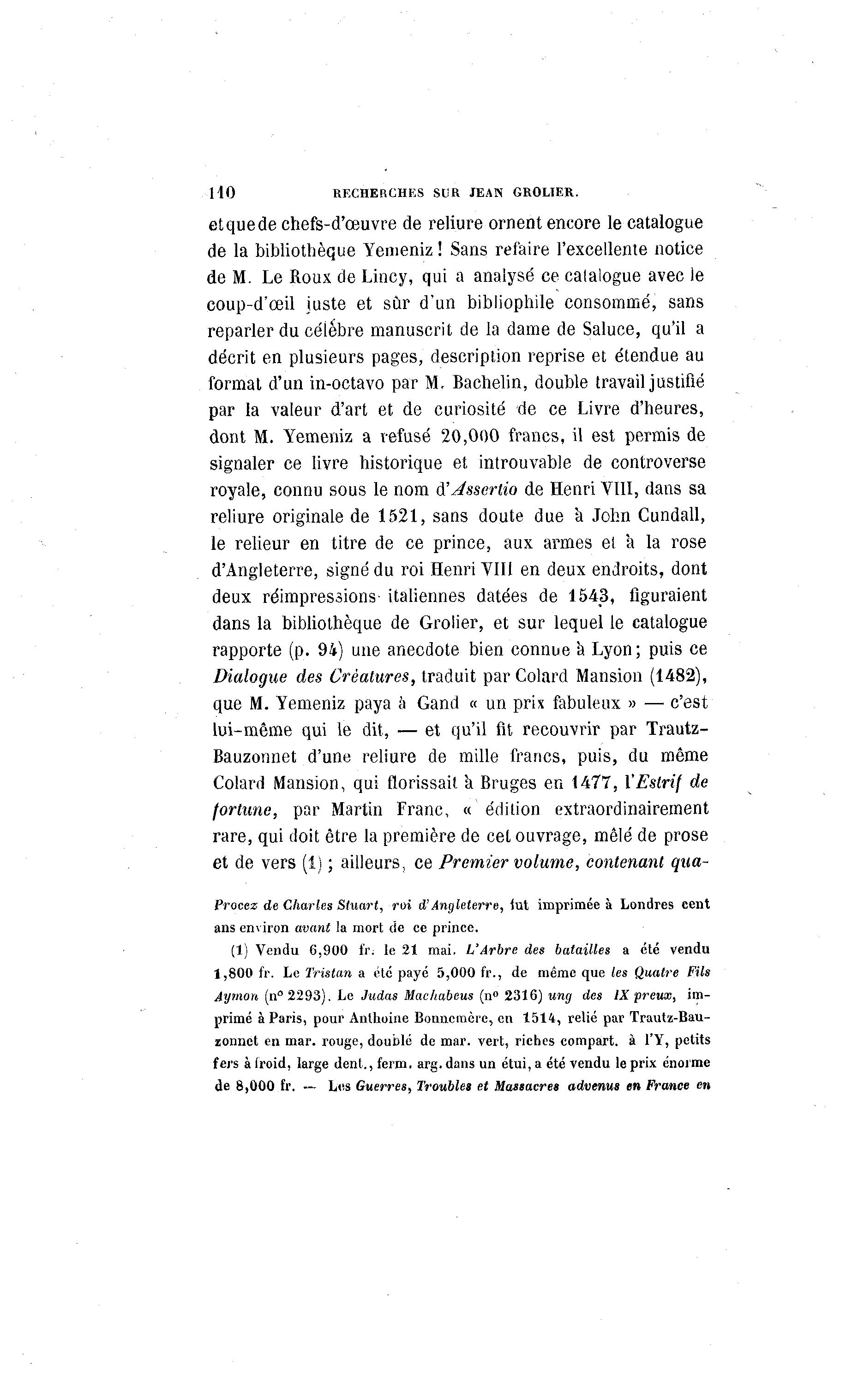 HO RECHERCHES SUR JEAN GROLIER. et que de chefs-d'œuvre de reliure ornent encore le catalogue de la bibliothèque Yemeniz ! Sans refaire l'excellente notice de M. Le Roux de Lincy, qui a analysé ce catalogue avec le coup-d'œil juste et sûr d'un bibliophile consommé, sans reparler du célèbre manuscrit de la dame de Saluce, qu'il a décrit en plusieurs pages, description reprise et étendue au format d'un in-octavo par M, Bachelin, double travail justifié par la valeur d'art et de curiosité de ce Livre d'heures, dont M. Yemeniz a refusé 20,000 francs, il est permis de signaler ce livre historique et introuvable de controverse royale, connu sous le nom â'Jsscriio de Henri VIII, dans sa reliure originale de 1521, sans doute due à John Cundall, le relieur en titre de ce prince, aux armes et a la rose d'Angleterre, signé du roi Henri VIII en deux endroits, dont deux réimpressions italiennes datées de 1543, figuraient dans la bibliothèque de Grolier, et sur lequel le catalogue rapporte (p. 94) une anecdote bien connue a Lyon; puis ce Dialogue des Créatures, traduit par Colard Mansion (1482), que M. Yemeniz paya à Gand « un prix fabuleux » — c'est lui-même qui le dit, — et qu'il fit recouvrir par Trautz- Bauzonnet d'une reliure de mille francs, puis, du même Colard Mansion, qui florissait a Bruges en 1477, l'Eslrif de fortune, par Martin Franc, « édition extraordinairement rare, qui doit être la première de cet ouvrage, mêlé de prose et de vers (1) ; ailleurs, ce Premier volume, contenant qua- Procez de Charles Stuart, roi d'Angleterre, lut imprimée à Londres cent ans environ avant la mort de ce prince. (1) Vendu 6,900 fi\ le 21 mai. L'Arbre des batailles a été vendu 1,800 fr. Le Tristan a été payé 5,000 fr., de même que les Quatre Fils Aymon (n°2293). Le Judas Machabeus (n° 2316) ung des IX preux, im- primé à Paris, pour Anlhoine Bomicmère, en 1514, relié par Trautz-Bau- zonnet en mar. rouge, doublé de mar. vert, riches compart. à l'Y, petits fers à iroid, large dent., ferm. arg. dans un étui, a été vendu le prix énorme de 8,000 fr. — Les Guerres, Troubles et Massacres advenus en France en