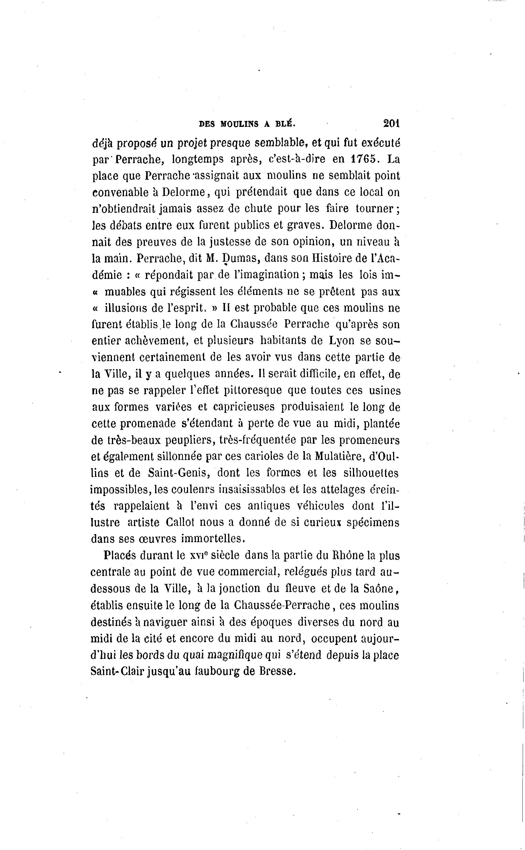 DES MOULINS A BLÉ. 201 déjà propose' un projet presque semblable, et qui fut exécuté par'Perrache, longtemps après, c'est-k-dire en 1765. La place que Perrache -assignait aux moulins ne semblait point convenable à Delorme, qui prétendait que dans ce local on n'obtiendrait jamais assez de chute pour les faire tourner ; les débats entre eux furent publics et graves. Delorme don- nait des preuves de la justesse de son opinion, un niveau à la main. Perrache, dit M. Dumas, dans son Histoire de l'Aca- démie : « répondait par de l'imagination ; mais les lois im- « muables qui régissent les éléments ne se prêtent pas aux « illusions de l'esprit, » II est probable que ces moulins ne furent établis.le long de la Chaussée Perrache qu'après son entier achèvement, et plusieurs habitants de Lyon se sou- viennent certainement de les avoir vus dans cette partie de la Ville, il y a quelques années. Il serait difficile, en effet, de ne pas se rappeler l'effet pittoresque que toutes ces usines aux formes variées et capricieuses produisaient le long de cette promenade s'étendant à perte de vue au midi, plantée de très-beaux peupliers, très-fréquentée par les promeneurs et également sillonnée par ces carioles de la Mulalière, d'Oul- lins et de Saint-Genis, dont les formes et les silhouettes impossibles, les coulenrs insaisissables et les attelages érein- tés rappelaient a l'envi ces antiques véhicules dont l'il- lustre artiste Callot nous a donné de si curieux spécimens dans ses œuvres immortelles. Placés durant le xvie siècle dans la partie du Rhône la plus centrale au point de vue commercial, relégués plus tard au- dessous de la Ville, a la jonction du fleuve et de la Saône, établis ensuite le long de la Chaussée-Perraehe, ces moulins destinés a naviguer ainsi a des époques diverses du nord au midi de la cité et encore du midi au nord, occupent aujour- d'hui les bords du quai magnifique qui s'étend depuis la place Saint-Clair jusqu'au faubourg de Bresse.