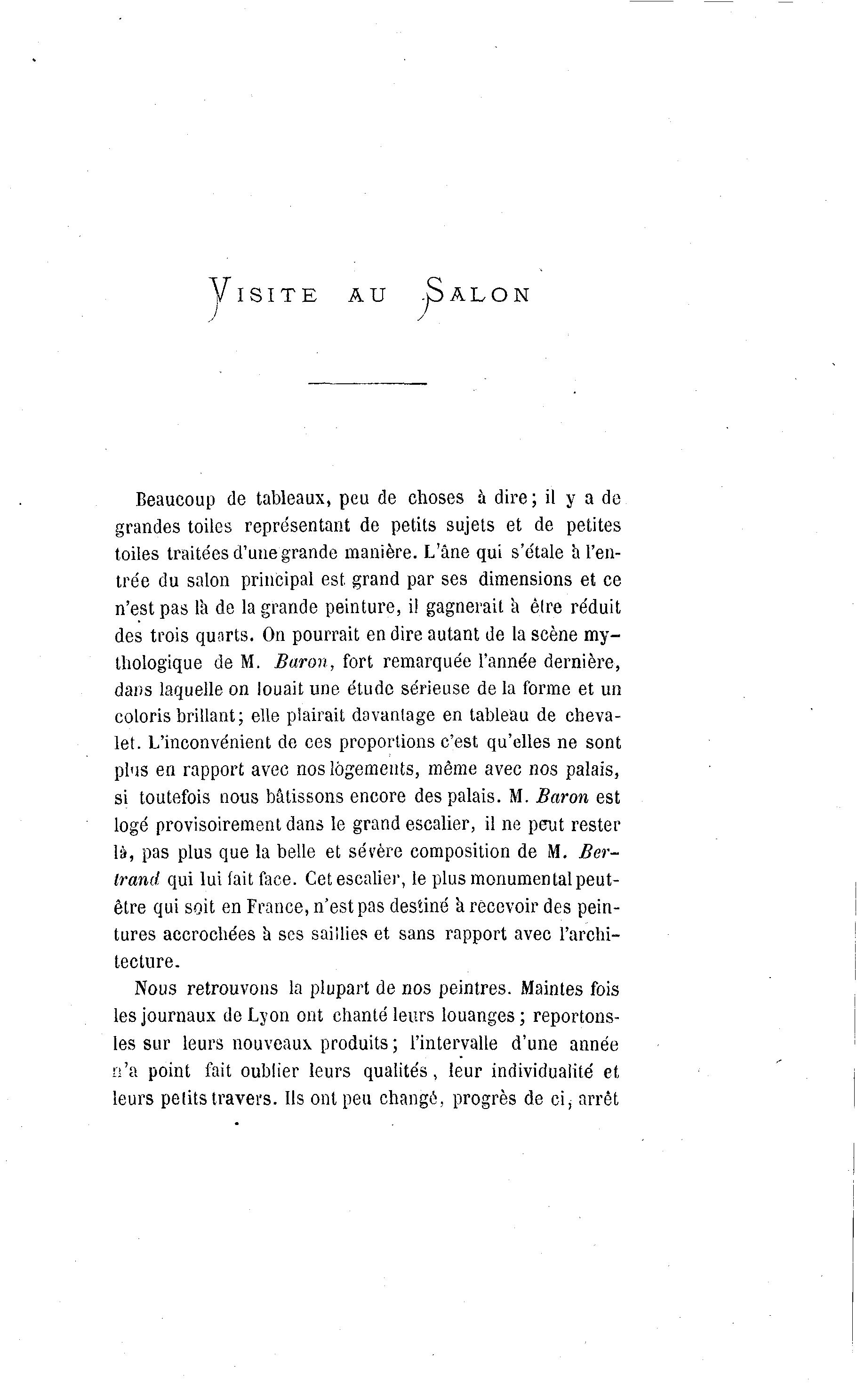 VISITE AU .SALON Beaucoup de tableaux, peu de choses à dire ; il y a de grandes toiles représentant de petits sujets et de petites toiles traitées d'une grande manière. L'âne qui s'étale à l'en- trée du salon principal est grand par ses dimensions et ce n'est pas là de la grande peinture, il gagnerait a êlre réduit des trois quarts. On pourrait en dire autant de la scène my- thologique de M. Baron, fort remarquée l'année dernière, dans laquelle on louait une étude sérieuse de la forme et un coloris brillant; elle plairait davantage en tableau de cheva- let. L'inconvénient de ces proportions c'est qu'elles ne sont plus en rapport avec nos logements, même avec nos palais, si toutefois nous bâtissons encore des palais. M. Baron est logé provisoirement dans le grand escalier, il ne peut rester là , pas plus que la belle et sévère composition de M. Ber- trand qui lui fait face. Cet escalier, le plus monumental peut- être qui soit en France, n'est pas destiné à recevoir des pein- tures accrochées à ses saillies et sans rapport avec l'archi- tecture. Nous retrouvons la plupart de nos peintres. Maintes fois les journaux de Lyon ont chanté leurs louanges ; reportons- les sur leurs nouveaux produits ; l'intervalle d'une année n'a point fait oublier leurs qualités, leur individualité et leurs petits travers. Ils ont peu changé, progrès de ci, arrêt