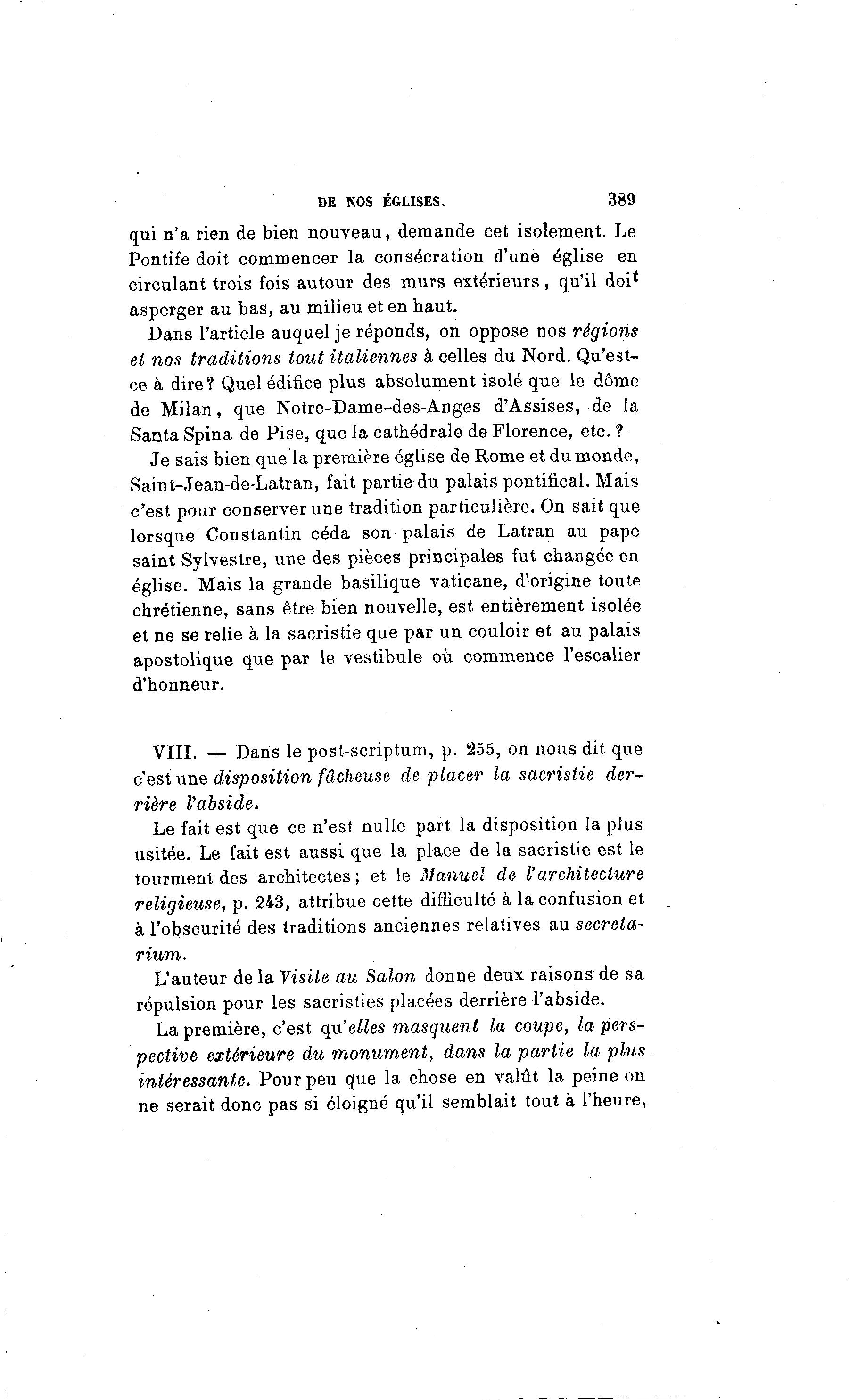DE NOS ÉGLISES. 389 qui n'a rien de bien nouveau, demande cet isolement. Le Pontife doit commencer la consécration d'une église en circulant trois fois autour des murs extérieurs, qu'il doi* asperger au bas, au milieu et en haut. Dans l'article auquel je réponds, on oppose nos régions et nos traditions tout italiennes à celles du Nord. Qu'est- ce à dire? Quel édifice plus absolument isolé que le dôme de Milan, que Notre-Dame-des-Anges d'Assises, de la Santa Spina de Pise, que la cathédrale de Florence, etc. ? J e sais bien que la première église de Rome et du monde, Saint-Jean-de-Latran, fait partie du palais pontifical. Mais c'est pour conserver une tradition particulière. On sait que lorsque Constantin céda son palais de Latran au pape saint Sylvestre, une des pièces principales fut changée en église. Mais la grande basilique vaticane, d'origine toute chrétienne, sans être bien nouvelle, est entièrement isolée et ne se relie à la sacristie que par un couloir et au palais apostolique que par le vestibule où commence l'escalier d'honneur. VIII. — Dans le post-scriptum, p. 255, on nous dit que c'est une disposition fâcheuse déplacer la sacristie der- rière l'abside, Le fait est que ce n'est nulle part la disposition la plus usitée. Le fait est aussi que la place de la sacristie est le tourment des architectes ; et le Manuel de l'architecture religieuse, p. 243, attribue cette difficulté à la confusion et à l'obscurité des traditions anciennes relatives au secreta- rium. L'auteur de la Visite au Salon donne deux raisons-de sa répulsion pour les sacristies placées derrière l'abside. La première, c'est qu'eues masquent la coupe, la pers- pective extérieure du monument, dans la partie la plus intéressante. Pour peu que la chose en valût la peine on ne serait donc pas si éloigné qu'il semblait tout à l'heure,