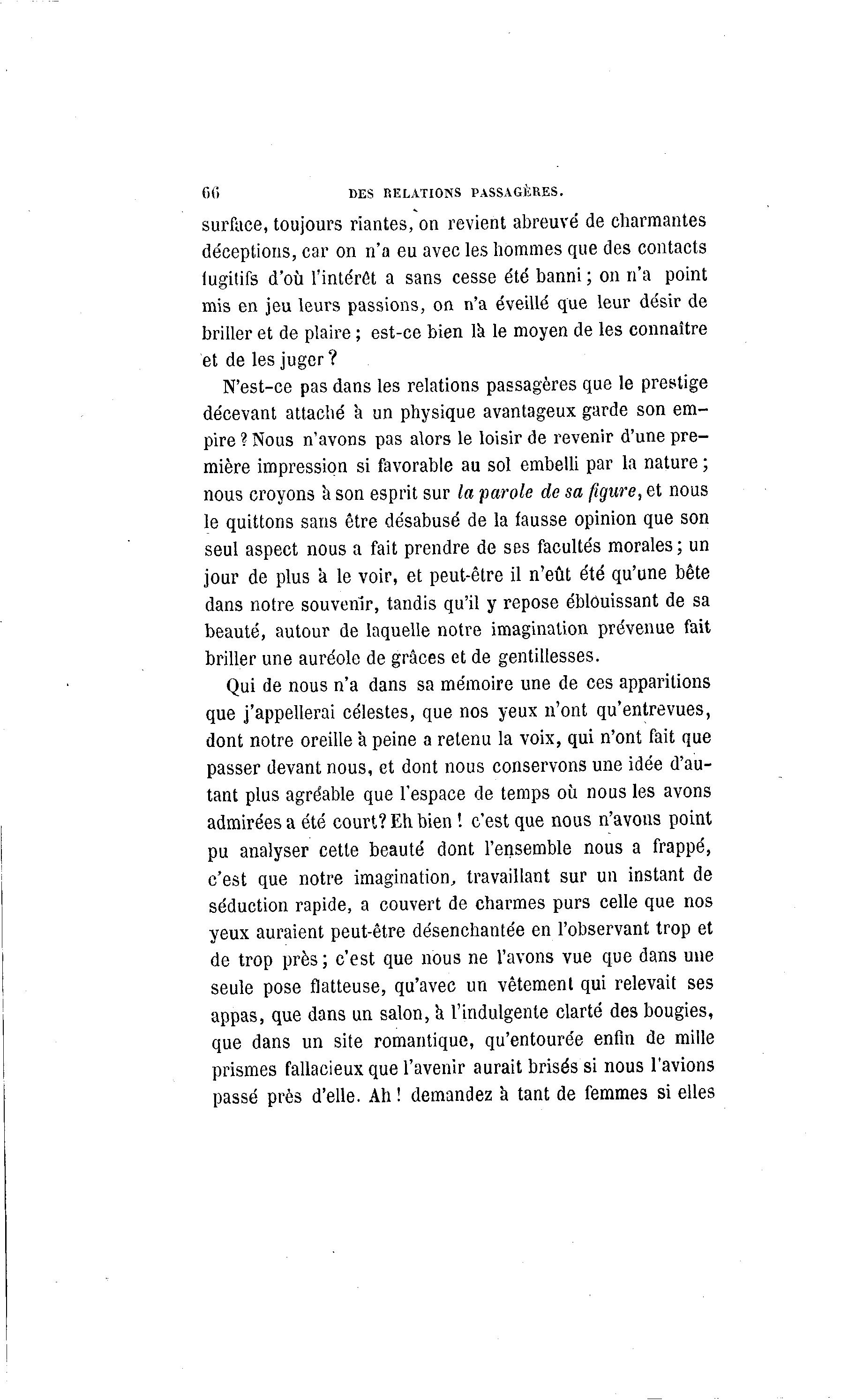 00 DES RELATIONS PASSAGÈRES. surface, toujours riantes, on revient abreuvé de charmantes déceptions, car on n'a eu avec les hommes que des contacts fugitifs d'où l'intérêt a sans cesse été banni ; on n'a point mis en jeu leurs passions, on n'a éveillé que leur désir de briller et de plaire ; est-ce bien la le moyen de les connaître et de les juger? N'est-ce pas dans les relations passagères que le prestige décevant attaché a un physique avantageux garde son em- pire ? Nous n'avons pas alors le loisir de revenir d'une pre- mière impression si favorable au sol embelli par la nature ; nous croyons à son esprit sur la parole de sa figure, et nous le quittons sans être désabusé de la fausse opinion que son seul aspect nous a fait prendre de ses facultés morales; un jour de plus a le voir, et peut-être il n'eût été qu'une bête dans notre souvenir, tandis qu'il y repose éblouissant de sa beauté, autour de laquelle notre imagination prévenue fait briller une auréole de grâces et de gentillesses. Qui de nous n'a dans sa mémoire une de ces apparitions que j'appellerai célestes, que nos yeux n'ont qu'entrevues, dont notre oreille à peine a retenu la voix, qui n'ont fait que passer devant nous, et dont nous conservons une idée d'au- tant plus agréable que l'espace de temps où nous les avons admirées a été court? Eh bien 1 c'est que nous n'avons point pu analyser cette beauté dont l'ensemble nous a frappé, c'est que notre imagination, travaillant sur un instant de séduction rapide, a couvert de charmes purs celle que nos yeux auraient peut-être désenchantée en l'observant trop et de trop près ; c'est que nous ne l'avons vue que dans une seule pose flatteuse, qu'avec un vêtement qui relevait ses appas, que dans un salon, a l'indulgente clarté des bougies, que dans un site romantique, qu'entourée enfin de mille prismes fallacieux que l'avenir aurait brisés si nous l'avions passé près d'elle. Ah ! demandez à tant de femmes si elles