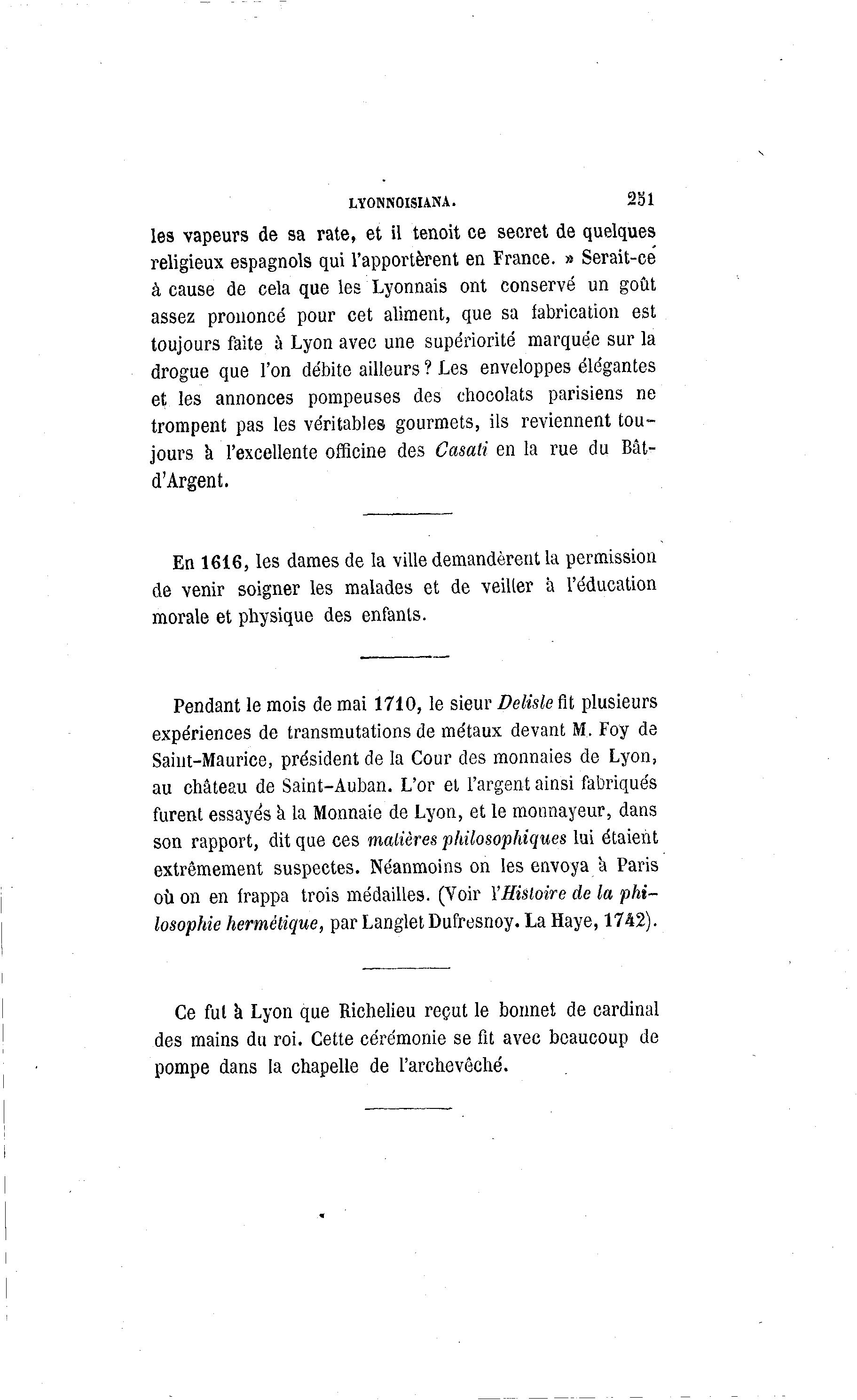 LYONNOISUNA. 2S1 les vapeurs de sa rate, et il tenoit ce secret de quelques religieux espagnols qui l'apportèrent en France. » Serait-ce à cause de cela que les Lyonnais ont conservé un goût assez prononcé pour cet aliment, que sa fabrication est toujours faite à Lyon avec une supériorité marquée sur la drogue que l'on débite ailleurs ? Les enveloppes élégantes et les annonces pompeuses des chocolats parisiens ne trompent pas les véritables gourmets, ils reviennent tou- jours a l'excellente officine des Casati en la rue du Bât- d'Argent. En 1616, les dames de la ville demandèrent la permission de venir soigner les malades et de veiller à l'éducation morale et physique des enfants. Pendant le mois de mai 1710, le sieur Delisle fit plusieurs expériences de transmutations de métaux devant M, Foy de Saint-Maurice, président de la Cour des monnaies de Lyon, au château de Saint-Auban. L'or et l'argent ainsi fabriqués furent essayés a la Monnaie de Lyon, et le monnayeur, dans son rapport, dit que ces matières philosophiques lui étaient extrêmement suspectes. Néanmoins on les envoya à Paris où on en frappa trois médailles. (Voir YHisloire de la phi- losophie hermétique, par Langlet Dufresnoy. La Haye, 1742). Ce fut à Lyon que Richelieu reçut le bonnet de cardinal des mains du roi. Cette cérémonie se fit avec beaucoup de pompe dans la chapelle de l'archevêché.