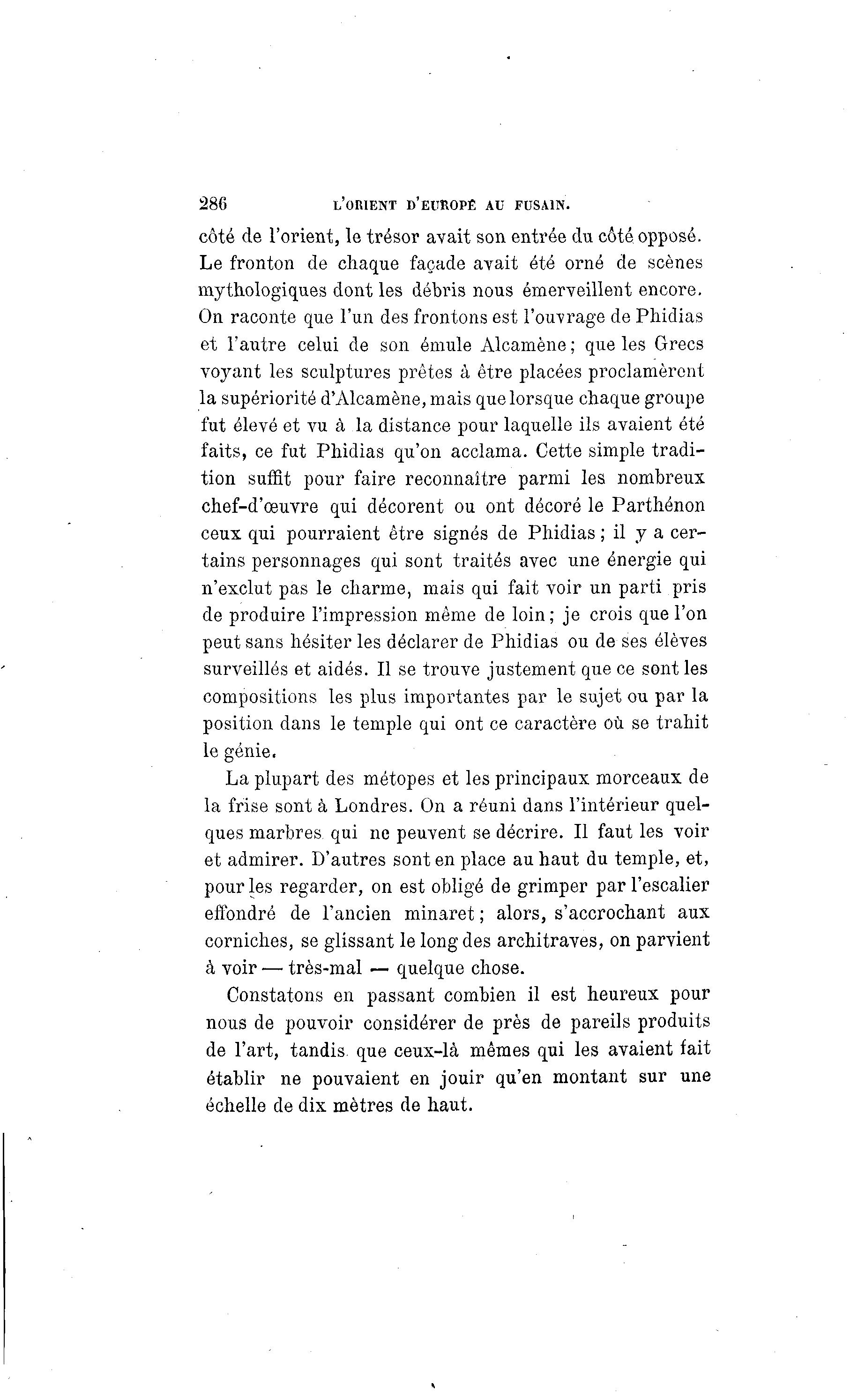 286 L'ORIENT D'EUROPÊ AU FUSAIN. côté de l'orient, le trésor avait son entrée du côté opposé. Le fronton de chaque façade avait été orné de scènes mythologiques dont les débris nous émerveillent encore. On raconte que l'un des frontons est l'ouvrage de Phidias et l'autre celui de son émule Alcamène ; que les Grecs voyant les sculptures prêtes à être placées proclamèrent la supériorité d'Alcamène, mais que lorsque chaque groupe fut élevé et vu à la distance pour laquelle ils avaient été faits, ce fut Phidias qu'on acclama. Cette simple tradi- tion suffit pour faire reconnaître parmi les nombreux chef-d'œuvre qui décorent ou ont décoré le Parthénon ceux qui pourraient être signés de Phidias ; il y a cer- tains personnages qui sont traités avec une énergie qui n'exclut pas le charme, mais qui fait voir un parti pris de produire l'impression même de loin; je crois que l'on peut sans hésiter les déclarer de Phidias ou de ses élèves surveillés et aidés. Il se trouve justement que ce sont les compositions les plus importantes par le sujet ou par la position dans le temple qui ont ce caractère où se trahit le génie, La plupart des métopes et les principaux morceaux de la frise sont à Londres. On a réuni dans l'intérieur quel- ques marbres qui ne peuvent se décrire. Il faut les voir et admirer. D'autres sont en place au haut du temple, et, pour les regarder, on est obligé de grimper par l'escalier effondré de l'ancien minaret ; alors, s'accrochant aux corniches, se glissant le long des architraves, on parvient à voir — très-mal — quelque chose. Constatons en passant combien il est heureux pour nous de pouvoir considérer de près de pareils produits de l'art, tandis que ceux-là mêmes qui les avaient fait établir ne pouvaient en jouir qu'en montant sur une échelle de dix mètres de haut.
