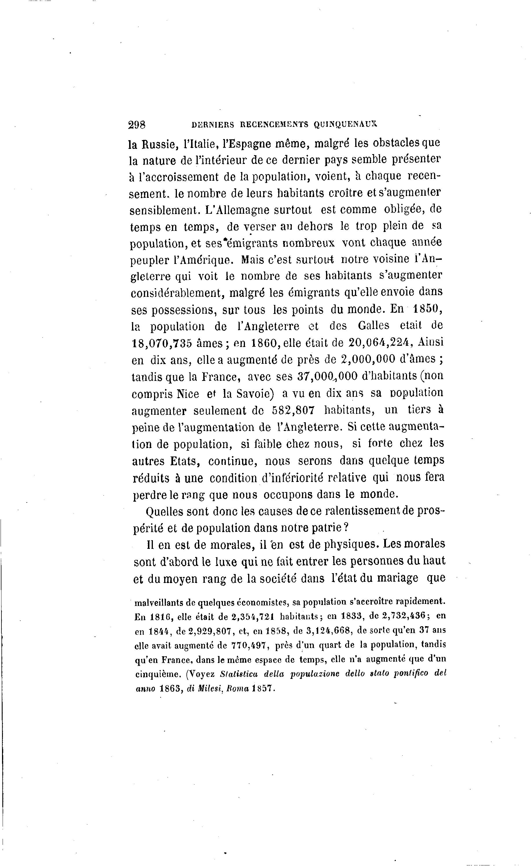 298 DERNIERS RECENCEMENTS QL'INftUENAUX la Russie, l'Italie, l'Espagne même, malgré les obstacles que la nature de l'intérieur de ce dernier pays semble présenter a l'accroissement de la population, voient, à chaque recen- sement, le nombre de leurs habitants croître et s'augmenter sensiblement. L'Allemagne surtout est comme obligée, de temps en temps, de verser an dehors le trop plein de sa population, et ses*émigrants nombreux vont chaque année peupler l'Amérique. Mais c'est surtout notre voisine i'An- glelerre qui voit le nombre de ses habitants s'augmenter considérablement, malgré les emigrants qu'elle envoie dans ses possessions, sur tous les points du monde. En 1850, la population de l'Angleterre et des Galles etail de 18,070,735 âmes; en 1860,elle était de 20,064,224, Ainsi en dix ans, elle a augmenté de près de 2,000,000 d'âmes ; tandis que la France, avec ses 37,000^000 d'habitants (non compris Nice et la Savoie) a vu en dix ans sa nopulation augmenter seulement de 582,807 habitants, un tiers à peine de l'augmentation de l'Angleterre. Si cette augmenta- lion de population, si faible chez nous, si forte chez les autres Etats, continue, nous serons dans quelque temps réduits aune condition d'infériorité relative qui nous fera perdre le rang que nous occupons dans le monde. Quelles sont donc les causes de ce ralentissement de pros- périté et de population dans notre patrie ? Il en est de morales, il 'en est de physiques. Les morales sont d'abord le luxe qui ne fait entrer les personnes du haut et du moyen rang de la société dans l'état du mariage que malveillants de quelques économistes, sa population s'accroître rapidement. En 1816, elle était de 2,354,721 habitants; en 1833, de 2,732,436; en en 1844, de 2,929,807, et, en 1858, de 3,124,668, de sorte qu'en 37 ans elle avait augmenté de 770,497, près d'un quart de la population, tandis qu'en France, dans le même espace de temps, elle n'a augmenté que d'un cinquième. (Voyez Slatislica délia populazione dello atato ponlifico del anno 1863, di Milesi. Borna 1857.