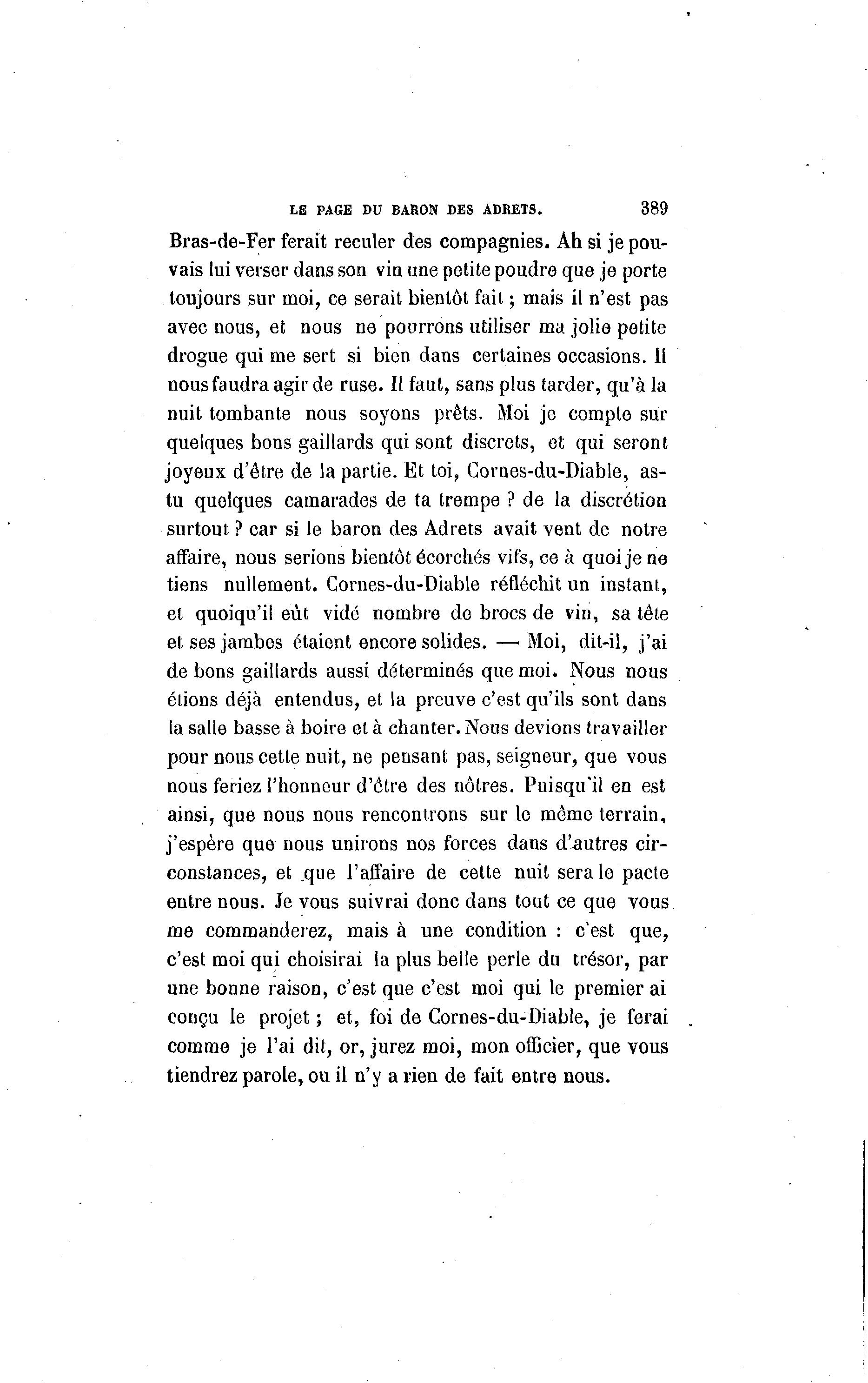 LE PAGE DU BARON DES ADRETS. 389 Bras-de-Fer ferait reculer des compagnies. Ah si je pou- vais lui verser dans son vin une petite poudre que je porte toujours sur moi, ce serait bientôt fait ; mais il n'est pas avec nous, et nous ne pourrons utiliser ma jolie petite drogue qui me sert si bien dans certaines occasions. Il nous faudra agir de ruse. Il faut, sans plus tarder, qu'à la nuit tombante nous soyons prêts. Moi je compte sur quelques bons gaillards qui sont discrets, et qui seront joyeux d'être de la partie. Et toi, Corues-du-Diable, as- tu quelques camarades de ta trempe ? de la discrétion surtout ? car si le baron des Adrets avait vent de notre affaire, nous serions bientôt écorchés vifs, ce à quoi je ne tiens nullement. Gornes-du-Diable réfléchit un instant, et quoiqu'il eût vidé nombre de brocs de vin, sa tête et ses jambes étaient encore solides. —• Moi, dit-il, j'ai de bons gaillards aussi déterminés que moi. Nous nous étions déjà entendus, et la preuve c'est qu'ils sont dans la salle basse à boire et à chanter. Nous devions travailler pour nous cette nuit, ne pensant pas, seigneur, que vous nous feriez l'honneur d'être des nôtres. Puisqu'il en est ainsi, que nous nous rencontrons sur le même terrain, j'espère que nous unirons nos forces dans d'autres cir- constances, et _que l'affaire de cette nuit sera le pacte eutre nous. Je vous suivrai donc dans tout ce que vous me commanderez, mais à une condition : c'est que, c'est moi qui choisirai la plus belle perle du trésor, par une bonne raison, c'est que c'est moi qui le premier ai conçu le projet ; et, foi de Cornes-du-Diable, je ferai comme je l'ai dit, or, jurez moi, mon officier, que vous tiendrez parole, ou il n'y a rien de fait entre nous.