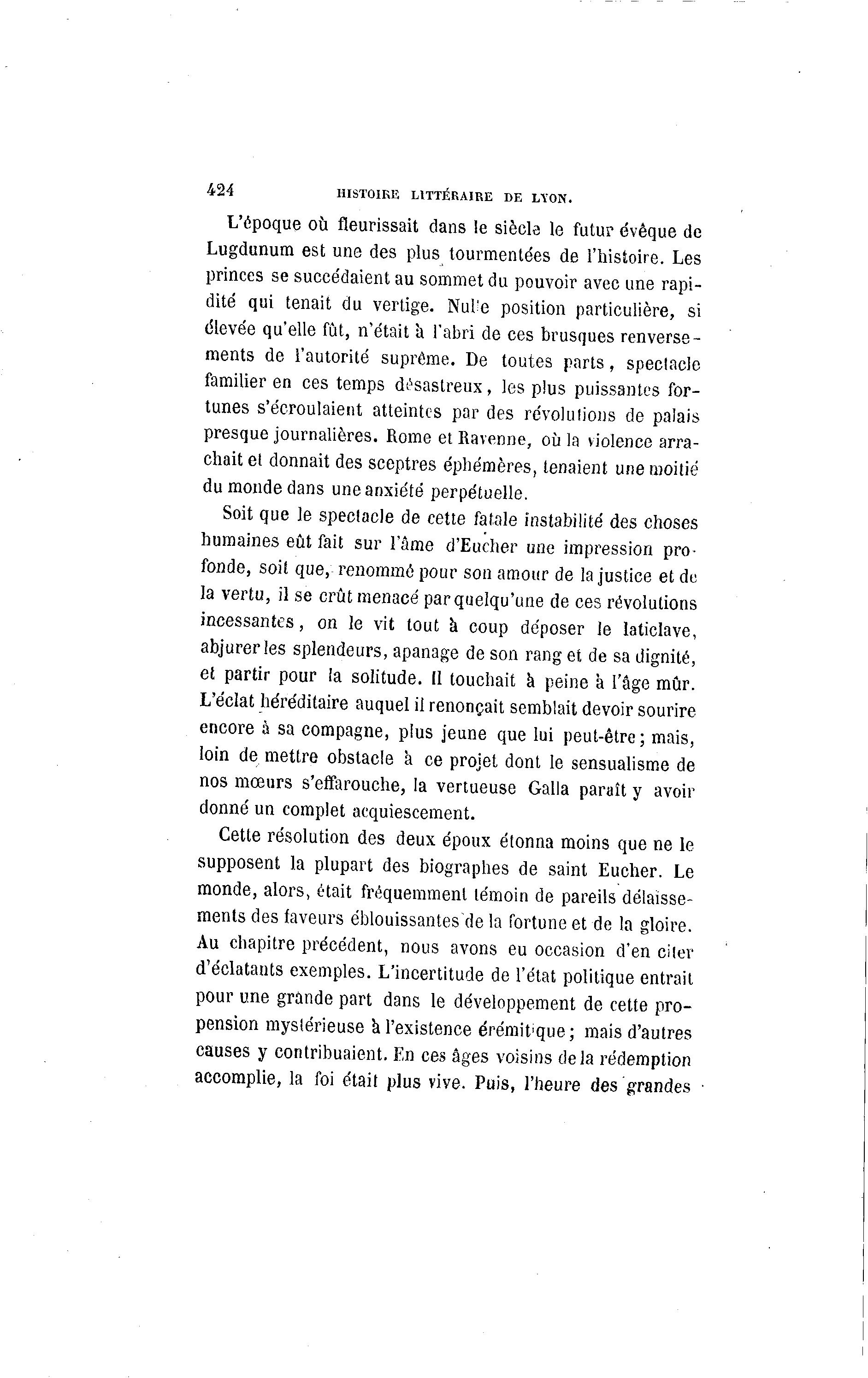 424 HISTOIRE LITTÉRAIRE DE LYON. L'époque où fleurissait dans le siècle le futur évêque de Lugdunum est une des plus tourmentées de l'histoire. Les princes se succédaient au sommet du pouvoir avec une rapi- dité qui tenait du vertige. Nul'e position particulière, si élevée qu'elle fût, n'était à l'abri de ces brusques renverse- ments de l'autorité suprême. De toutes parts, spectacle familier en ces temps désastreux, les plus puissantes for- tunes s'écroulaient atteintes par des révolutions de palais presque journalières. Rome et Ravenne, où la violence arra- chait et donnait des sceptres éphémères, tenaient une moitié du monde dans une anxiété perpétuelle. Soit que le spectacle de cette fatale instabilité des choses humaines eût fait sur l'âme d'Eucher une impression pro- fonde, soit que, renommé pour son amour de la justice et de la vertu, il se crût menacé par quelqu'une de ces révolutions incessantes, on le vit tout à coup déposer le laticlave, abjurer les splendeurs, apanage de son rang et de sa dignité, et partir pour la solitude. (1 touchait à peine à l'âge mûr. L'éclat héréditaire auquel il renonçait semblait devoir sourire encore à sa compagne, plus jeune que lui peut-être; mais, loin de mettre obstacle à ce projet dont le sensualisme de nos mœurs s'effarouche, la vertueuse Galla paraît y avoir donné un complet acquiescement. Cette résolution des deux époux étonna moins que ne le supposent la plupart des biographes de saint Eucher. Le monde, alors, était fréquemment témoin de pareils délaisse- ments des faveurs éblouissantes'de la fortune et de la gloire. Au chapitre précédent, nous avons eu occasion d'en citer d'éclatants exemples. L'incertitude de l'état politique entrait pour une grande part dans le développement de cette pro- pension mystérieuse à l'existence érémit'que; mais d'autres causes y contribuaient. En ces âges voisins delà rédemption accomplie, la foi était plus vive. Puis, l'heure des grandes