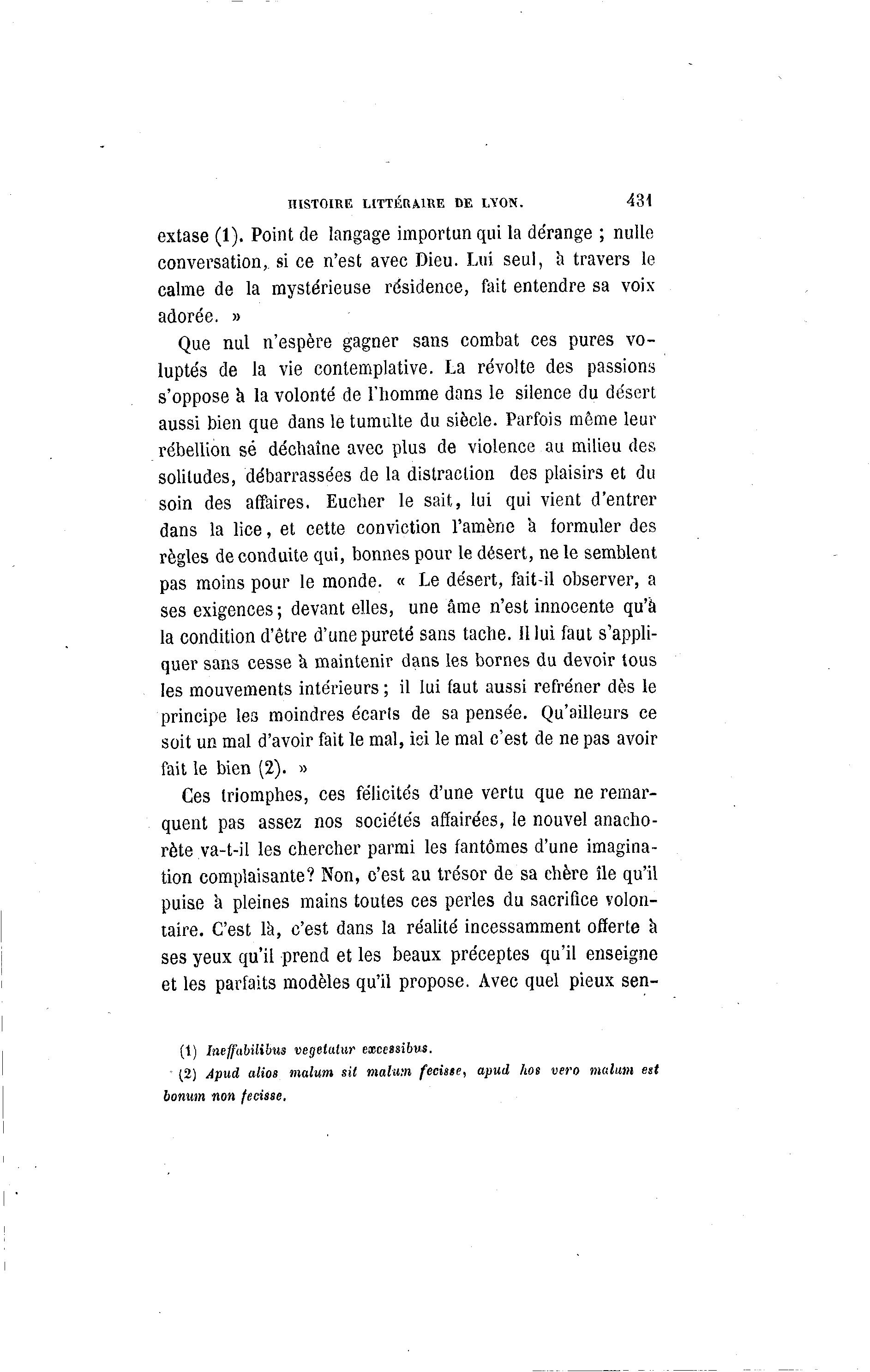 HISTOIRE LITTÉRAIRE DE LYON. 431 extase (1). Point de langage importun qui la dérange ; nulle conversation, si ce n'est avec Dieu. Lui seul, à travers le calme de la mystérieuse résidence, fait entendre sa voix adorée. » Que nul n'espère gagner sans combat ces pures vo- luptés de la vie contemplative. La révolte des passions s'oppose à la volonté de l'homme dans le silence du désert aussi bien que dans le tumulte du siècle. Parfois même leur rébellion se déchaîne avec plus de violence au milieu des solitudes, débarrassées de la distraction des plaisirs et du soin des affaires. Eucher le sait, lui qui vient d'entrer dans la lice, et cette conviction l'amène à formuler des règles de conduite qui, bonnes pour le désert, ne le semblent pas moins pour le monde. « Le désert, fait-il observer, a ses exigences ; devant elles, une âme n'est innocente qu'à la condition d'être d'une pureté sans tache. 11 lui faut s'appli- quer sans cesse à maintenir dans les bornes du devoir tous les mouvements intérieurs ; il lui faut aussi refréner dès le principe les moindres écarls de sa pensée. Qu'ailleurs ce soit un mal d'avoir fait le mal, ici le mal c'est de ne pas avoir fait le bien (2). » Ces triomphes, ces félicités d'une vertu que ne remar- quent pas assez nos sociétés affairées, le nouvel anacho- rète va-t-il les chercher parmi les fantômes d'une imagina- tion complaisante? Non, c'est au trésor de sa chère île qu'il puise a pleines mains toutes ces perles du sacrifice volon- taire. C'est là , c'est dans la réalité incessamment offerte à ses yeux qu'il prend et les beaux préceptes qu'il enseigne et les parfaits modèles qu'il propose. Avec quel pieux sen- (t) Ineffabilibus vegetatur eœeessiims. (2) Âpud ulios malum sit malum fecisse, apud hos vero malum est bonum non fecisse.