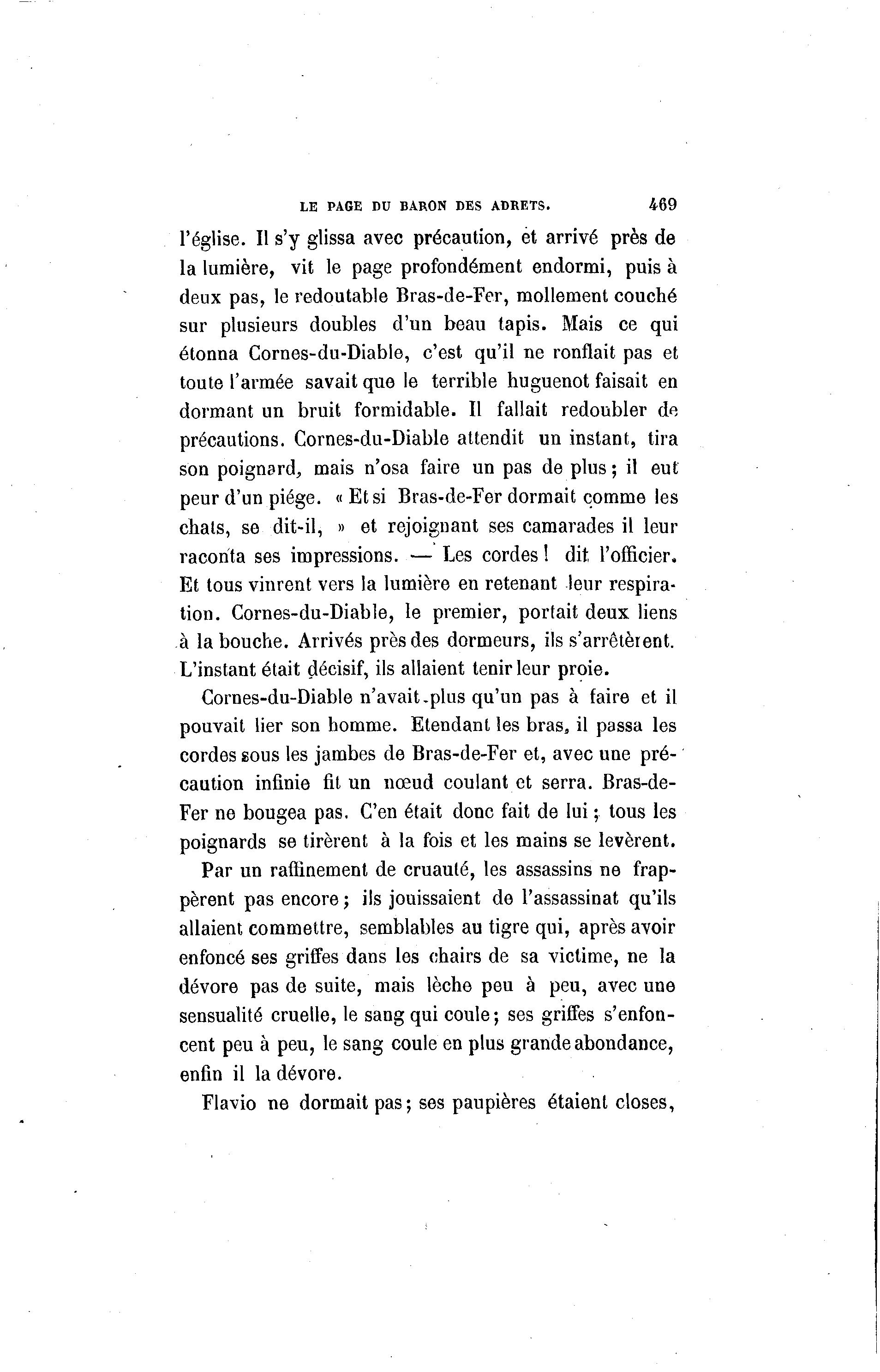 LE PAGE DU BARON DES ADRETS. 469 l'église. Il s'y glissa avec précaution, et arrivé près de la lumière, vit le page profondément endormi, puis à deux pas, le redoutable Bras-de-Fer, mollement couché sur plusieurs doubles d'un beau tapis. Mais ce qui étonna Cornes-du-Diable, c'est qu'il ne ronflait pas et toute l'armée savait que le terrible huguenot faisait en dormant un bruit formidable. Il fallait redoubler de précautions. Cornes-du-Diable attendit un instant, tira son poignard, mais n'osa faire un pas de plus ; il eut peur d'un piège. « Et si Bras-de-Fer dormait comme les chats, se dit-il, » et rejoignant ses camarades il leur raconta ses impressions. — Les cordes ! dit l'officier. Et tous vinrent vers la lumière en retenant leur respira- tion. Cornes-du-Diable, le premier, portait deux liens à la bouche. Arrivés près des dormeurs, ils s'arrêtèient. L'instant était décisif, ils allaient tenir leur proie. Cornes-du-Diable n'avait .plus qu'un pas à faire et il pouvait lier son homme. Etendant les bras, il passa les cordes sous les jambes de Bras-de-Fer et, avec une pré- caution infinie fit un nœud coulant et serra. Bras-de- Fer ne bougea pas. C'en était donc fait de lui ; tous les poignards se tirèrent à la fois et les mains se levèrent. Par un raffinement de cruauté, les assassins ne frap- pèrent pas encore ; ils jouissaient de l'assassinat qu'ils allaient commettre, semblables au tigre qui, après avoir enfoncé ses griffes dans les chairs de sa victime, ne la dévore pas de suite, mais lèche peu à peu, avec une sensualité cruelle, le sang qui coule; ses griffes s'enfon- cent peu à peu, le sang coule en plus grande abondance, enfin il la dévore. Flavio ne dormait pas; ses paupières étaient closes,