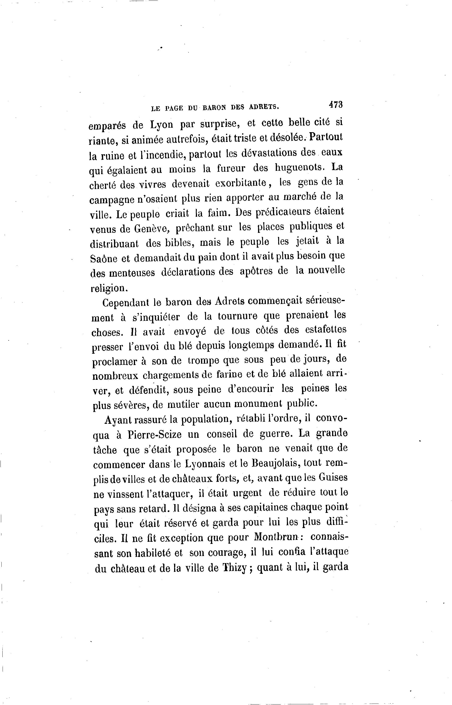 LE PAGE DU BARON DES ADRETS. 473 emparés de Lyon par surprise, et cette belle cité si riante, si animée autrefois, était triste et désolée. Partout la ruine et l'incendie, partout les dévastations des eaux qui égalaient au moins la fureur des huguenots. La cherté des vivres devenait exorbitante, les gens de la campagne n'osaient plus rien apporter au marché de la ville. Le peuple criait la faim. Des prédicateurs étaient venus de Genève, prêchant sur les places publiques et distribuant des bibles, mais le peuple les jetait à la Saône et demandait du pain dont il avait plus besoin que des menteuses déclarations des apôtres de la nouvelle religion. Cependant le baron des Adrets commençait sérieuse- ment à s'inquiéter de la tournure que prenaient les choses. Il avait envoyé de tous côtés des estafettes presser l'envoi du blé depuis longtemps demandé. Il fit proclamer à son de trompe que sous peu de jours, de nombreux chargements de farine et de blé allaient arri- ver, et défendit, sous peine d'encourir les peines les plus sévères, de mutiler aucun monument public. Ayant rassuré la population, rétabli l'ordre, il convo- qua à Pierre-Scize un conseil de guerre. La grande tâche que s'était proposée le baron ne venait que de commencer dans le Lyonnais et le Beaujolais, tout rem- plis de villes et de châteaux forts, et, avant que les Guises ne vinssent l'attaquer, il était urgent de réduire tout le pays sans retard. Il désigna à ses capitaines chaque point qui leur était réservé et garda pour lui les plus diffi- ciles. Il ne fit exception que pour Montbrun: connais- sant son habileté et son courage, il lui confia l'attaque du château et de la ville de Thizy ; quant à lui, il garda