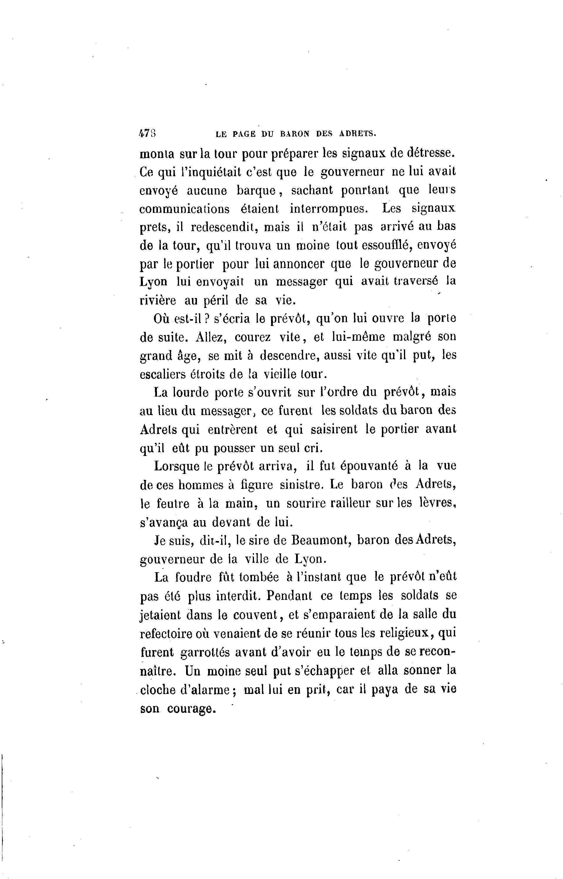 47S LE PAGE DU BARON DES ADRETS. monta sur la tour pour préparer les signaux de détresse. Ce qui l'inquiétait c'est que le gouverneur ne lui avait envoyé aucune barque, sachant ponrtant que leurs communications étaient interrompues. Les signaux prêts, il redescendit, mais il n'était pas arrivé au bas de la tour, qu'il trouva un moine tout essoufflé, envoyé par le portier pour lui annoncer que le gouverneur de Lyon lui envoyait un messager qui avait traversé la rivière au péril de sa vie. Où est-il ? s'écria le prévôt, qu'on lui ouvre la porle de suite. Allez, courez vite, et lui-même malgré son grand âge, se mit à descendre, aussi vite qu'il put, les escaliers étroits de la vieille tour. La lourde porte s'ouvrit sur l'ordre du prévôt, mais au lieu du messager, ce furent les soldats du baron des Adrets qui entrèrent et qui saisirent le portier avant qu'il eût pu pousser un seul cri. Lorsque le prévôt arriva, il fut épouvanté à la vue de ces hommes à figure sinistre. Le baron o'es Adrets, le feutre à la main, un sourire railleur sur les lèvres, s'avança au devant de lui. Je suis, dit-il, le sire de Beaumont, baron des Adrets, gouverneur de la ville de Lyon. La foudre fût tombée à l'instant que le prévôt n'eût pas été plus interdit. Pendant ce temps les soldats se jetaient dans le couvent, et s'emparaient de la salle du réfectoire où venaient de se réunir tous les religieux, qui furent garrottés avant d'avoir eu le temps de se recon- naître. Un moine seul put s'échapper et alla sonner la cloche d'alarme; mal lui en prit, car il paya de sa vie son courage.