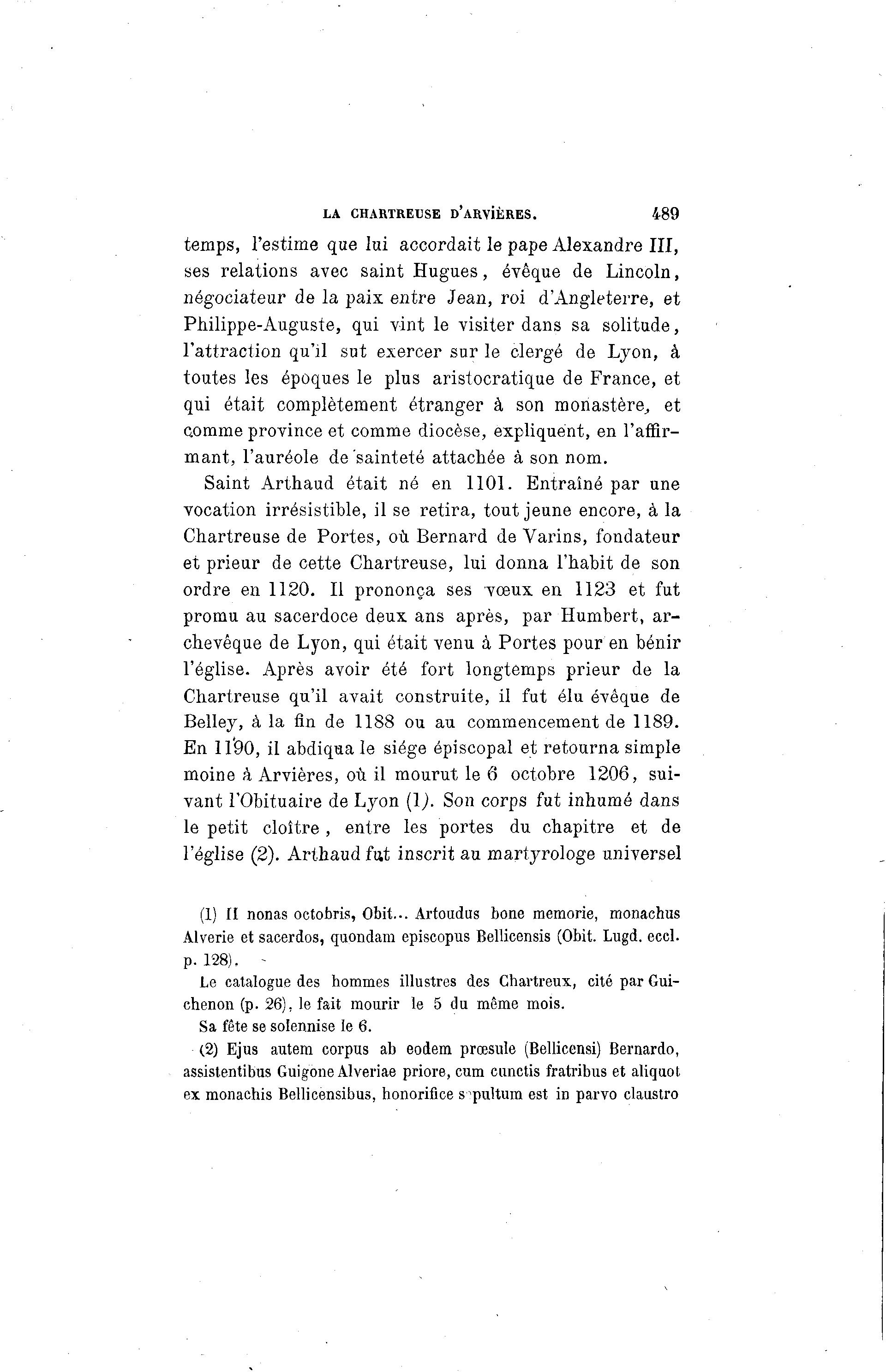 LA CHARTREUSE D'ARviËRES. 489 temps, l'estime que lui accordait le pape Alexandre III, ses relations avec saint Hugues, évêque de Lincoln, négociateur de la paix entre Jean, roi d'Angleterre, et Philippe-Auguste, qui vint le visiter dans sa solitude, l'attraction qu'il sut exercer sur le clergé de Lyon, à toutes les époques le plus aristocratique de France, et qui était complètement étranger à son monastère,, et comme province et comme diocèse, expliquent, en l'affir- mant, l'auréole de 'sainteté attachée à son nom. Saint Arthaud était né en 1101. Entraîné par une vocation irrésistible, il se retira, tout jeune encore, à la Chartreuse de Portes, où Bernard de Varins, fondateur et prieur de cette Chartreuse, lui donna l'habit de son ordre en 1120. Il prononça ses vœux en 1123 et fut promu au sacerdoce deux ans après, par Humbert, a r - chevêque de Lyon, qui était venu à Portes pour en bénir l'église. Après avoir été fort longtemps prieur de la Chartreuse qu'il avait construite, il fut élu évêque de Belley, à la fin de 1188 ou au commencement de 1189. En 11*90, il abdiqua le siège épiscopal et retourna simple moine à Arvières, où il mourut le 6 octobre 1206, sui- vant l'Obituaire de Lyon (l). Son corps fut inhumé dans le petit cloître, entre les portes du chapitre et de l'église (2). Arthaud fut inscrit au martyrologe universel (1) II nonas octobris, Obit... Artoudus bone memorie, monachus Alverie et sacerdos, quondam episcopus Bellicensis (Obit. Lugd. eccl. p. 128). - Le catalogue des hommes illustres des Chartreux, cité par Gui- chenon (p. 26), le fait mourir le 5 du même mois. Sa fête se solennise le 6. (2) Ejus autem corpus ab eodem prœsule (Bellicensi) Bernardo, assistentibus Guigbne Alveriae priore, cum cunctis fratribus et aliquot ex monachis Bellicensibus, honoriflce spultum est in parvo claustro
