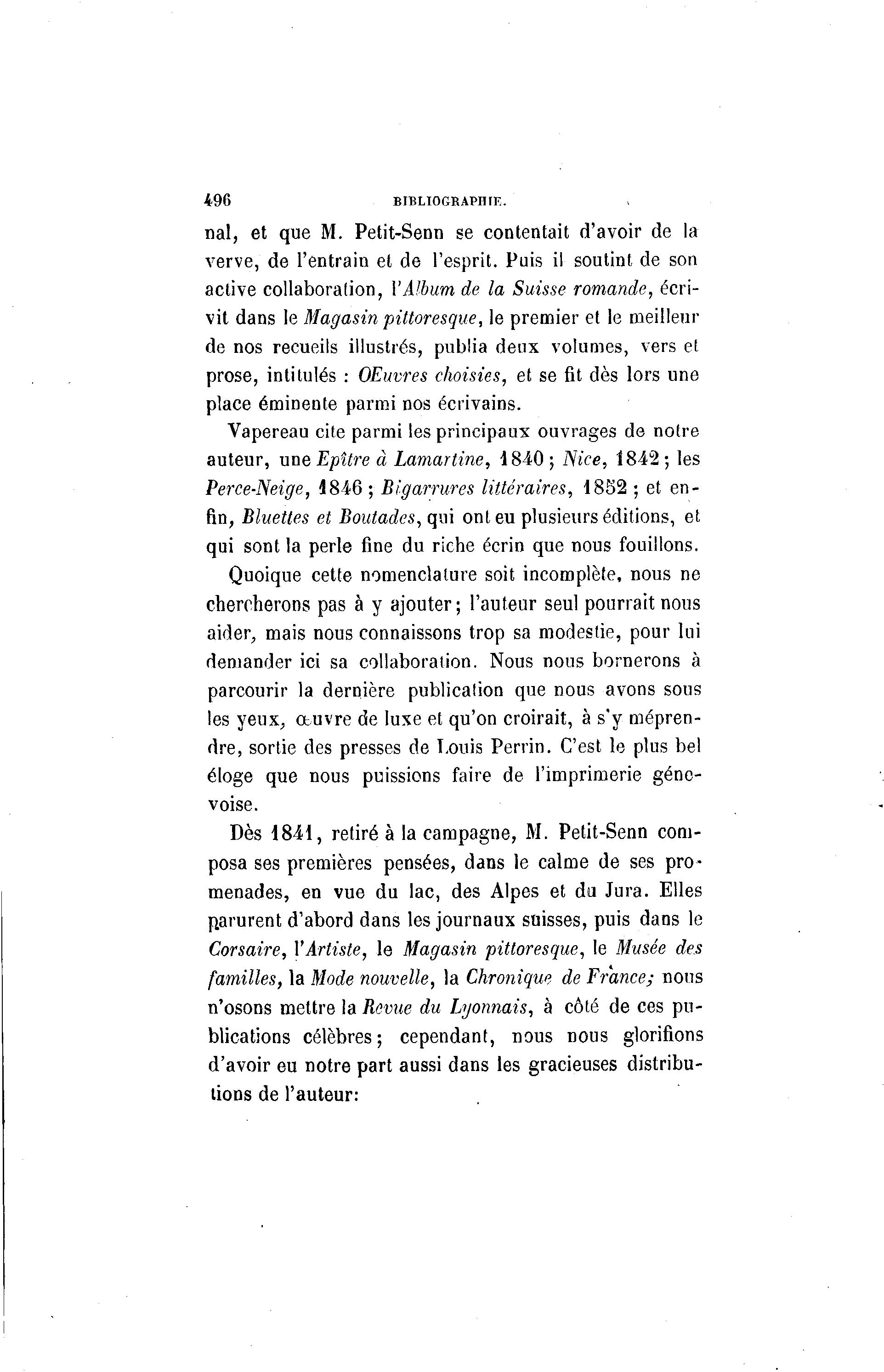496 BIBLIOGRAPHIE. nal, et que M. Petit-Senn se contentait d'avoir de la verve, de l'entrain et de l'esprit. Puis il soutint de son active collaboration, Y Album de la Suisse romande, écri- vit dans le Magasin pittoresque, le premier et le meilleur de nos recueils illustrés, publia deux volumes, vers et prose, intitulés : OEuvres choisies, et se fit dès lors une place éminente parmi nos écrivains. Vapereau cite parmi les principaux ouvrages de notre auteur, une Epître à Lamartine, 1840 ; Nice, 1842 ; les Perce-Neige, 1846 ; Bigarrures littéraires, 1852 ; et en- fin, Bluettes et Boutades, qui ont eu plusieurs éditions, et qui sont la perle fine du riche écrin que nous fouillons. Quoique cette nomenclature soit incomplète, nous ne chercherons pas à y ajouter ; l'auteur seul pourrait nous aider, mais nous connaissons trop sa modestie, pour lui demander ici sa collaboration. Nous nous bornerons à parcourir la dernière publication que nous avons sous les yeux, œuvre de luxe et qu'on croirait, à s'y mépren- dre, sortie des presses de Louis Perrin. C'est le plus bel éloge que nous puissions faire de l'imprimerie gene- voise. Dès 1841, retiré à la campagne, M. Petit-Senn com- posa ses premières pensées, dans le calme de ses pro- menades, en vue du lac, des Alpes et du Jura. Elles parurent d'abord dans les journaux suisses, puis dans le Corsaire, Y Artiste, le Magasin pittoresque, le Musée des familles, la Mode nouvelle, la Chronique de France; nous n'osons mettre la Revue du Lyonnais, à côté de ces pu- blications célèbres ; cependant, nous nous glorifions d'avoir eu notre part aussi dans les gracieuses distribu- tions de l'auteur: