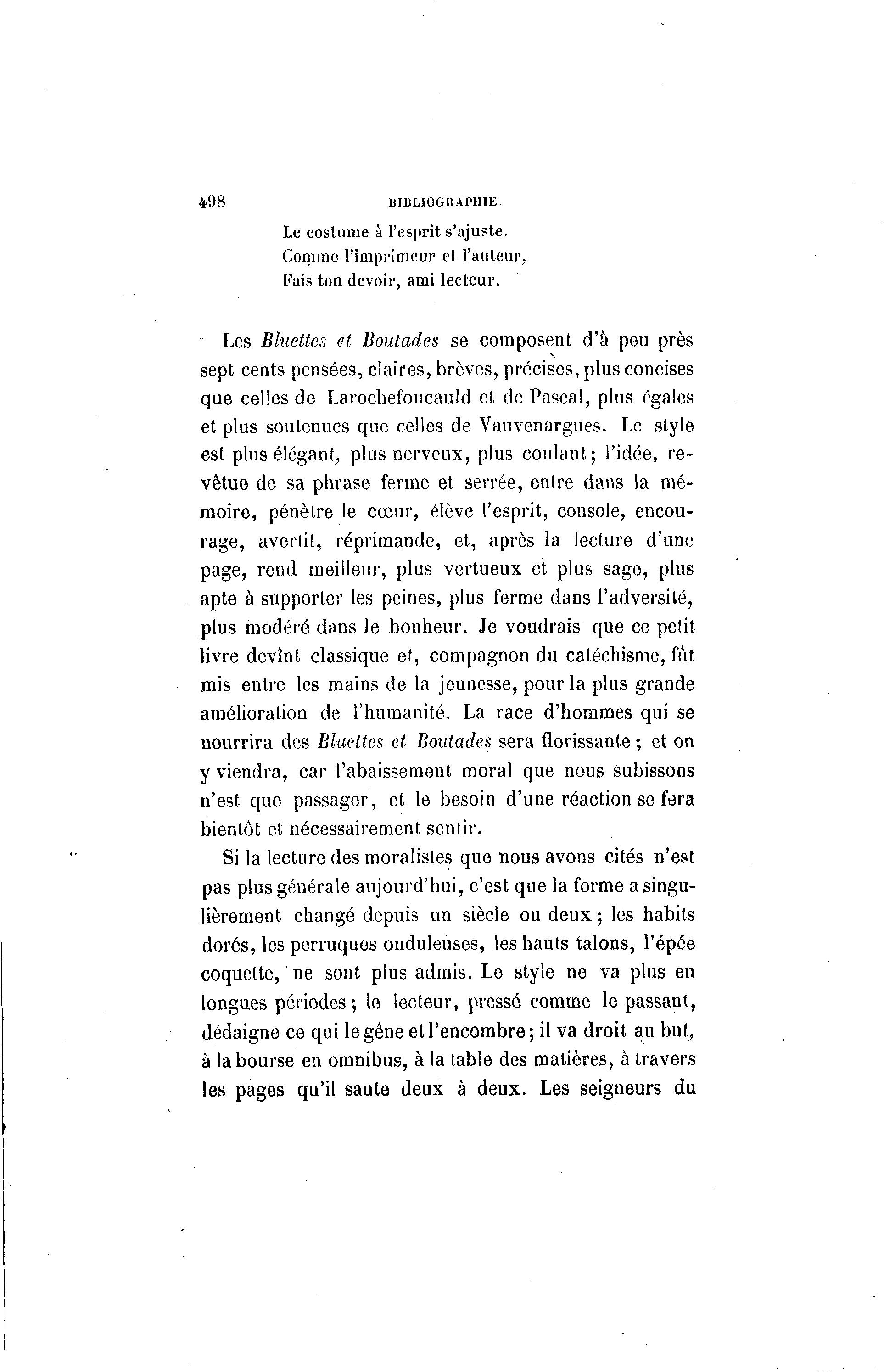 498 BIBLIOGRAPHIE. Le costume à l'esprit s'ajuste. Comme l'imprimeur et l'auteur, Fais ton devoir, ami lecteur. ' Les Muettes et Boutades se composent d'à peu près sept cents pensées, claires, brèves, précises, plus concises que celles de Larochefoucauld et de Pascal, plus égales et plus soutenues que celles de Vauvenargues. Le style est plus élégant, plus nerveux, plus coulant; l'idée, re- vêtue de sa phrase ferme et, serrée, entre dans la mé- moire, pénètre le cœur, élève l'esprit, console, encou- rage, avertit, réprimande, et, après la lecture d'une page, rend meilleur, plus vertueux et plus sage, plus apte à supporter les peines, plus ferme dans l'adversité, plus modéré dans le bonheur. Je voudrais que ce petit livre devînt classique et, compagnon du catéchisme, fût. mis entre les mains de la jeunesse, pour la plus grande amélioration de l'humanité. La race d'hommes qui se nourrira des Muettes et Boutades sera florissante ; et on y viendra, car l'abaissement moral que nous subissons n'est que passager, et le besoin d'une réaction se fera bientôt et nécessairement sentir. Si la lecture des moralistes que nous avons cités n'est pas plus générale aujourd'hui, c'est que la forme a singu- lièrement changé depuis un siècle ou deux ; les habits dorés, les perruques onduleuses, les hauts talons, l'épée coquette, ne sont plus admis. Le style ne va plus en longues périodes ; le lecteur, pressé comme le passant, dédaigne ce qui le gêne et l'encombre; il va droit au but, à la bourse en omnibus, à la table des matières, à travers les pages qu'il saute deux à deux. Les seigneurs du
